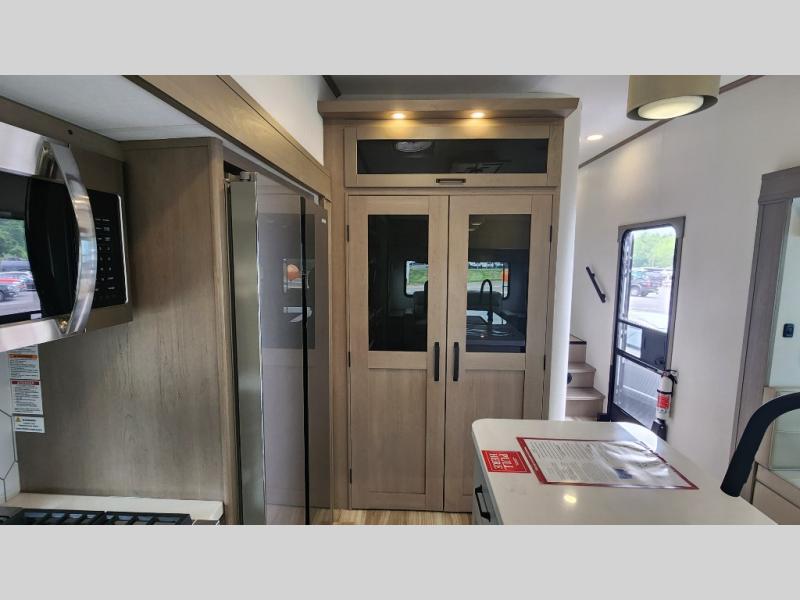 Kitchen island, 16 cu. ft. 12V fridge, microwave, oven, solid-surface counters, and walk-in pantry. -