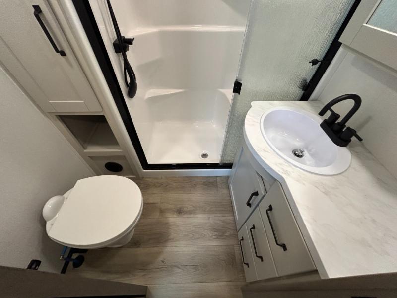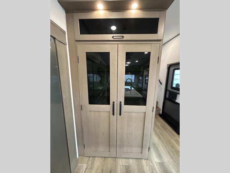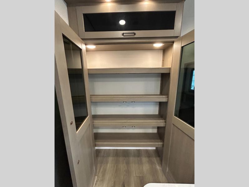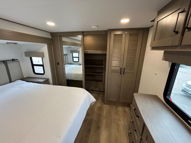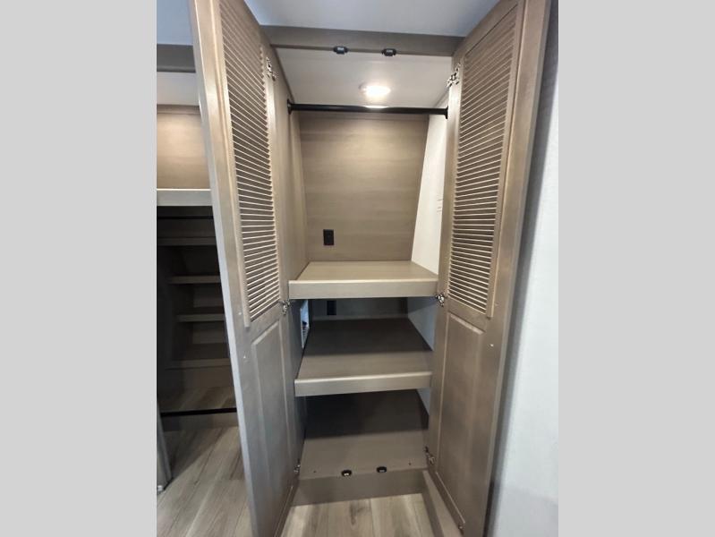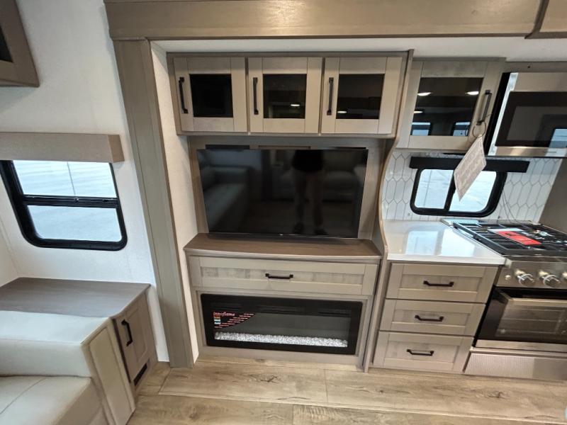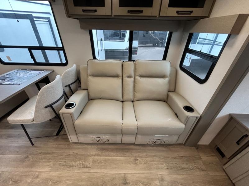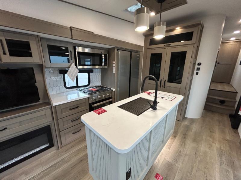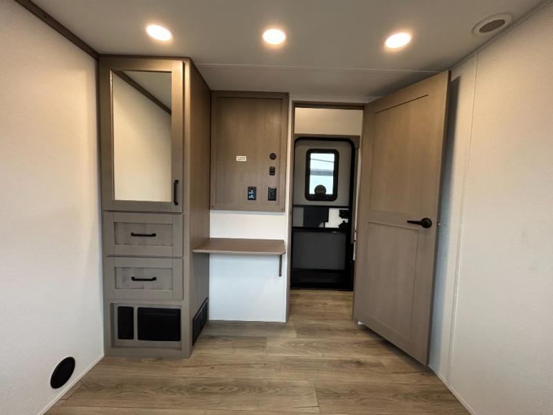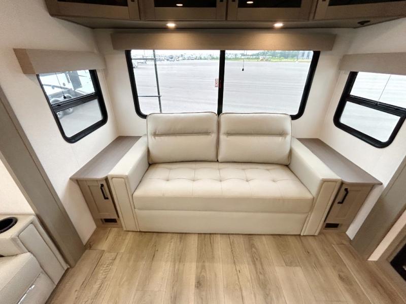 Travel to see new state parks, RV resorts or your family in other states as you tow this fifth wheel to each destination! You will enjoy comfort and convenience, plus a place to work, and be able to offer extra sleeping space for friends and family when they visit. The middle extra room provides a tri-fold sofa slide, a desk, a wardrobe, plus a 64" x 88" upper bed loft area with access from the hallway. The full bathroom will keep everyone refreshed, and the front bedroom allows you to sleep on a queen bed slide or choose the king option. And you will love the front wardrobe, the dresser, and the option to add a washer/dryer. The main living and kitchen area provides plenty of seating from the rear tri-fold sofa, the booth dinette or swivel dinette option, and the theater seats with cupholders. And the kitchen island, appliances, and large pantry allow you to take everything you need with you.