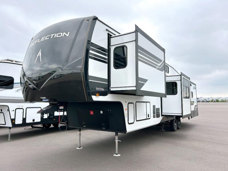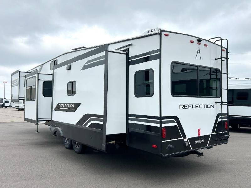 With any Reflection fifth wheel by Grand Design, you will have a solar panel for off-grid camping and a 60 amp charge controller and inverter prep, a Universal All-In-One docking station, unobstructed pass-through storage, and Goodyear Endurance tires. Each is constructed of gel coat exterior sidewalls, residential 5" truss rafters, walk-on roof decking, a fiberglass and radiant foil roof and front cap insulation plus laminated aluminum framed side walls, roof and end walls in slide rooms. Head inside to enjoy residential hardwood cabinet doors, premium Congoleum flooring, a spacious shower with a glass door, and many more comforts!