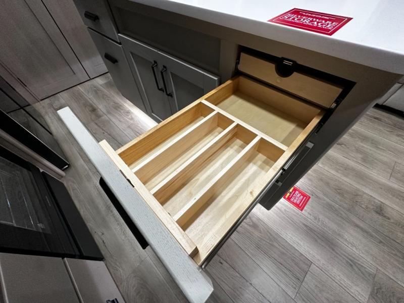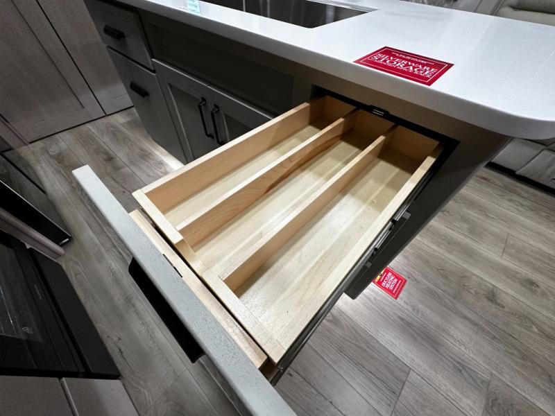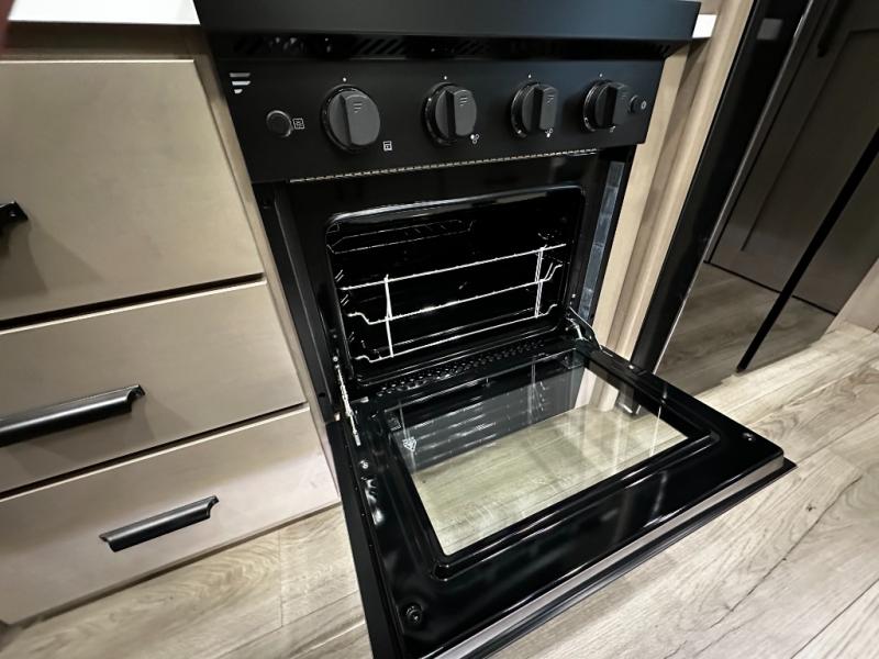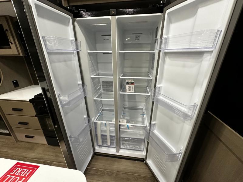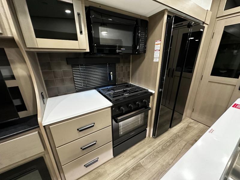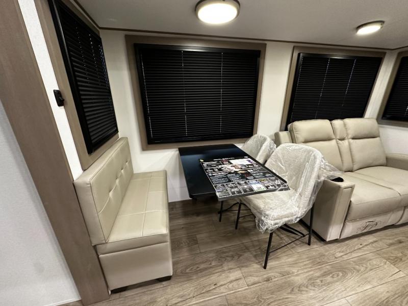 The chef-inspired kitchen is designed for both convenience and functionality, featuring solid-surface countertops, a three-burner cooktop, microwave, residential refrigerator, and ample cabinetry for storage. The adjacent dinette provides a versatile area for dining, games, or work, ensuring the Reflection 367BHS meets all your travel needs.