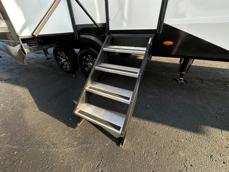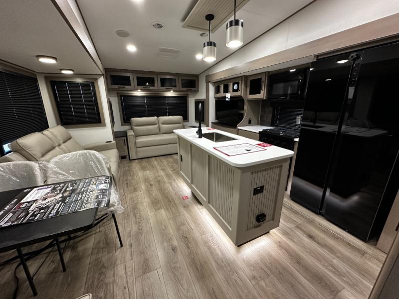The rear bunkhouse layout makes the 367BHS perfect for families or guests, offering multiple sleeping areas, privacy, and convenient storage solutions. The main living area features theater seating, a tri-fold sofa, and an entertainment center with a large TV, creating a welcoming space for relaxation, movie nights, or social gatherings. Large panoramic windows fill the interior with natural light, enhancing the open and airy feel while keeping you connected to the outdoors.