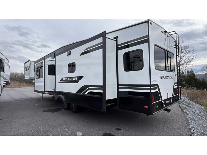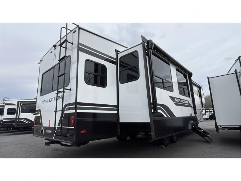 With any Reflection fifth wheel by Grand Design, you will have a solar panel for off-grid camping and a 60 amp charge controller and inverter prep, a Universal All-In-One docking station, unobstructed pass-through storage, and Goodyear Endurance tires. Each is constructed of gel coat exterior sidewalls, residential 5" truss rafters, walk-on roof decking, a fiberglass and radiant foil roof and front cap insulation plus laminated aluminum framed side walls, roof and end walls in slide rooms. Head inside to enjoy residential hardwood cabinet doors, premium Congoleum flooring, a spacious shower with a glass door, and many more comforts!