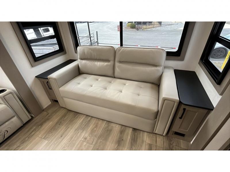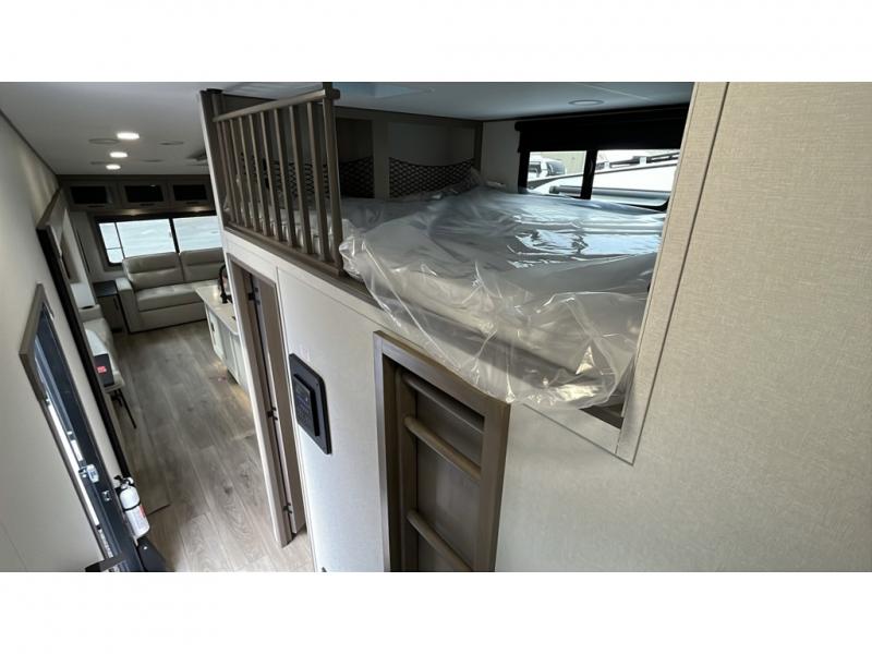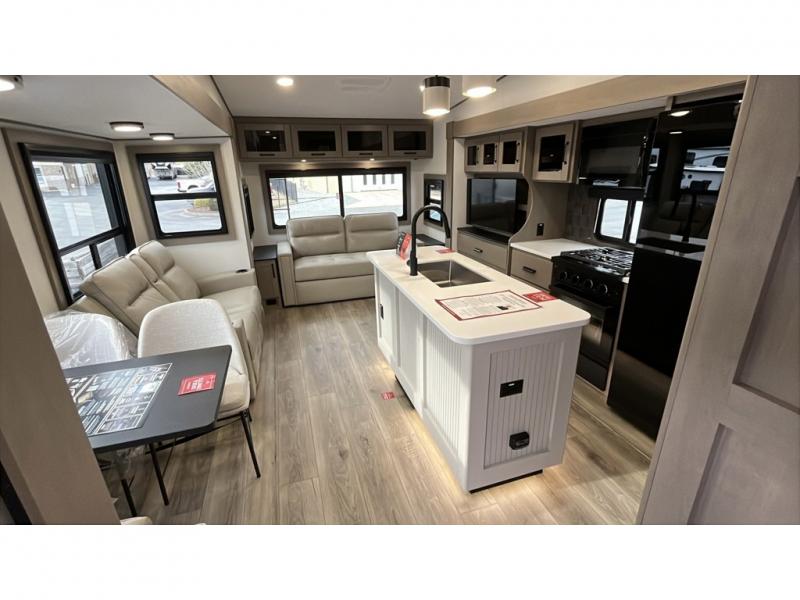 Travel to see new state parks, RV resorts or your family in other states as you tow this fifth wheel to each destination! You will enjoy comfort and convenience, plus a place to work, and be able to offer extra sleeping space for friends and family when they visit. The middle extra room provides a tri-fold sofa slide, a desk, a wardrobe, plus a 64" x 88" upper bed loft area with access from the hallway. The full bathroom will keep everyone refreshed, and the front bedroom allows you to sleep on a queen bed slide or choose the king option. And you will love the front wardrobe, the dresser, and the option to add a washer/dryer. The main living and kitchen area provides plenty of seating from the rear tri-fold sofa, the booth dinette or swivel dinette option, and the theater seats with cupholders. And the kitchen island, appliances, and large pantry allow you to take everything you need with you.