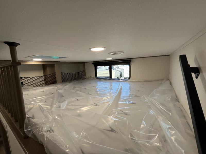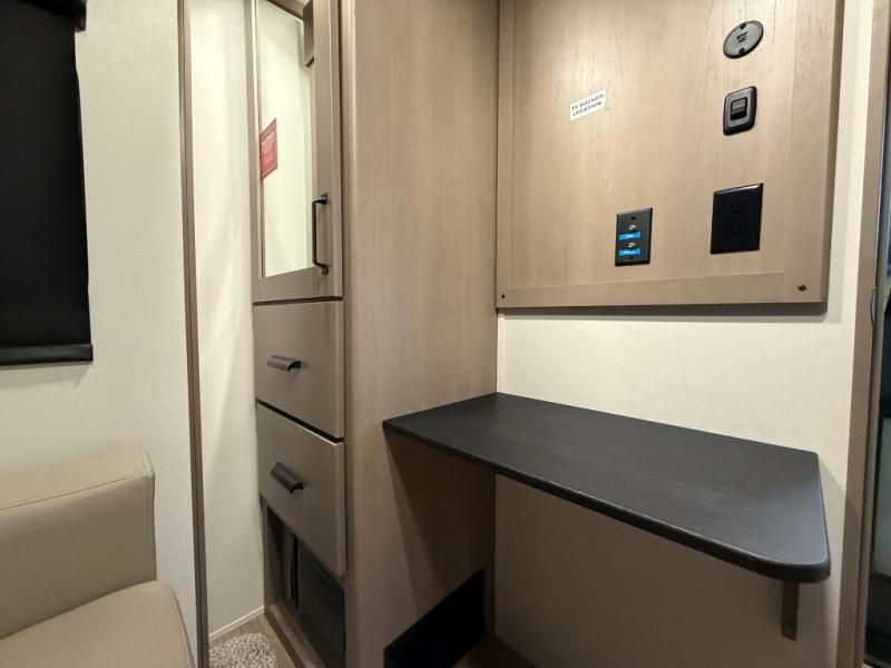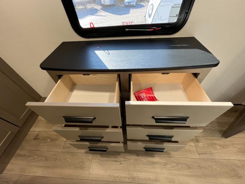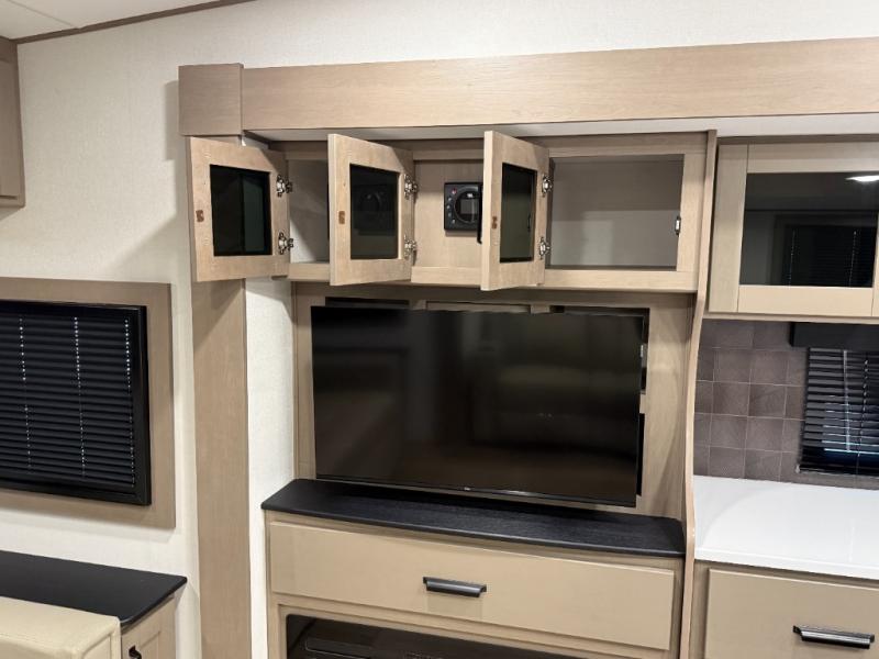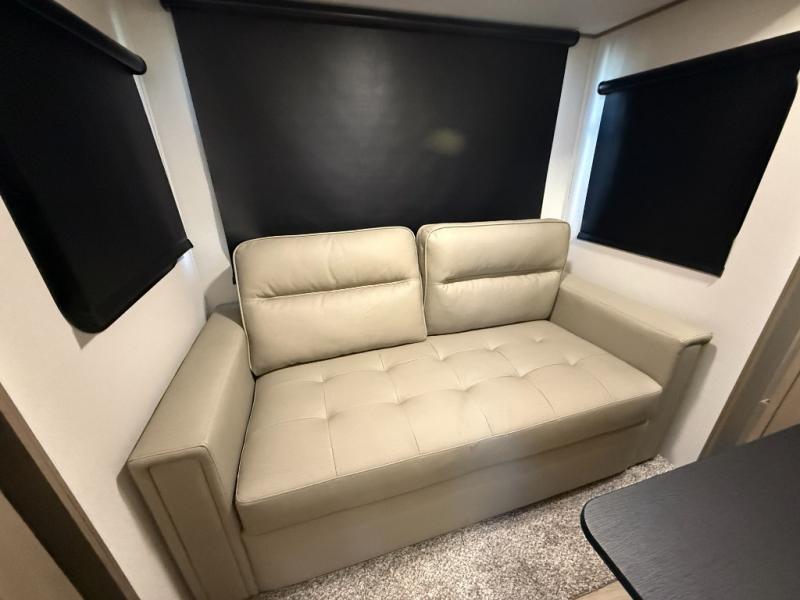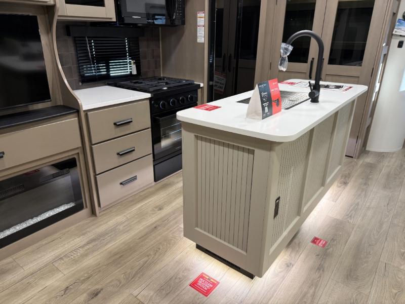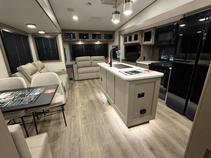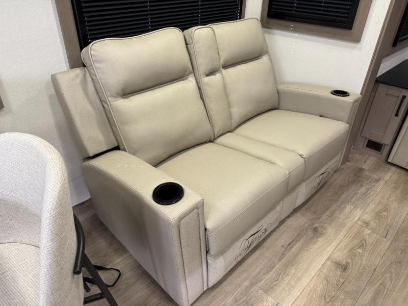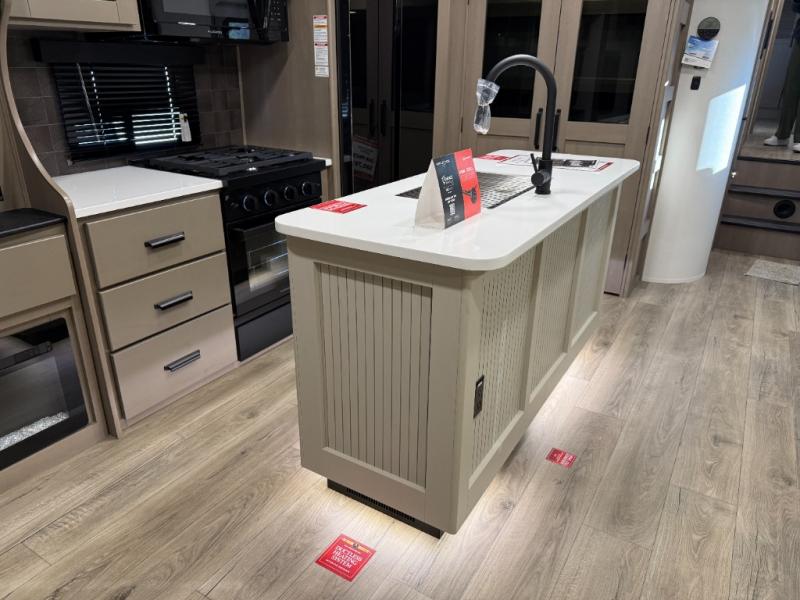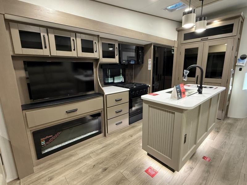 Travel to see new state parks, RV resorts or your family in other states as you tow this fifth wheel to each destination! You will enjoy comfort and convenience, plus a place to work, and be able to offer extra sleeping space for friends and family when they visit. The middle extra room provides a tri-fold sofa slide, a desk, a wardrobe, plus a 64" x 88" upper bed loft area with access from the hallway. The full bathroom will keep everyone refreshed, and the front bedroom allows you to sleep on a queen bed slide or choose the king option. And you will love the front wardrobe, the dresser, and the option to add a washer/dryer. The main living and kitchen area provides plenty of seating from the rear tri-fold sofa, the booth dinette or swivel dinette option, and the theater seats with cupholders. And the kitchen island, appliances, and large pantry allow you to take everything you need with you.