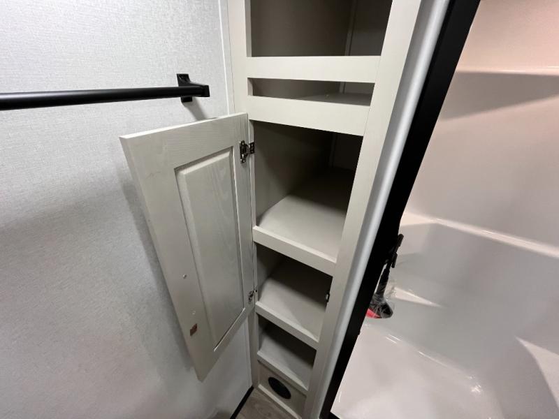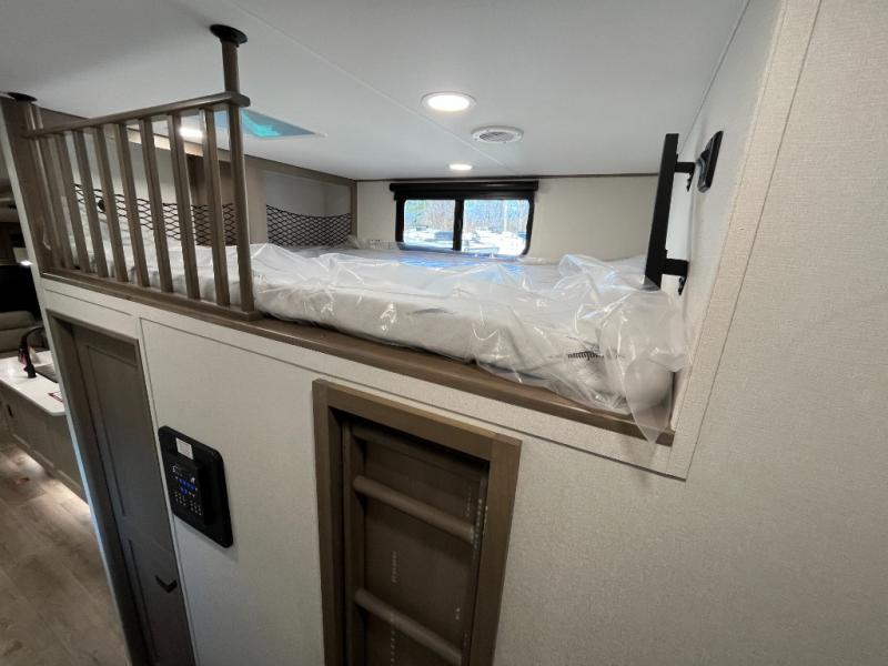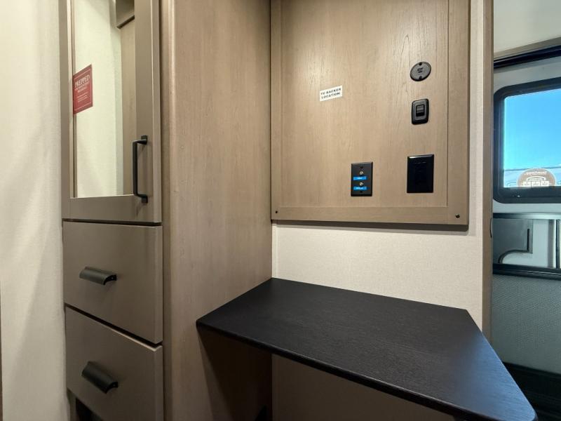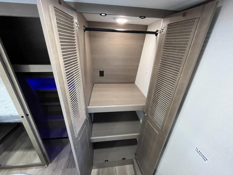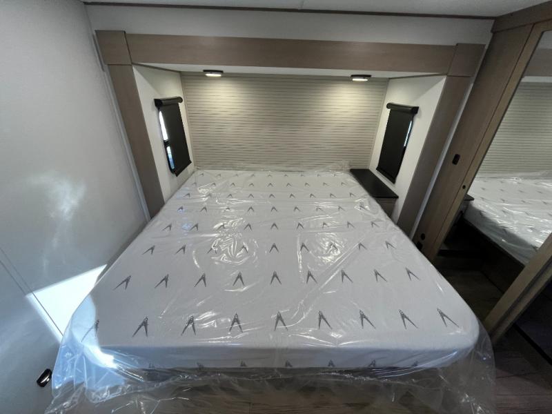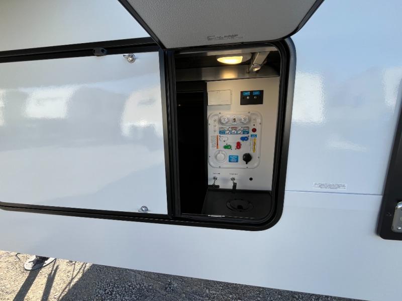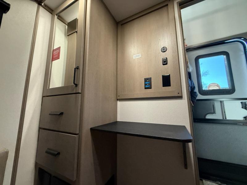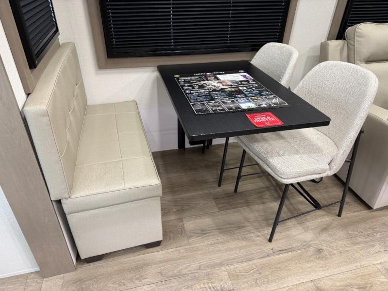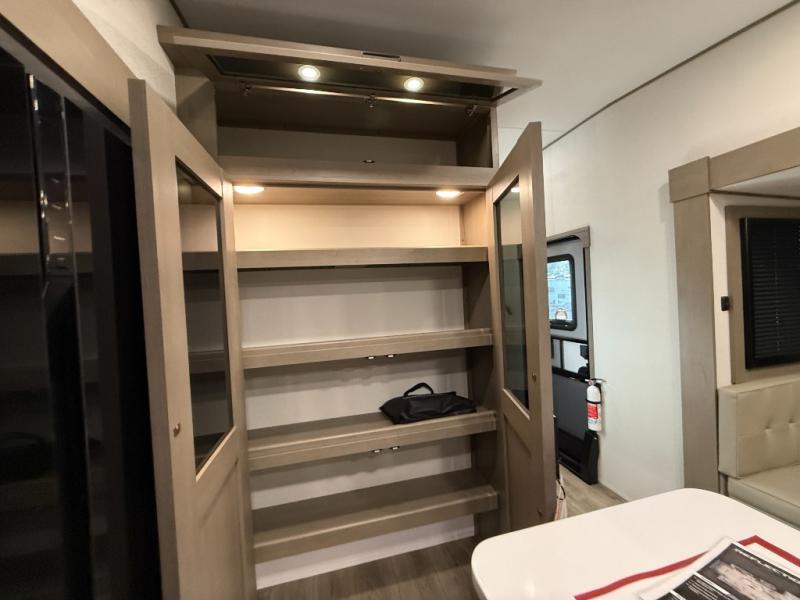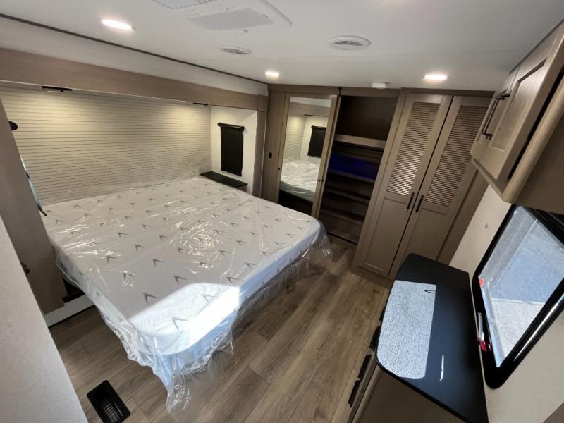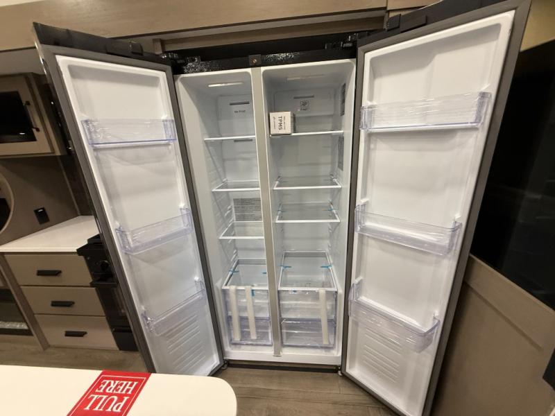 Travel to see new state parks, RV resorts or your family in other states as you tow this fifth wheel to each destination! You will enjoy comfort and convenience, plus a place to work, and be able to offer extra sleeping space for friends and family when they visit. The middle extra room provides a tri-fold sofa slide, a desk, a wardrobe, plus a 64" x 88" upper bed loft area with access from the hallway. The full bathroom will keep everyone refreshed, and the front bedroom allows you to sleep on a queen bed slide or choose the king option. And you will love the front wardrobe, the dresser, and the option to add a washer/dryer. The main living and kitchen area provides plenty of seating from the rear tri-fold sofa, the booth dinette or swivel dinette option, and the theater seats with cupholders. And the kitchen island, appliances, and large pantry allow you to take everything you need with you.