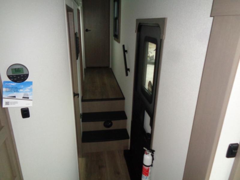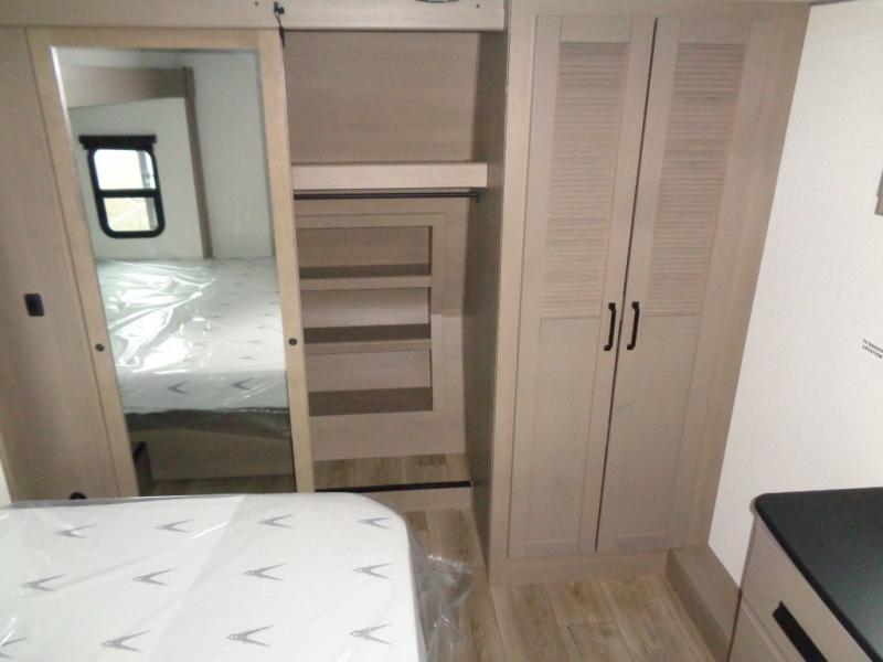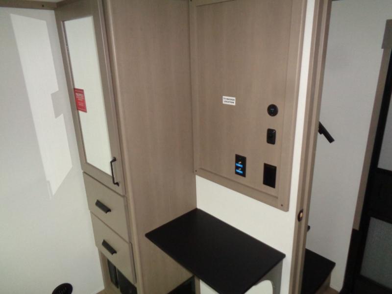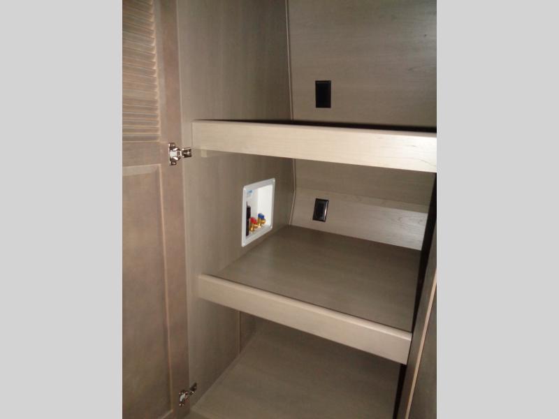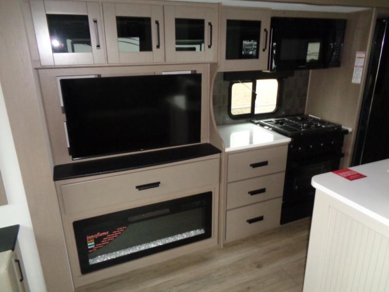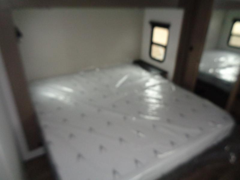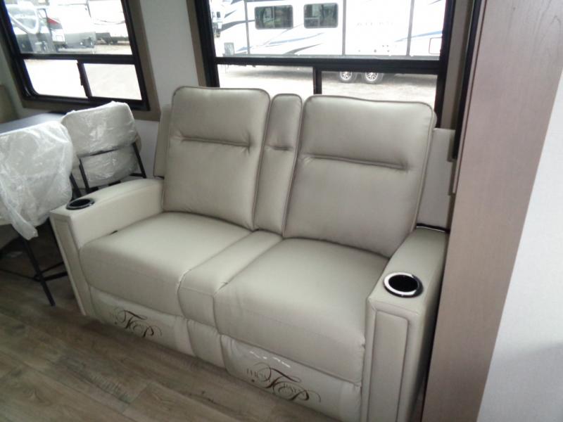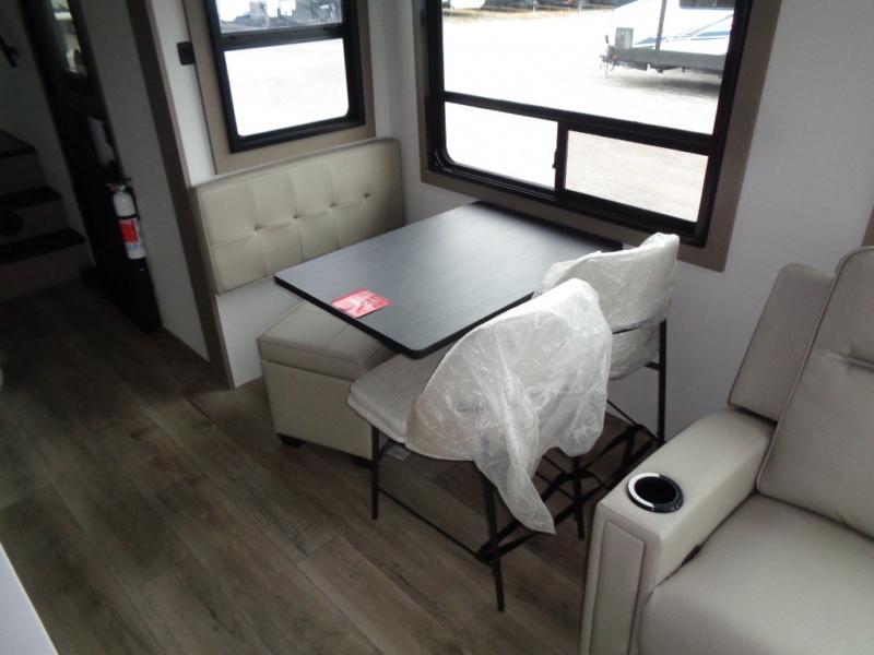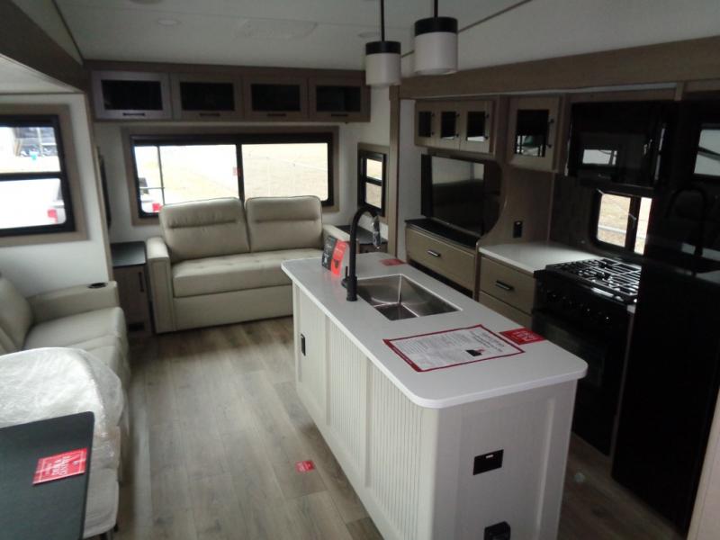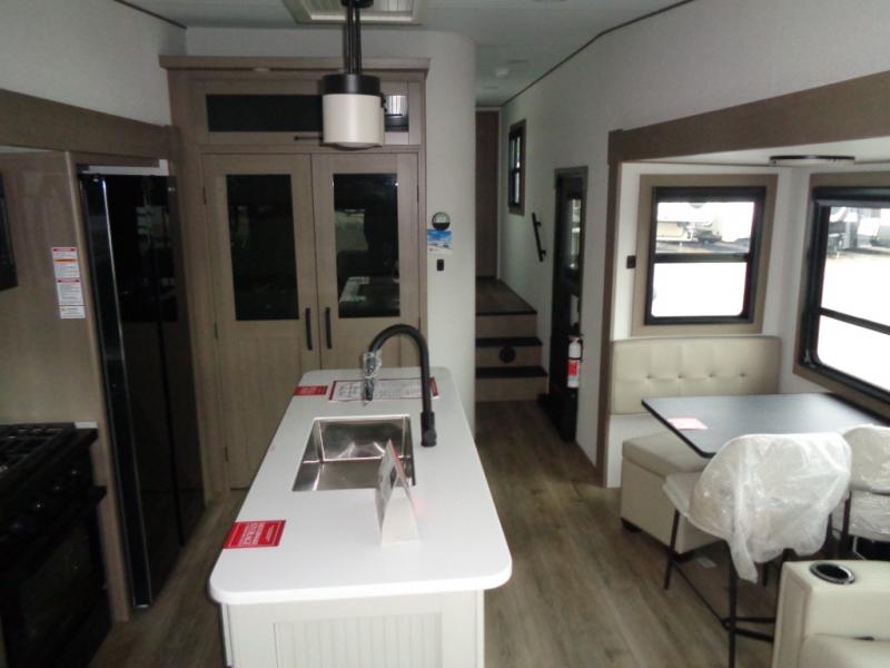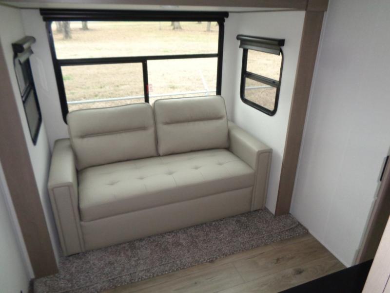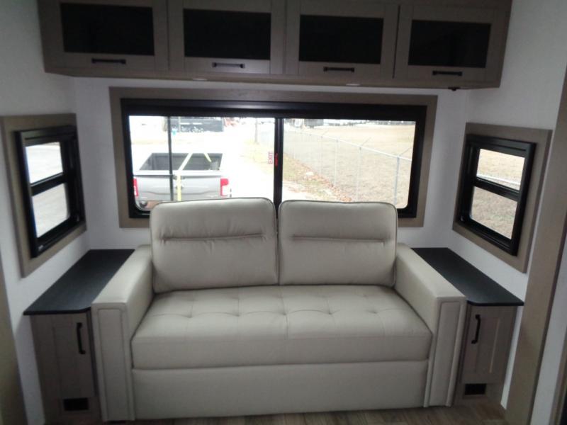 Travel to see new state parks, RV resorts or your family in other states as you tow this fifth wheel to each destination! You will enjoy comfort and convenience, plus a place to work, and be able to offer extra sleeping space for friends and family when they visit. The middle extra room provides a tri-fold sofa slide, a desk, a wardrobe, plus a 64" x 88" upper bed loft area with access from the hallway. The full bathroom will keep everyone refreshed, and the front bedroom allows you to sleep on a queen bed slide or choose the king option. And you will love the front wardrobe, the dresser, and the option to add a washer/dryer. The main living and kitchen area provides plenty of seating from the rear tri-fold sofa, the booth dinette or swivel dinette option, and the theater seats with cupholders. And the kitchen island, appliances, and large pantry allow you to take everything you need with you.