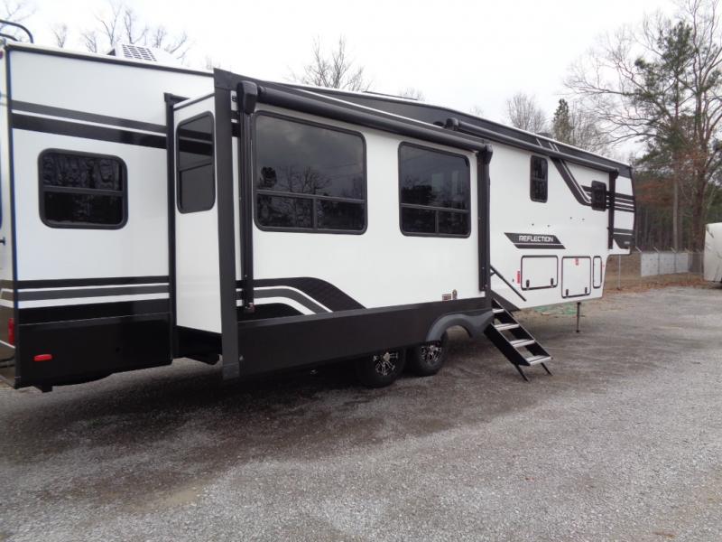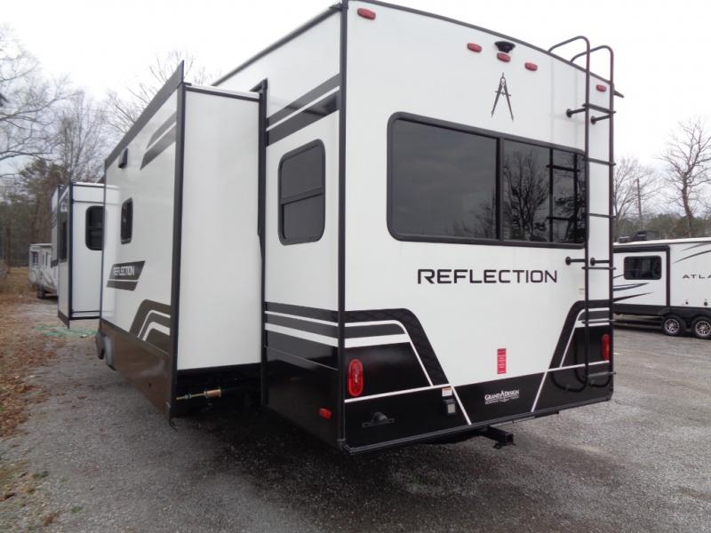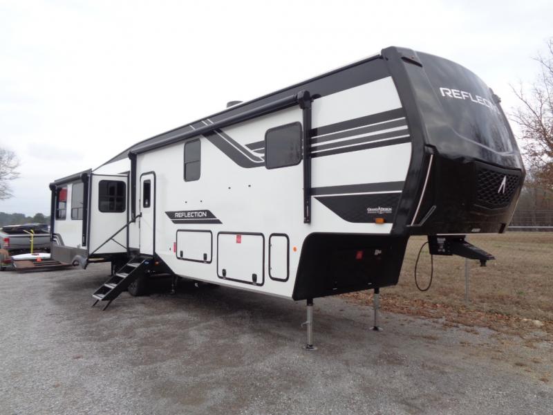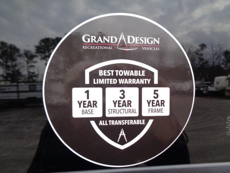 With any Reflection fifth wheel by Grand Design, you will have a solar panel for off-grid camping and a 60 amp charge controller and inverter prep, a Universal All-In-One docking station, unobstructed pass-through storage, and Goodyear Endurance tires. Each is constructed of gel coat exterior sidewalls, residential 5" truss rafters, walk-on roof decking, a fiberglass and radiant foil roof and front cap insulation plus laminated aluminum framed side walls, roof and end walls in slide rooms. Head inside to enjoy residential hardwood cabinet doors, premium Congoleum flooring, a spacious shower with a glass door, and many more comforts!