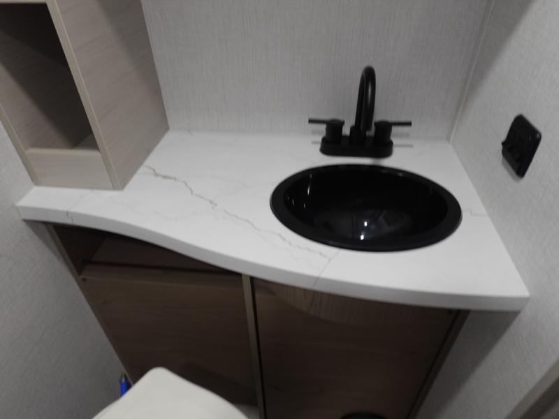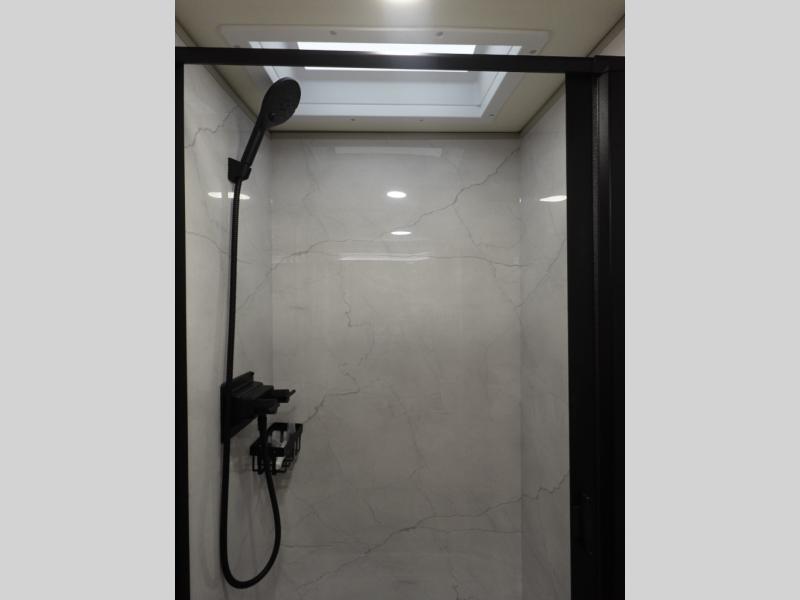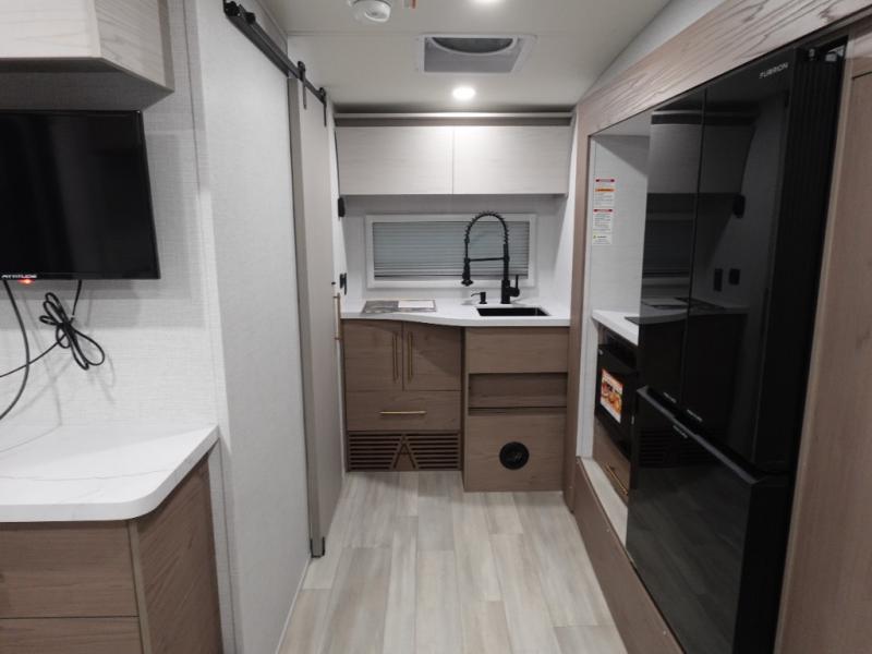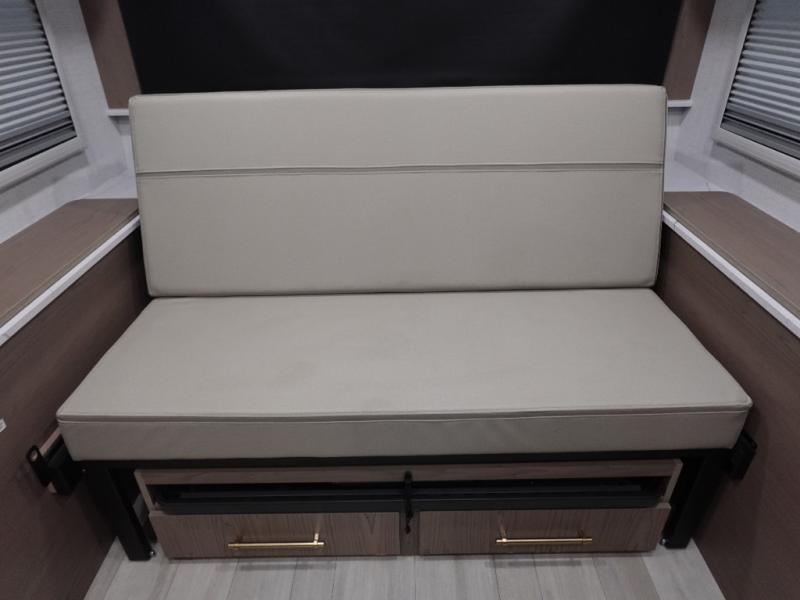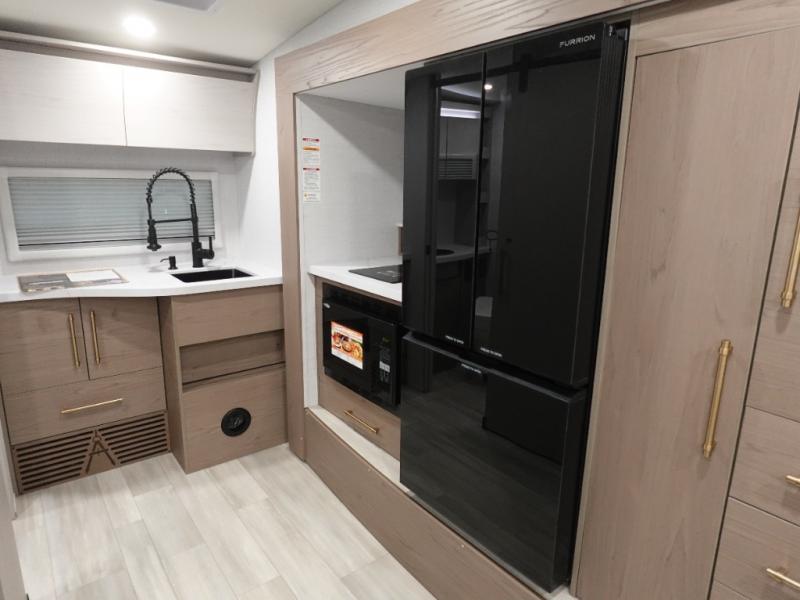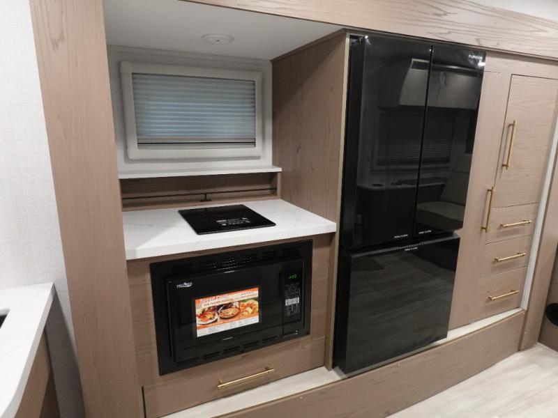 You'll love camping in this spacious and versatile travel trailer. There is a 60" x 76" flip bed up front that you can fold away during the day to relax on the sofa. An induction cooktop and convection microwave within the slide out will let you make meals each day, and you'll also find a wardrobe and pantry here for added storage. The rear corner kitchen includes ample counter space and overhead storage for dishes, spices and more. After a day outdoors, you can clean up in the rear corner bath, complete with a residential walk-in shower, bath skylight, 12V power vent fan plus more!
