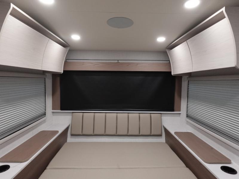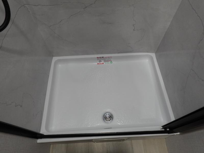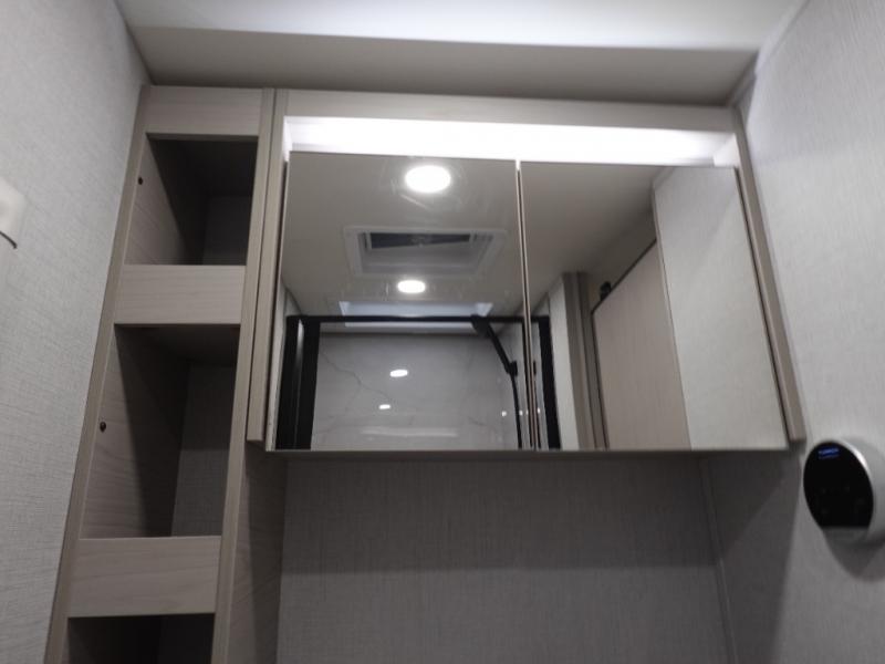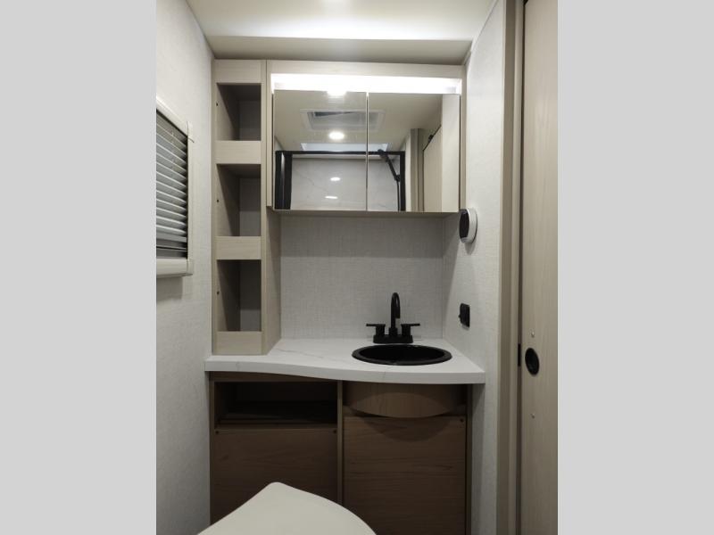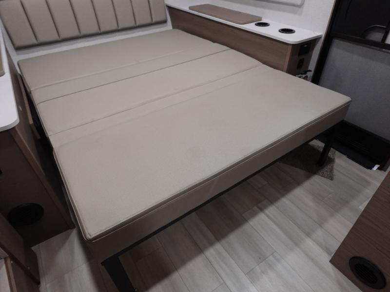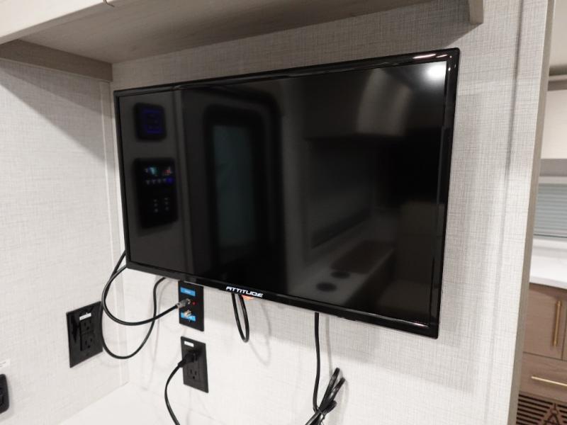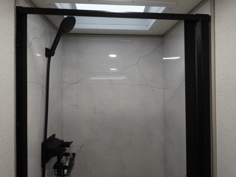 You'll love camping in this spacious and versatile travel trailer. There is a 60" x 76" flip bed up front that you can fold away during the day to relax on the sofa. An induction cooktop and convection microwave within the slide out will let you make meals each day, and you'll also find a wardrobe and pantry here for added storage. The rear corner kitchen includes ample counter space and overhead storage for dishes, spices and more. After a day outdoors, you can clean up in the rear corner bath, complete with a residential walk-in shower, bath skylight, 12V power vent fan plus more!