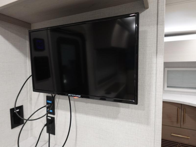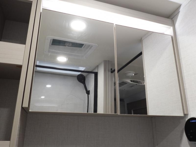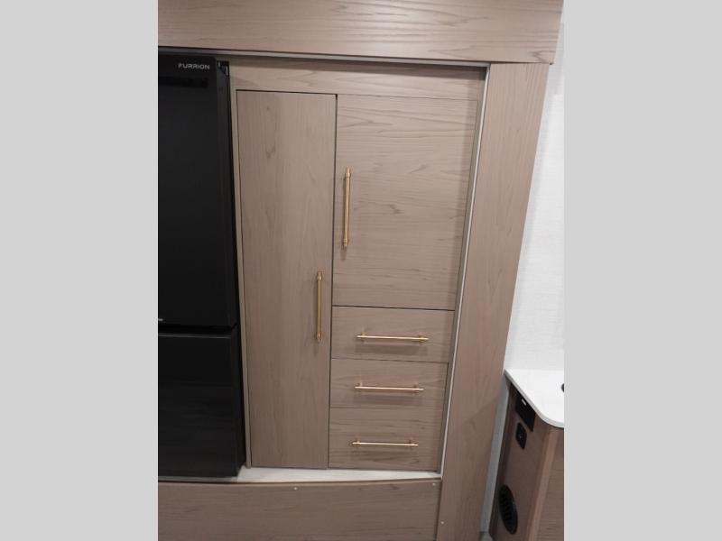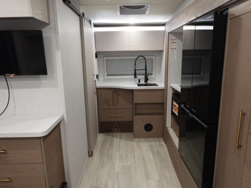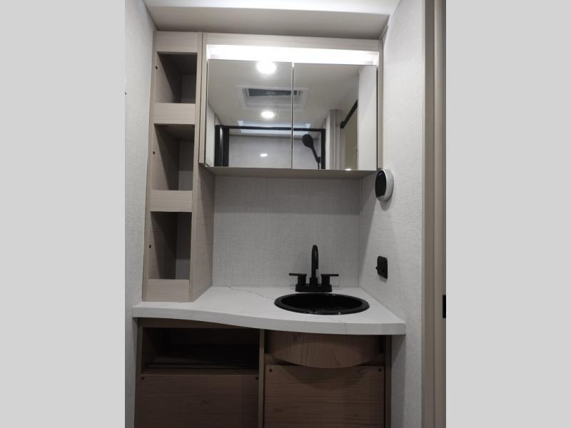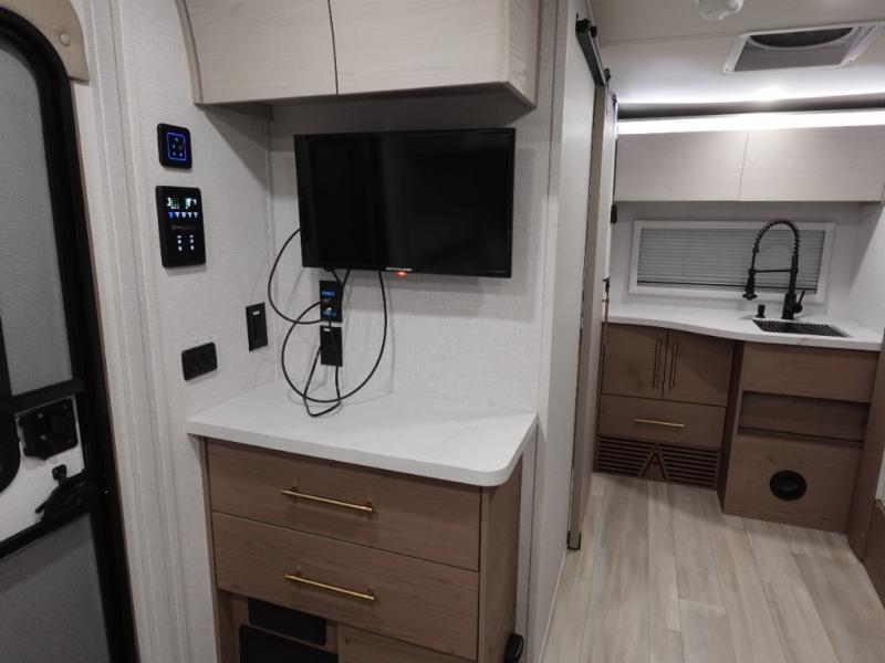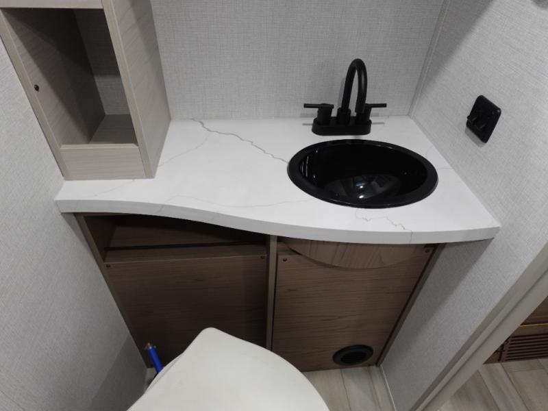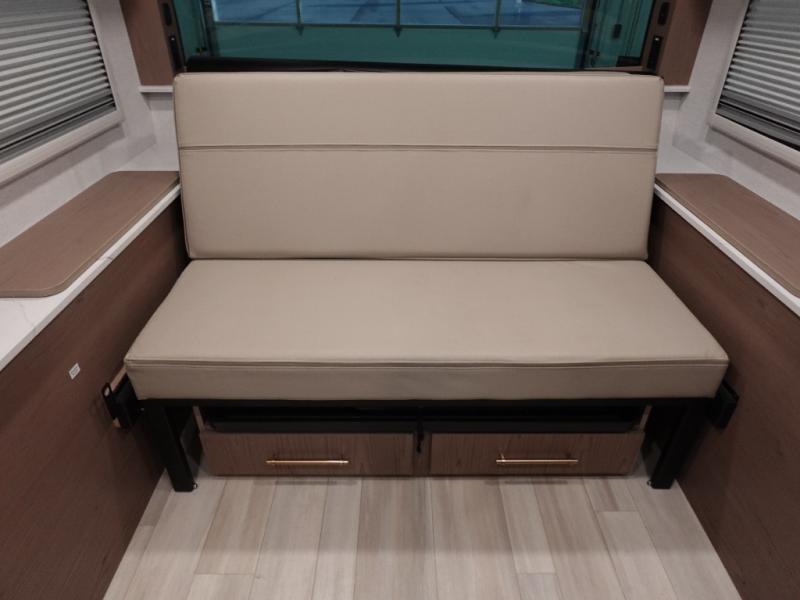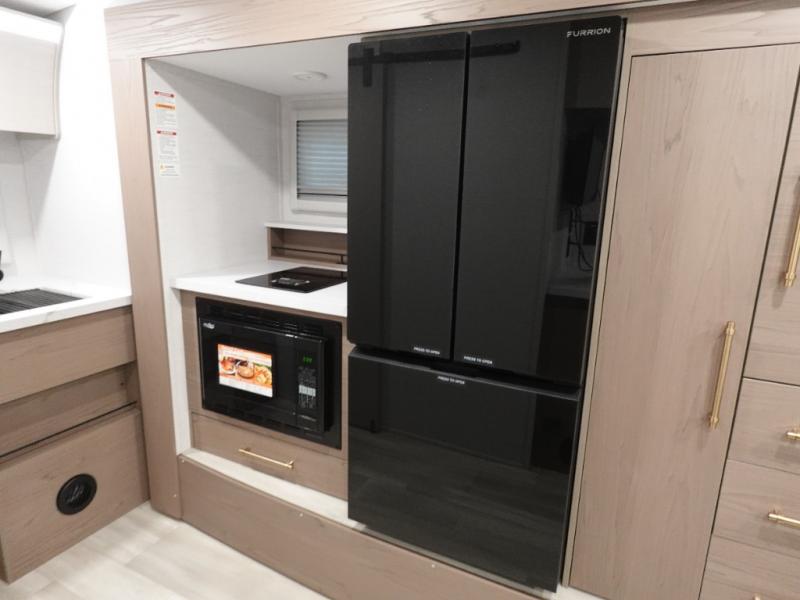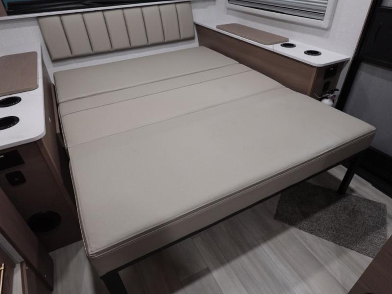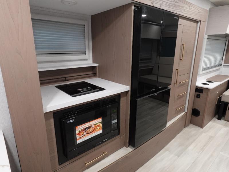 You'll love camping in this spacious and versatile travel trailer. There is a 60" x 76" flip bed up front that you can fold away during the day to relax on the sofa. An induction cooktop and convection microwave within the slide out will let you make meals each day, and you'll also find a wardrobe and pantry here for added storage. The rear corner kitchen includes ample counter space and overhead storage for dishes, spices and more. After a day outdoors, you can clean up in the rear corner bath, complete with a residential walk-in shower, bath skylight, 12V power vent fan plus more!