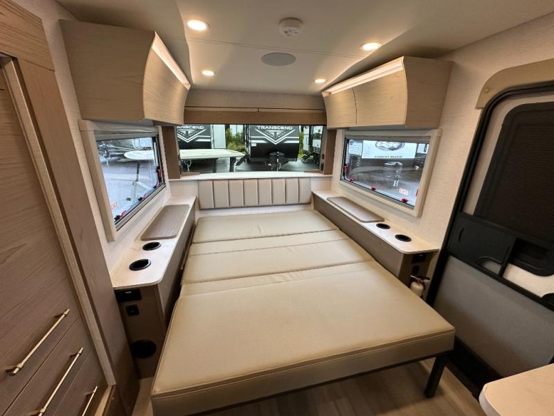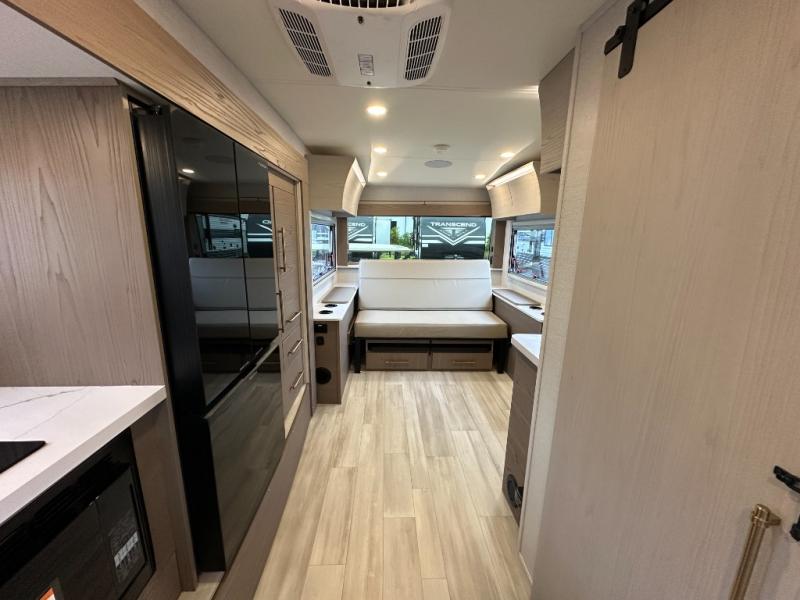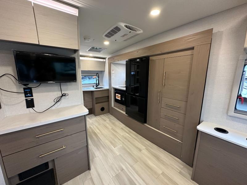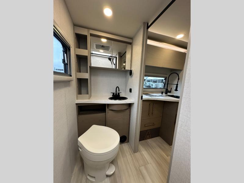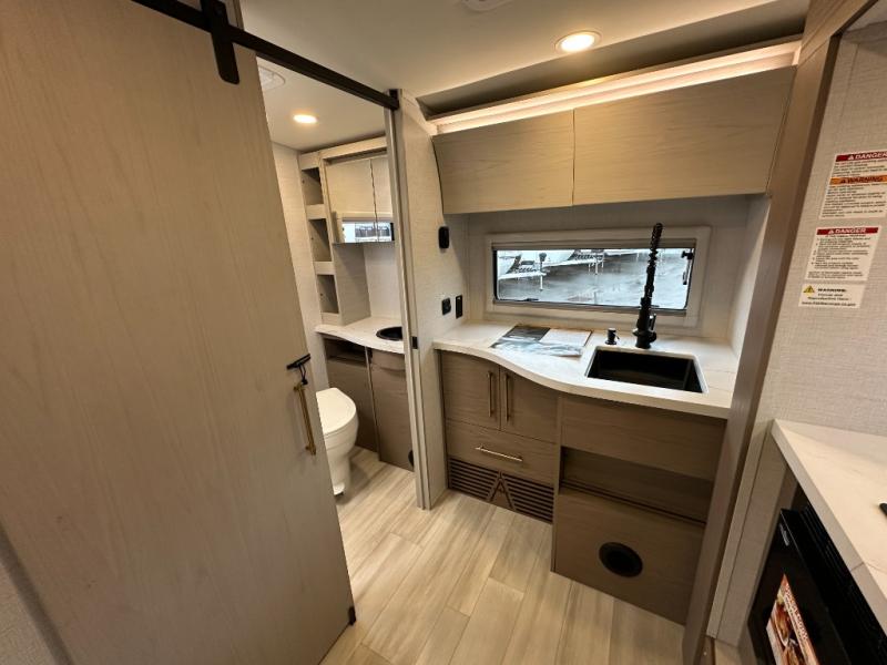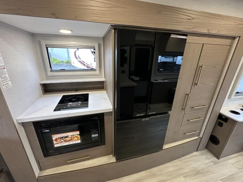 You'll love camping in this spacious and versatile travel trailer. There is a 60" x 76" flip bed up front that you can fold away during the day to relax on the sofa. An induction cooktop and convection microwave within the slide out will let you make meals each day, and you'll also find a wardrobe and pantry here for added storage. The rear corner kitchen includes ample counter space and overhead storage for dishes, spices and more. After a day outdoors, you can clean up in the rear corner bath, complete with a residential walk-in shower, bath skylight, 12V power vent fan plus more!