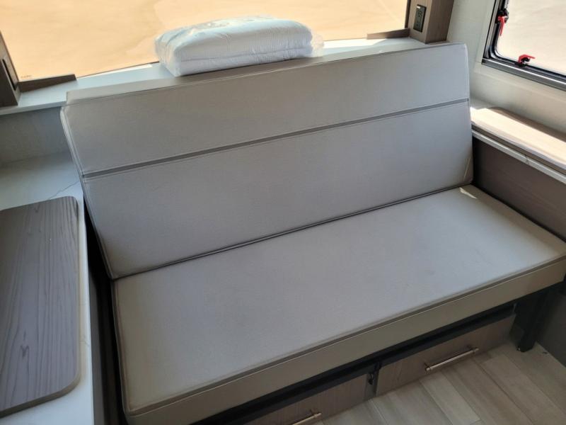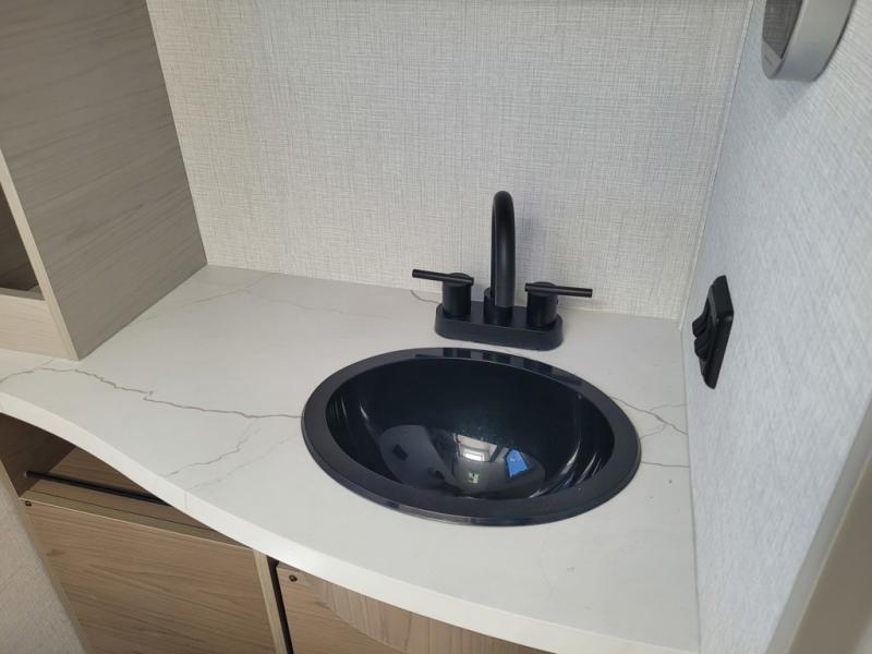 You'll love camping in this spacious and versatile travel trailer. There is a 60" x 76" flip bed up front that you can fold away during the day to relax on the sofa. An induction cooktop and convection microwave within the slide out will let you make meals each day, and you'll also find a wardrobe and pantry here for added storage. The rear corner kitchen includes ample counter space and overhead storage for dishes, spices and more. After a day outdoors, you can clean up in the rear corner bath, complete with a residential walk-in shower, bath skylight, 12V power vent fan plus more!
