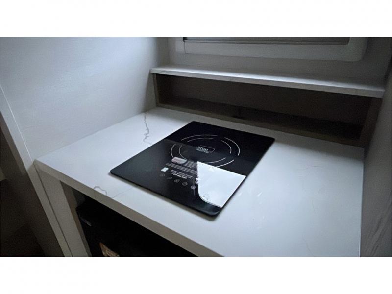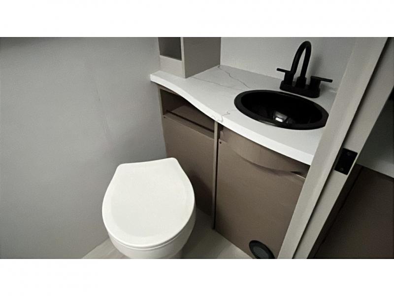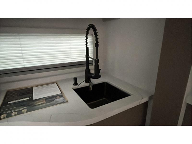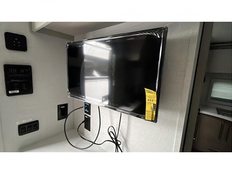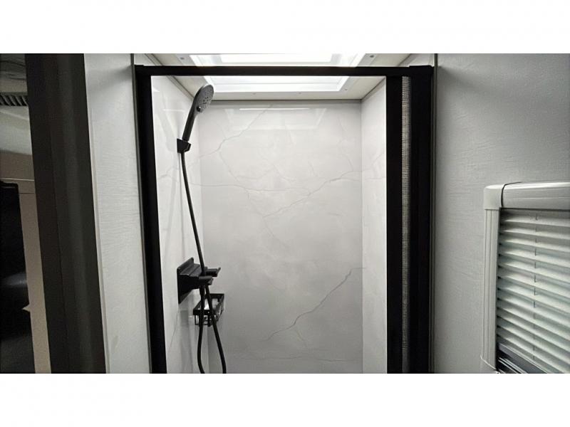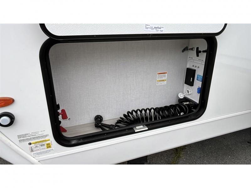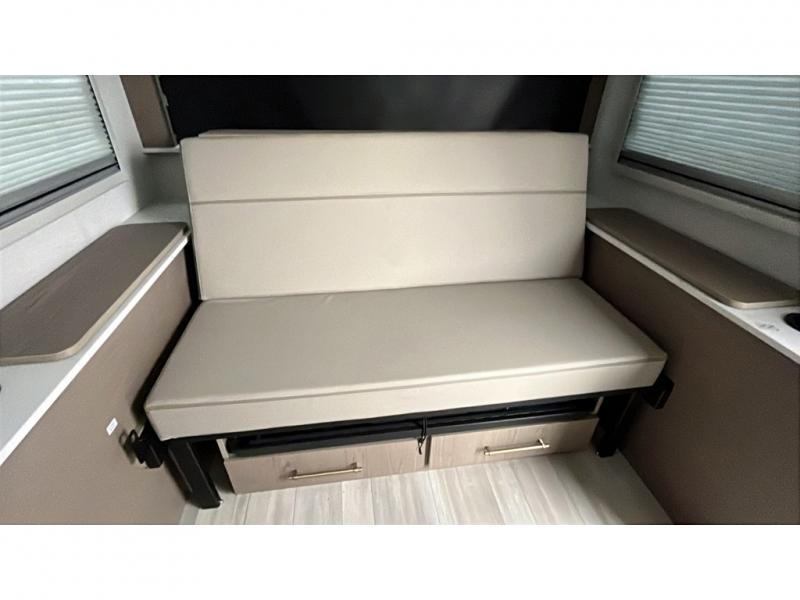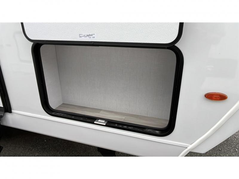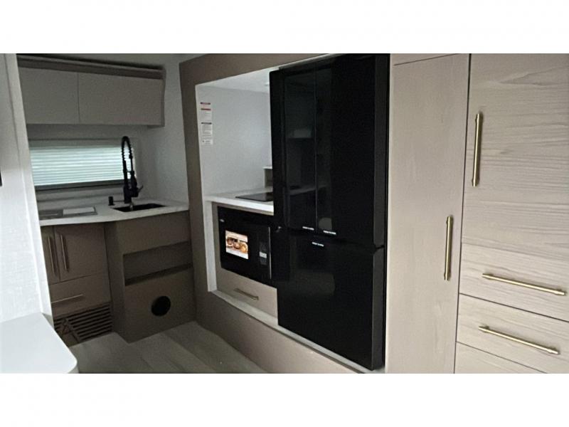 You'll love camping in this spacious and versatile travel trailer. There is a 60" x 76" flip bed up front that you can fold away during the day to relax on the sofa. An induction cooktop and convection microwave within the slide out will let you make meals each day, and you'll also find a wardrobe and pantry here for added storage. The rear corner kitchen includes ample counter space and overhead storage for dishes, spices and more. After a day outdoors, you can clean up in the rear corner bath, complete with a residential walk-in shower, bath skylight, 12V power vent fan plus more!