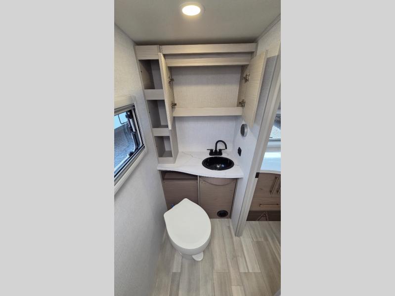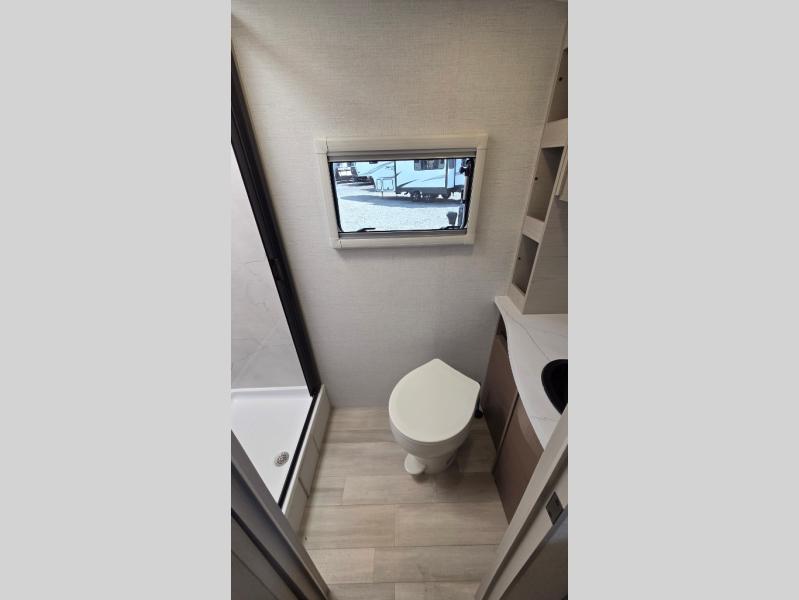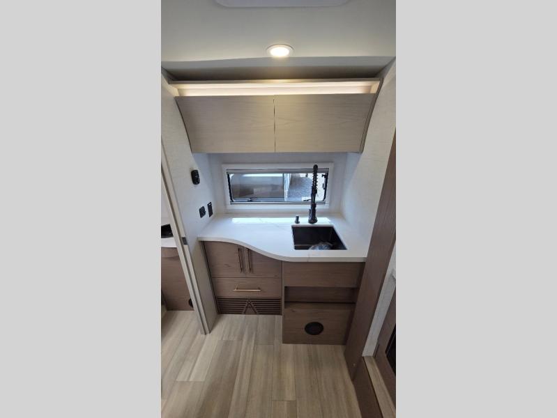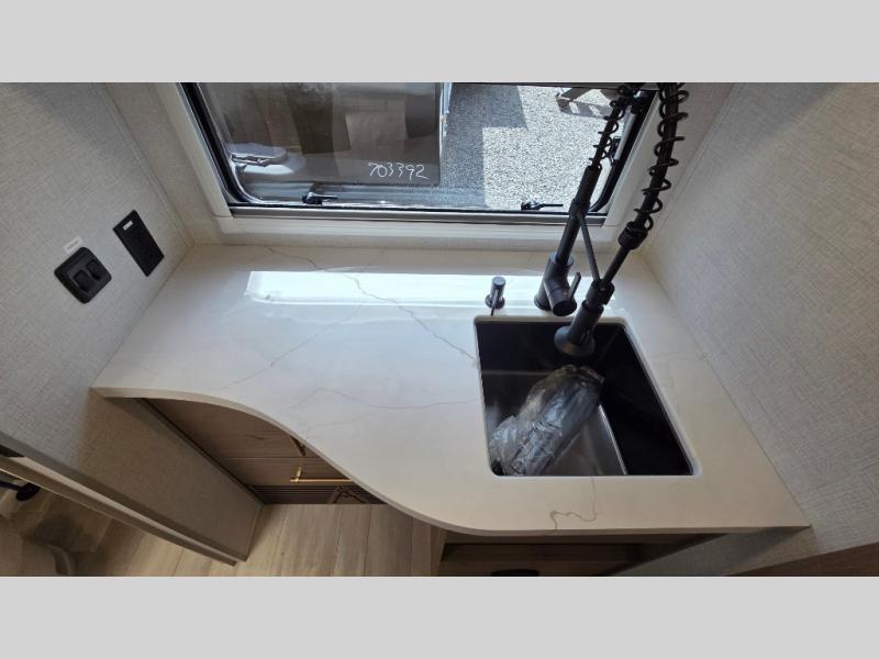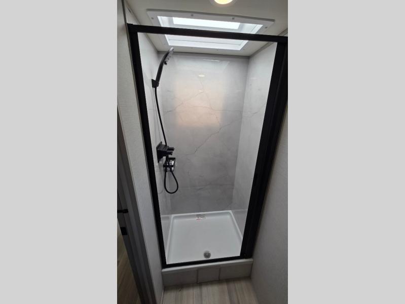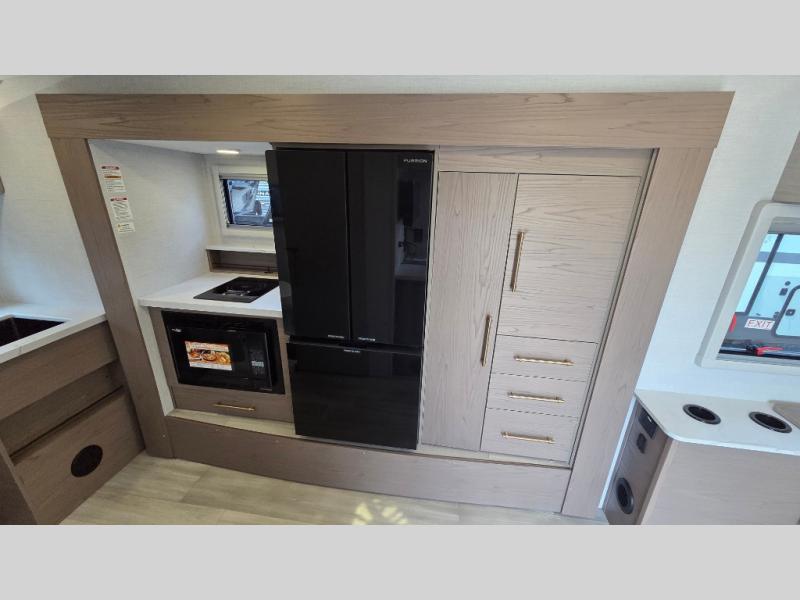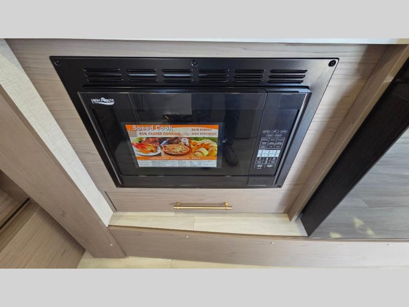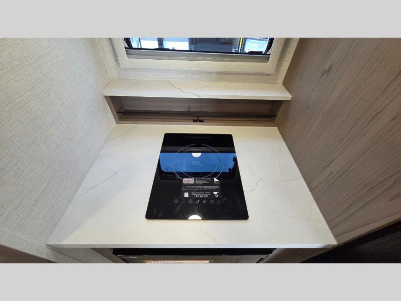 You'll love camping in this spacious and versatile travel trailer. There is a 60" x 76" flip bed up front that you can fold away during the day to relax on the sofa. An induction cooktop and convection microwave within the slide out will let you make meals each day, and you'll also find a wardrobe and pantry here for added storage. The rear corner kitchen includes ample counter space and overhead storage for dishes, spices and more. After a day outdoors, you can clean up in the rear corner bath, complete with a residential walk-in shower, bath skylight, 12V power vent fan plus more!