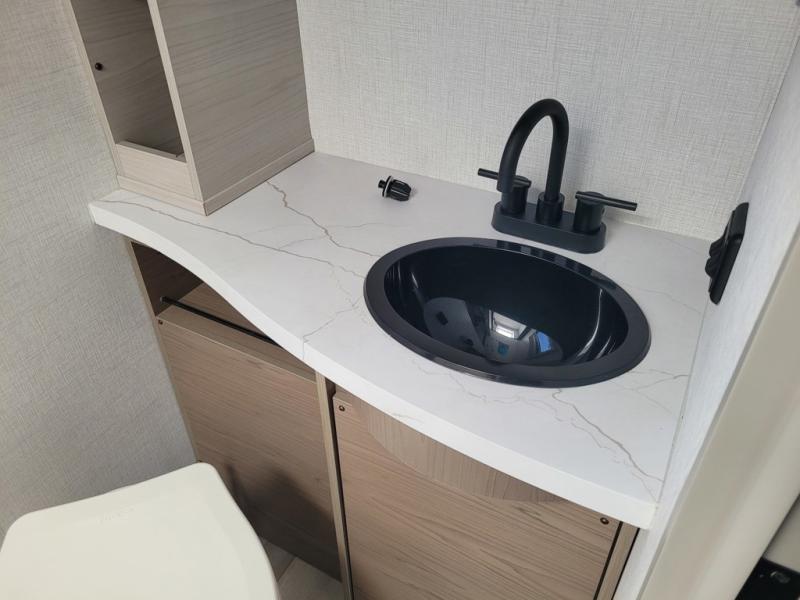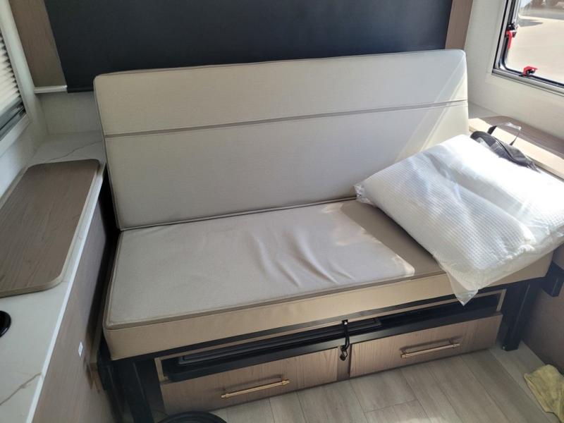 You'll love camping in this spacious and versatile travel trailer. There is a 60" x 76" flip bed up front that you can fold away during the day to relax on the sofa. An induction cooktop and convection microwave within the slide out will let you make meals each day, and you'll also find a wardrobe and pantry here for added storage. The rear corner kitchen includes ample counter space and overhead storage for dishes, spices and more. After a day outdoors, you can clean up in the rear corner bath, complete with a residential walk-in shower, bath skylight, 12V power vent fan plus more!