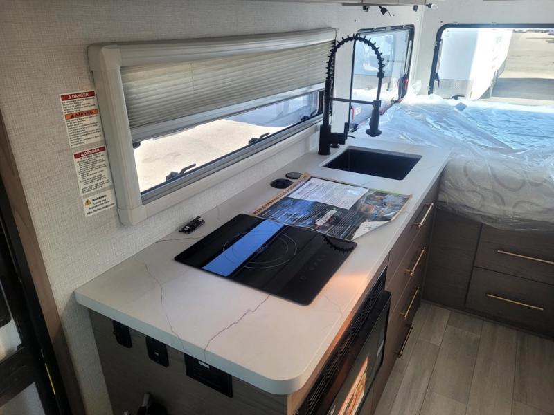 Trips to the lake are made complete in this cozy travel trailer for four. Once you arrive at the campground, you can unload the exterior storage, then start lunch on the induction cooktop and convection microwave. There is a front U-shaped sleeper dinette that will provide dining space and additional sleeping space for guests. This unit includes a private full bath with a shower, toilet, and flip-up bath sink plus some convenient storage for your necessities. You're sure to enjoy sleeping on the rear queen bed that includes wraparound overhead storage for your things!
