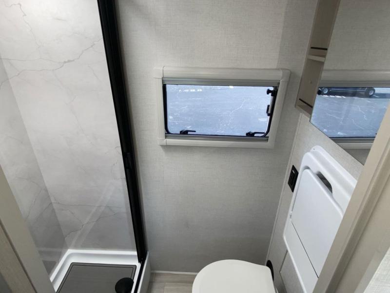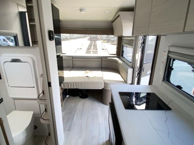 Trips to the lake are made complete in this cozy travel trailer for four. Once you arrive at the campground, you can unload the exterior storage, then start lunch on the induction cooktop and convection microwave. There is a front U-shaped sleeper dinette that will provide dining space and additional sleeping space for guests. This unit includes a private full bath with a shower, toilet, and flip-up bath sink plus some convenient storage for your necessities. You're sure to enjoy sleeping on the rear queen bed that includes wraparound overhead storage for your things!