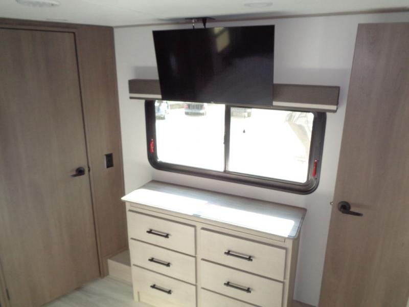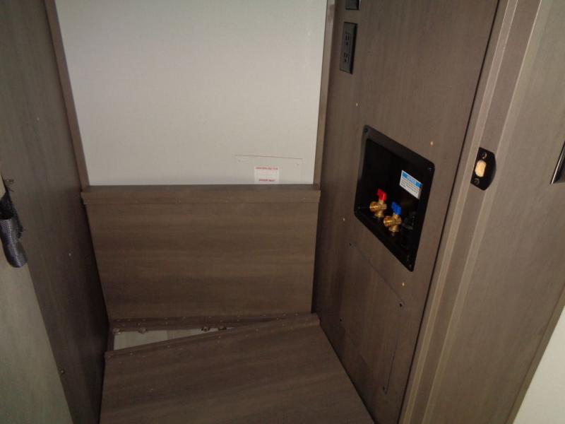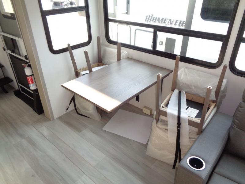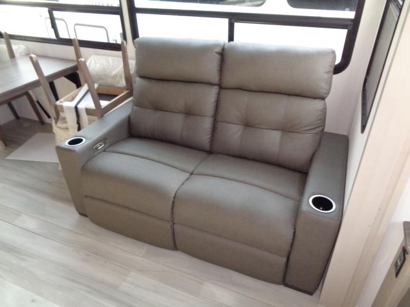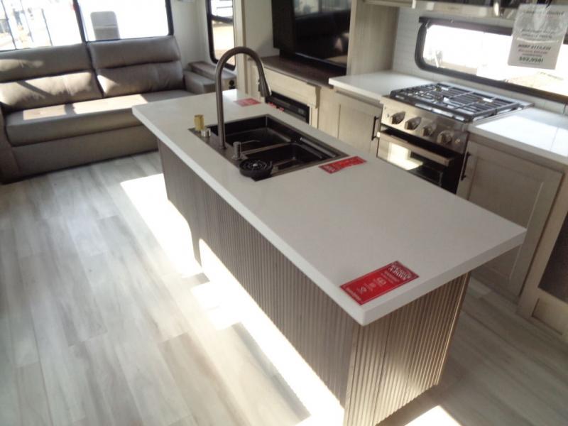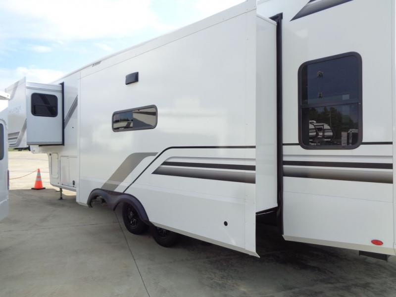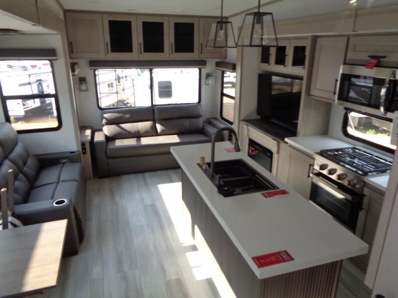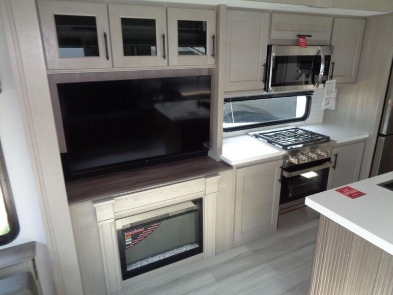 A perfect fifth wheel featuring triple slides and a tri-fold sofa for overnight guests! You will love the spacious interior thanks to the dual opposing slides in the main living and kitchen area. Here you will find a kitchen island in the center and plenty of seating with a free standing dinette, theater seating for movie night opposite the fireplace and entertainment center, as well as a tri-fold sofa. The kitchen offers all of the amenities just like home, a 16 cu. ft. 12-volt refrigerator for your perishables, and a hutch with an electronics drawer to keep your gadgets organized. There is even a pet dish under the refrigerator for your furry friends. The spacious full bath includes a 48" x 30" shower, dual linen closets, and an accessory drawer for necessities. You'll love the front bedroom with its queen bed slide out, slide top dresser, front wardrobe with washer and dryer prep, plus a pass-thru clothes hamper between the bedroom and bath; how convenient!