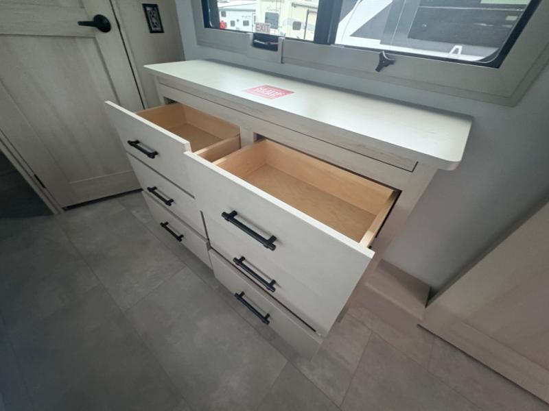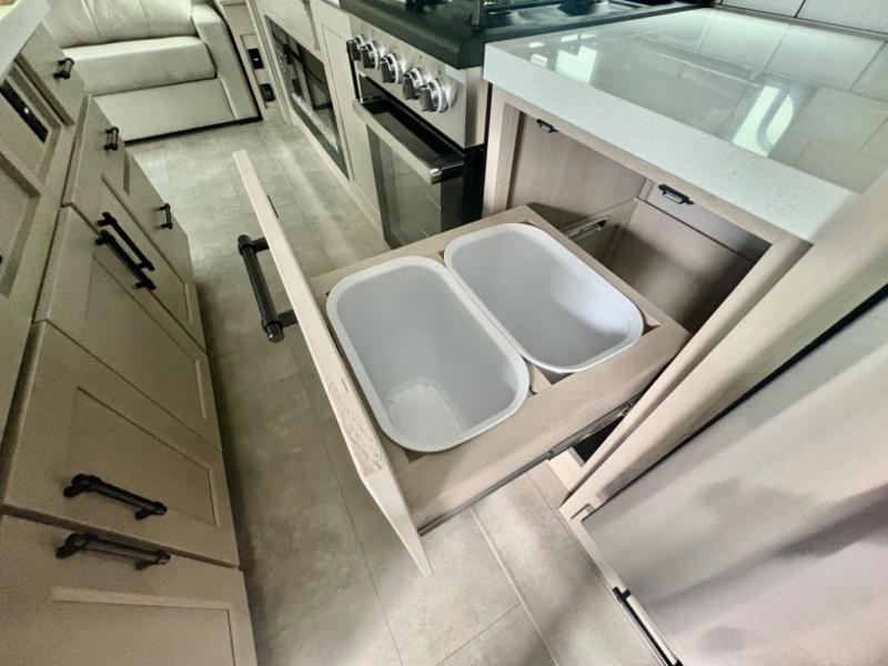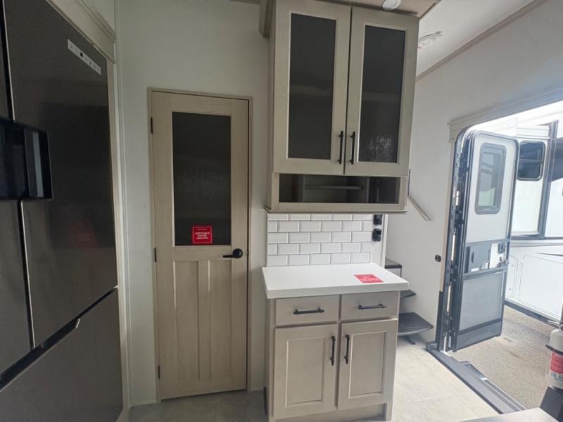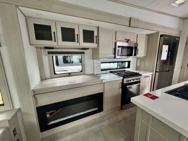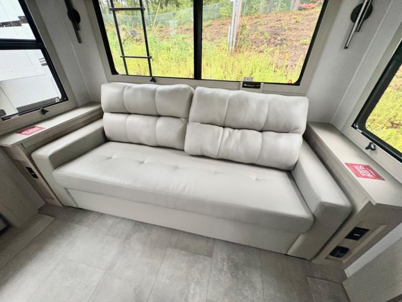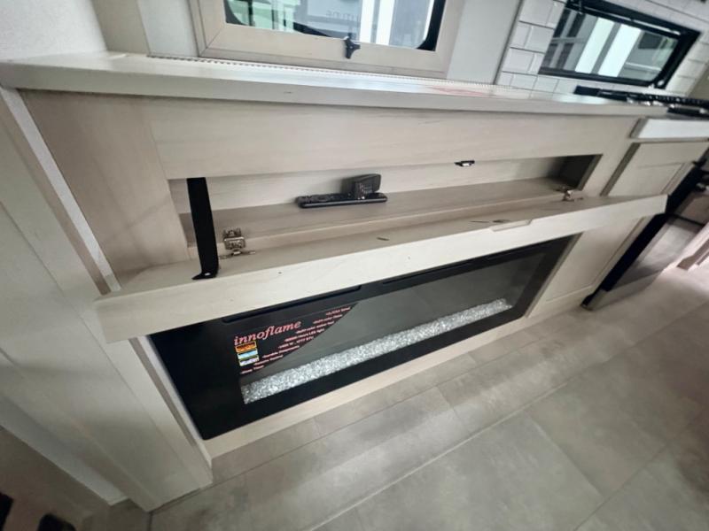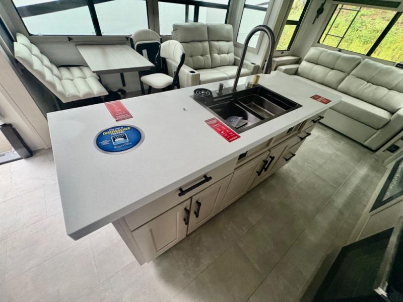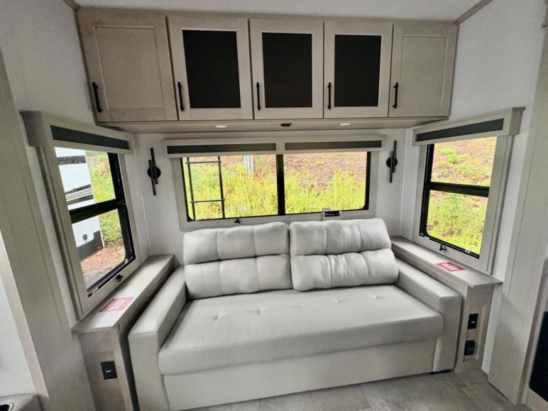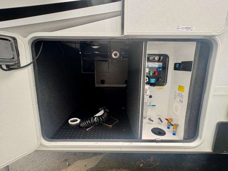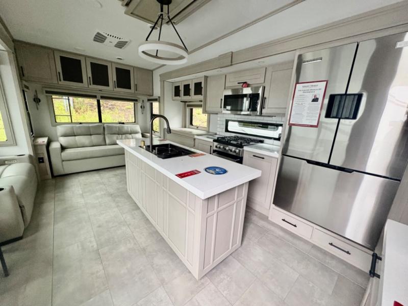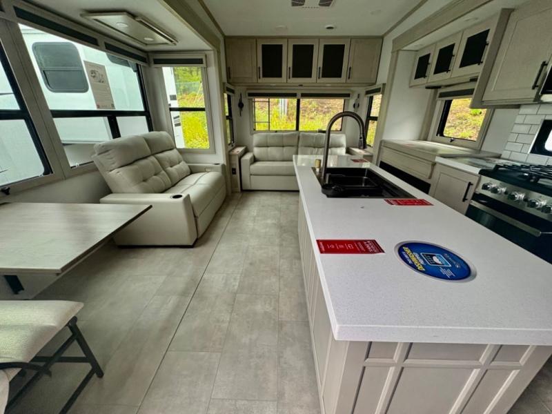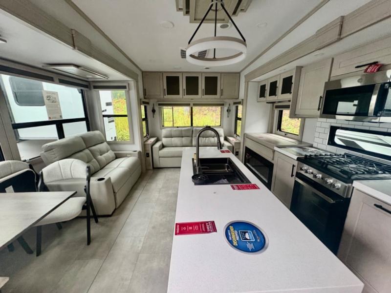 Five slide outs, a full bathroom with dual sinks, a half bath off of the kitchen, and a separate front living room and entertainment area are a few reasons you will enjoy your time spent in this fifth wheel! The separate kitchen is a dream with stainless steel appliances including a built-in oven, a pantry and hutch with counter space, a kitchen island plus a free-standing dinette slide with windows for great views. The entertainment center offers an LED Smart TV with a fireplace below and storage, and the dual opposing tri-fold sofas provide added sleeping space at night. The master bedroom includes a queen bed plus space savings sliding doors that lead you to the rear full bathroom with dual sinks, linen storage, and washer/dryer prep. The exterior has several storage choices as well including a pass-through compartment for fishing poles and such, plus the unique sliding tray in the rear allows you to bring along larger items such as camping tables, portable grills, golf clubs, totes and more.