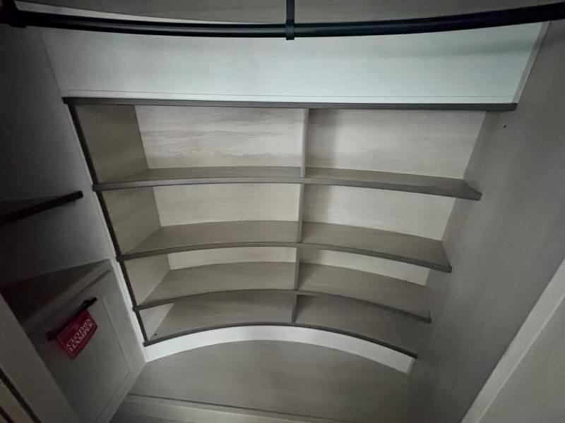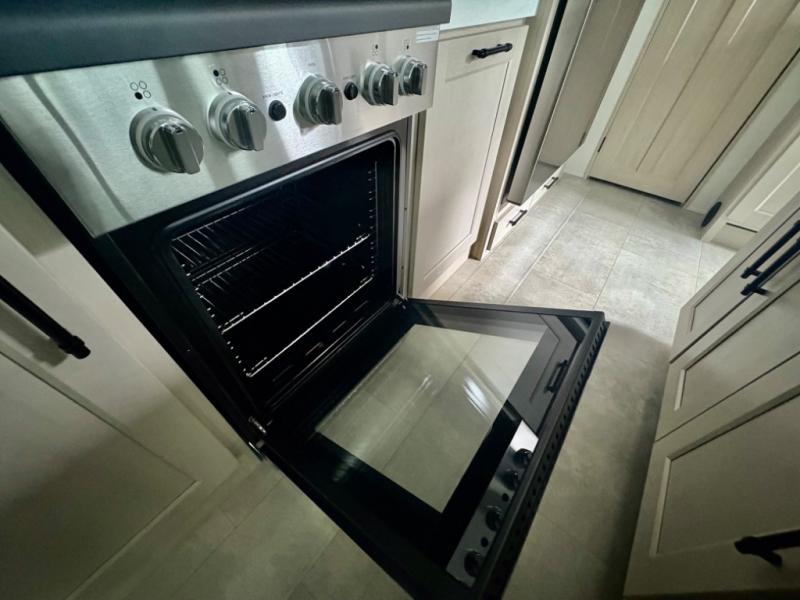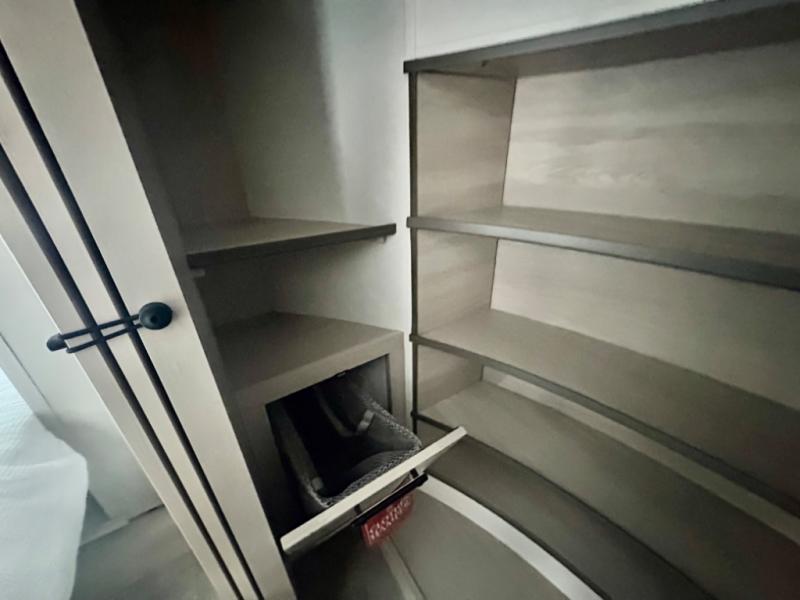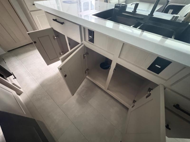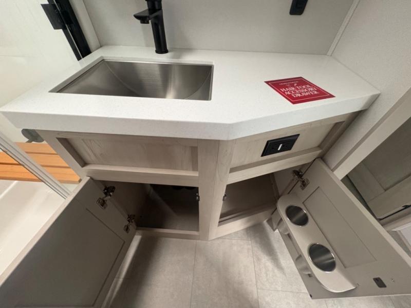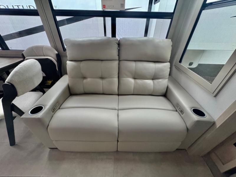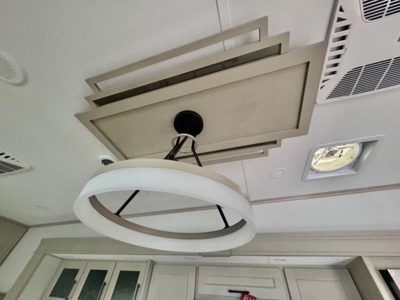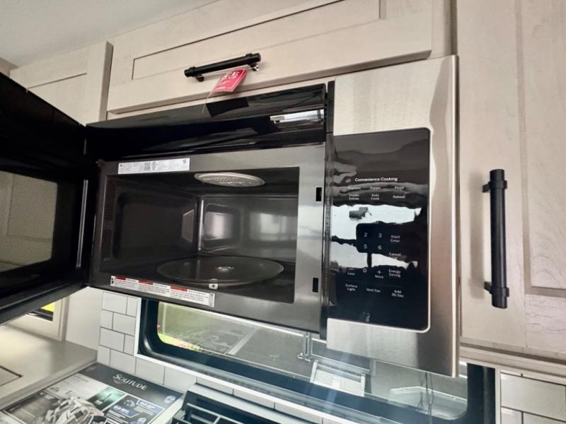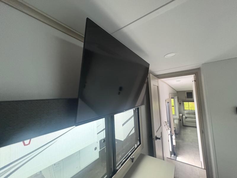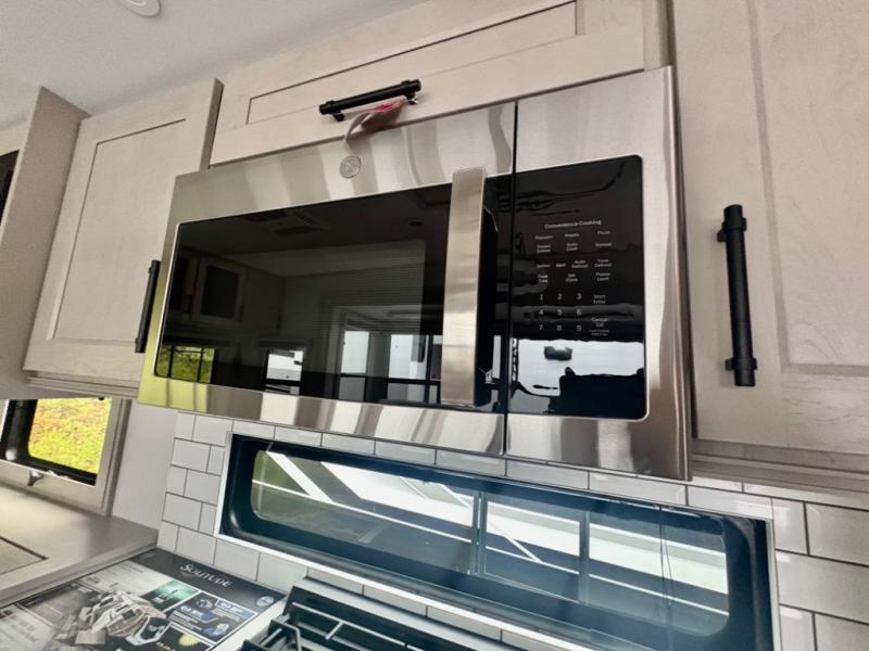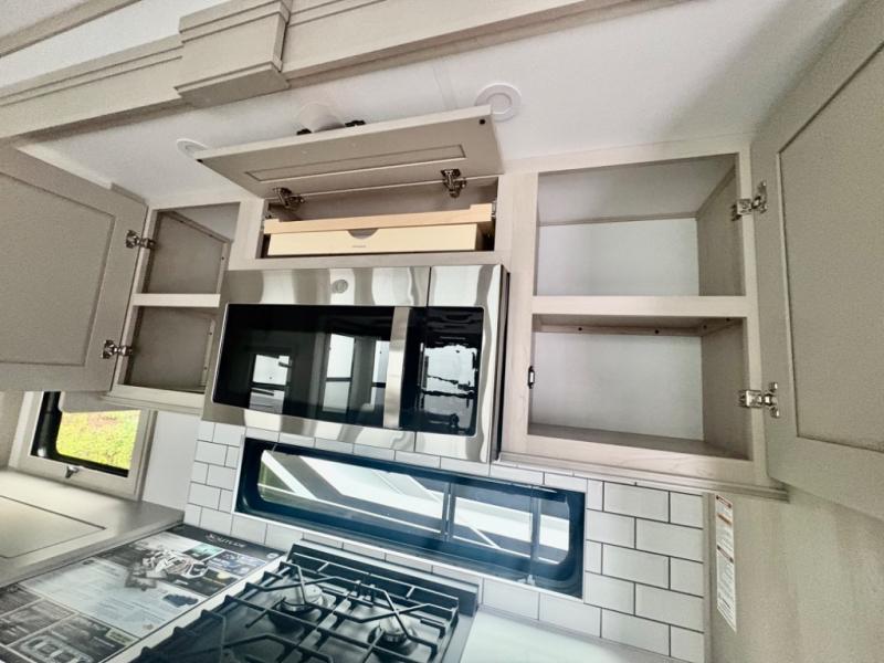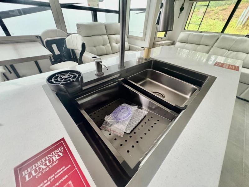Five slide outs, a full bathroom with dual sinks, a half bath off of the kitchen, and a separate front living room and entertainment area are a few reasons you will enjoy your time spent in this fifth wheel! The separate kitchen is a dream with stainless steel appliances including a built-in oven, a pantry and hutch with counter space, a kitchen island plus a free-standing dinette slide with windows for great views. The entertainment center offers an LED Smart TV with a fireplace below and storage, and the dual opposing tri-fold sofas provide added sleeping space at night. The master bedroom includes a queen bed plus space savings sliding doors that lead you to the rear full bathroom with dual sinks, linen storage, and washer/dryer prep. The exterior has several storage choices as well including a pass-through compartment for fishing poles and such, plus the unique sliding tray in the rear allows you to bring along larger items such as camping tables, portable grills, golf clubs, totes and more.