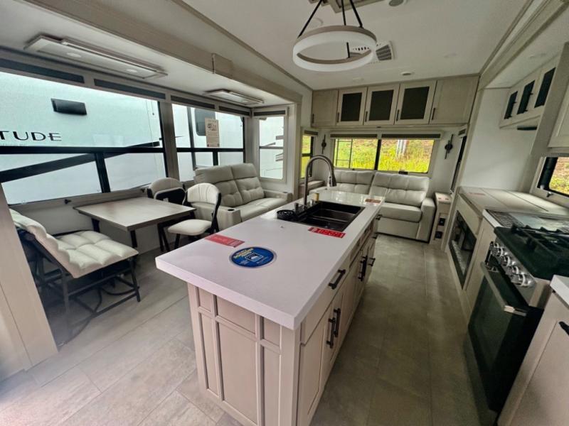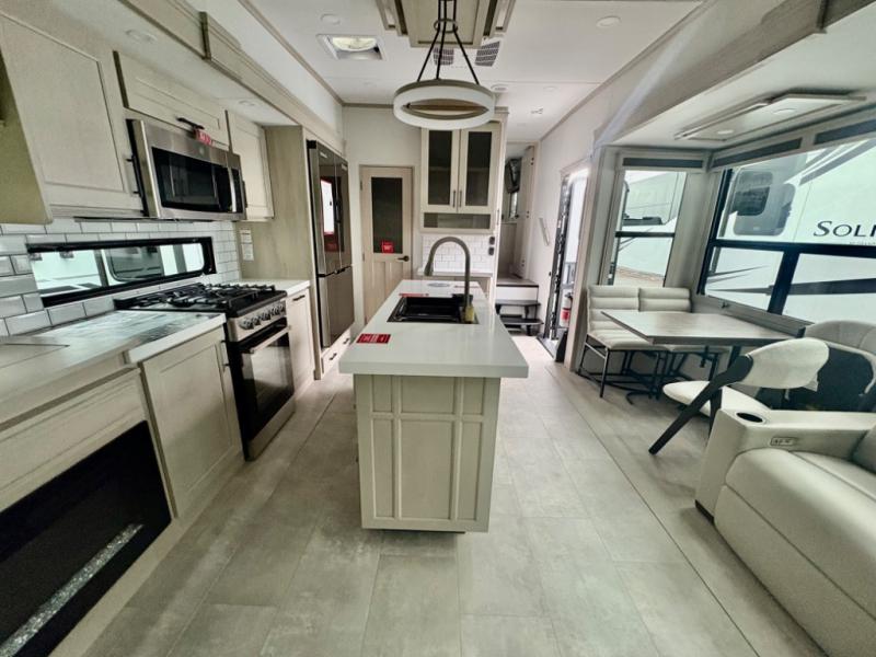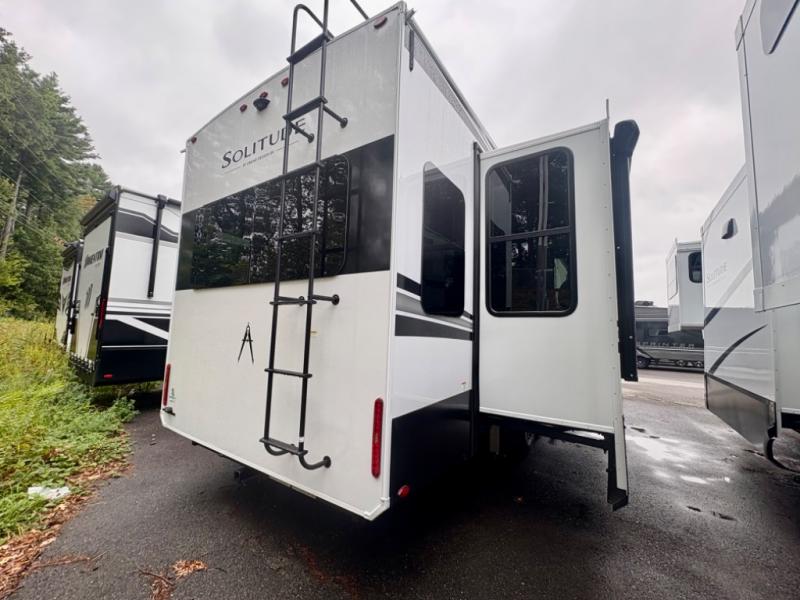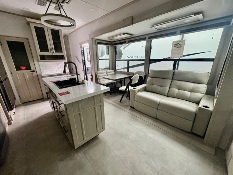 Each Solitude fifth wheel by Grand Design features a 101" wide-body construction, heavy duty 8,000 lb. axles, frameless tinted windows, and high-gloss gel coat sidewalls. You can camp year around thanks to the Weather-Tek Package that includes a 35K BTU high-capacity furnace, an all-in-one enclosed and heated utility center, and a fully enclosed underbelly with heated tanks and storage. Inside, you'll love the premium roller shades, hardwood cabinet doors, solid surface countertops, plus residential finishes throughout to make you truly feel at home. Each model also includes a MORryde CRE3000 suspension system, self adjusting brakes, and a MORryde pin box that will provide smooth towing from home to campground. Affordable luxury is possible with the Solitude fifth wheels; choose yours today!