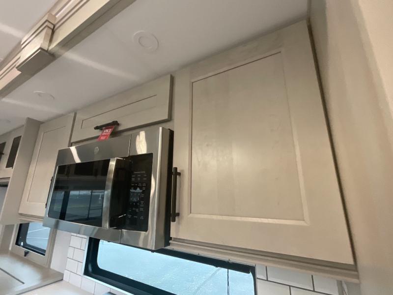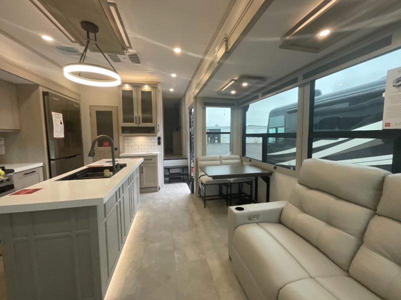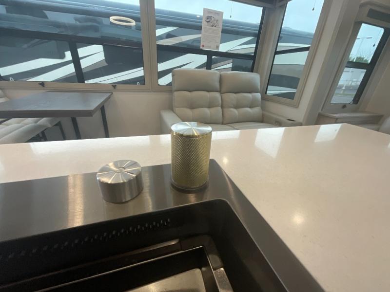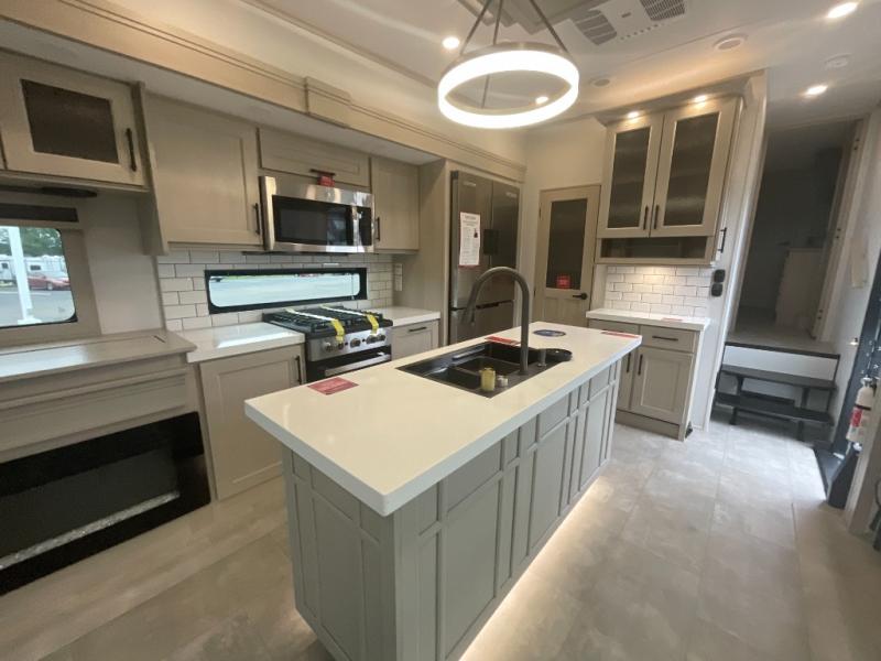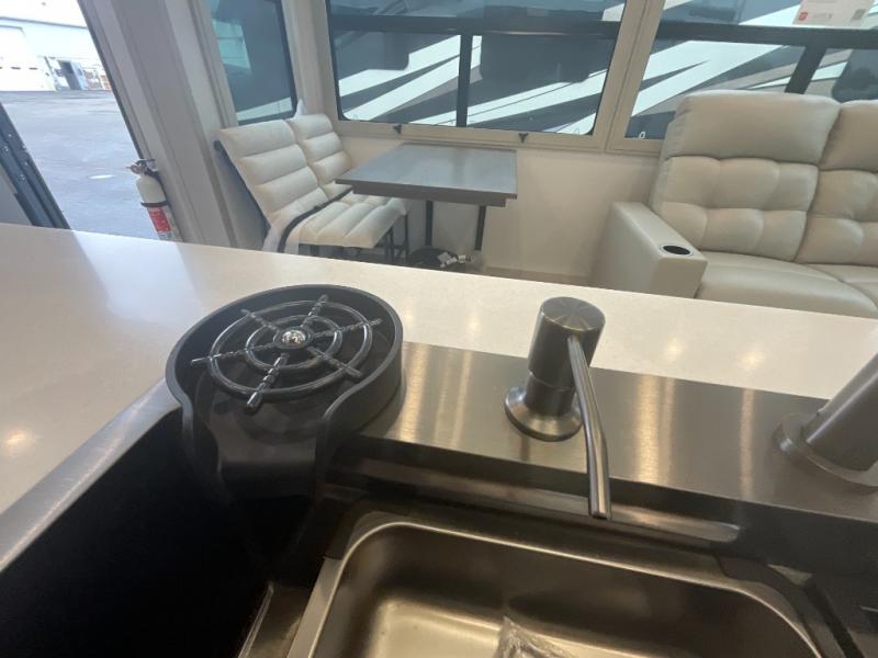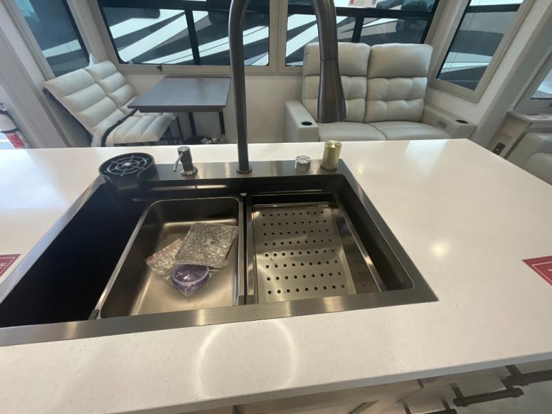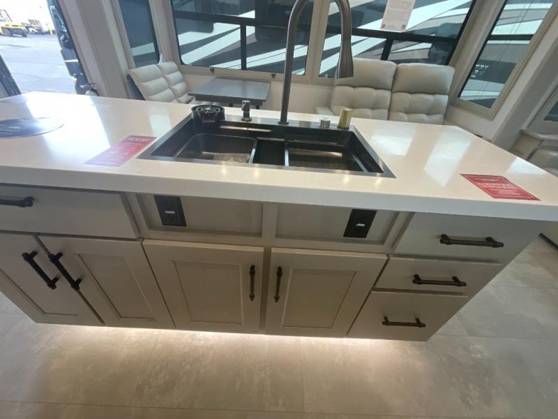 Step inside and be greeted by a spacious and sophisticated interior that maximizes comfort and functionality. The rear living area features plush theater seating, a tri-fold sofa, and a full entertainment center with a fireplace, creating a cozy environment for relaxing or entertaining. The gourmet kitchen is equipped with solid-surface countertops, residential appliances, an oversized pantry, and an island with ample storage, making meal preparation easy and enjoyable no matter where your travels take you.