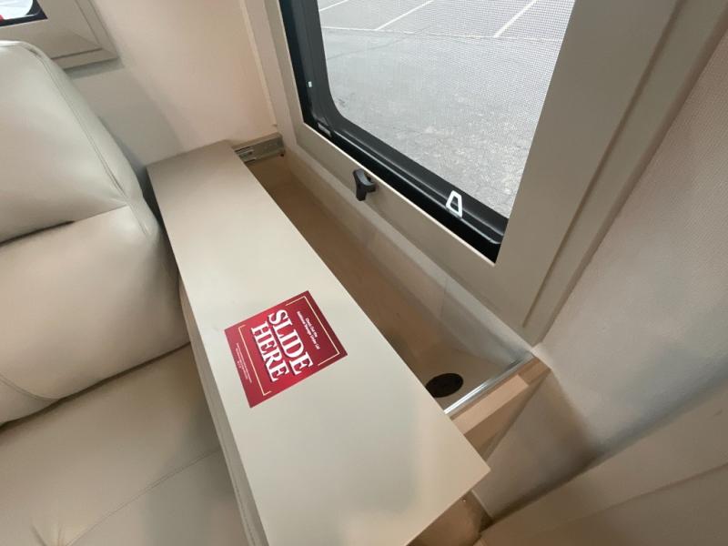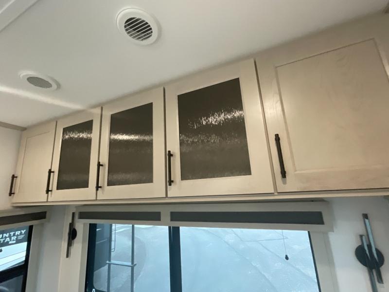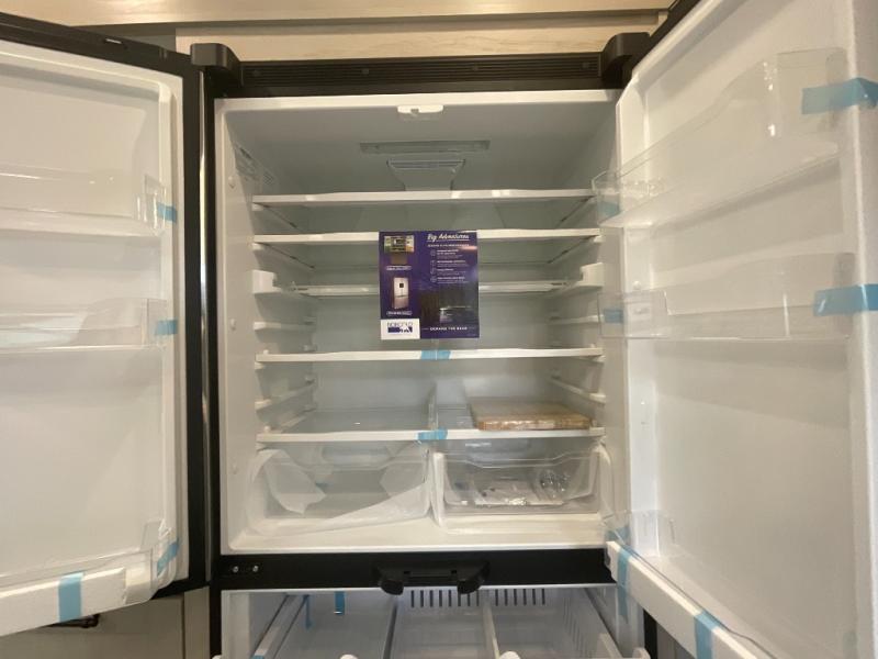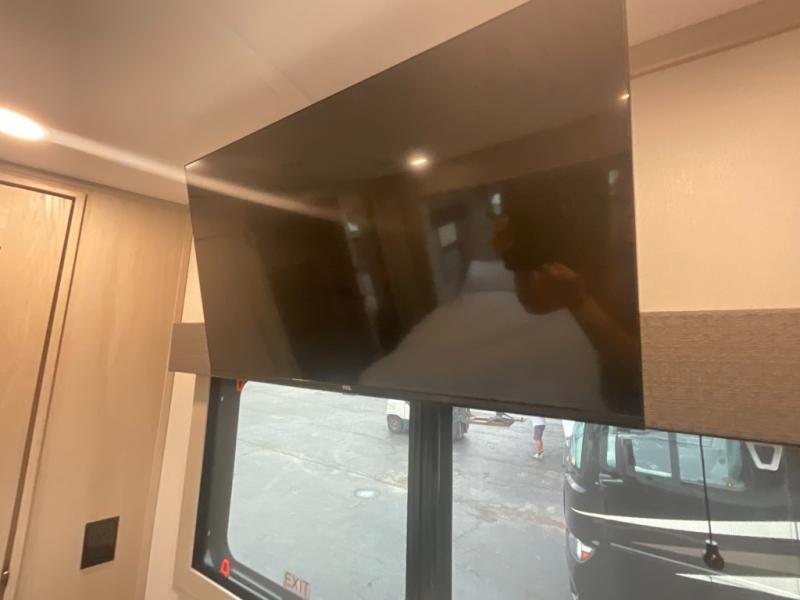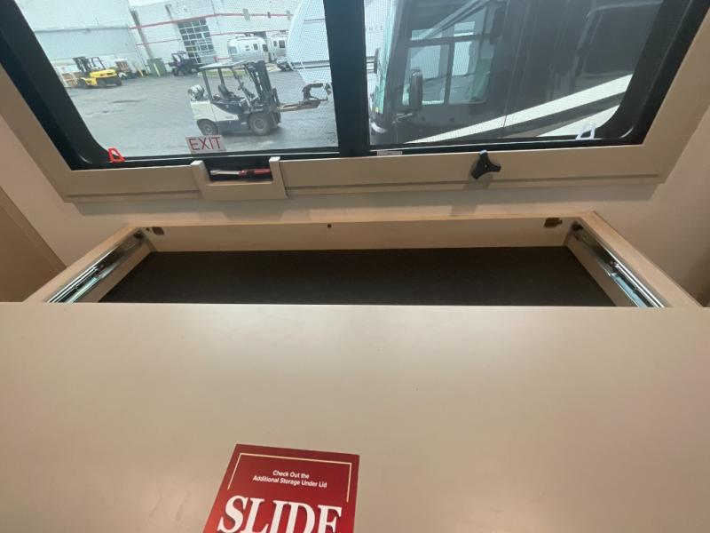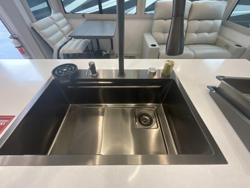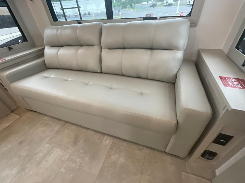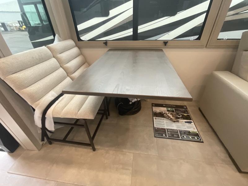 Step inside and be greeted by a spacious and sophisticated interior that maximizes comfort and functionality. The rear living area features plush theater seating, a tri-fold sofa, and a full entertainment center with a fireplace, creating a cozy environment for relaxing or entertaining. The gourmet kitchen is equipped with solid-surface countertops, residential appliances, an oversized pantry, and an island with ample storage, making meal preparation easy and enjoyable no matter where your travels take you.