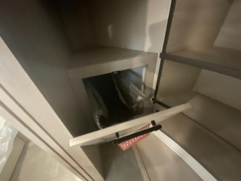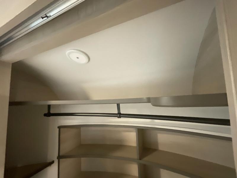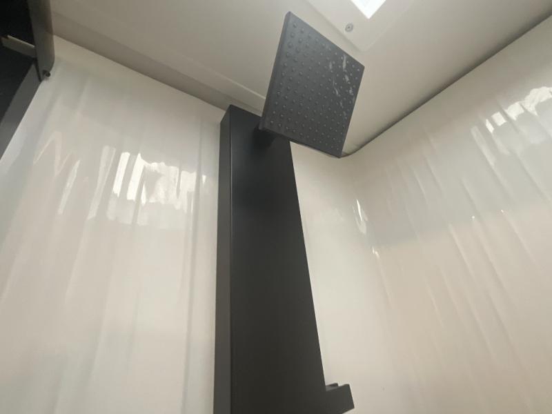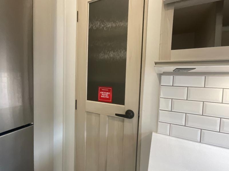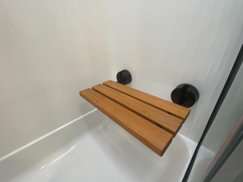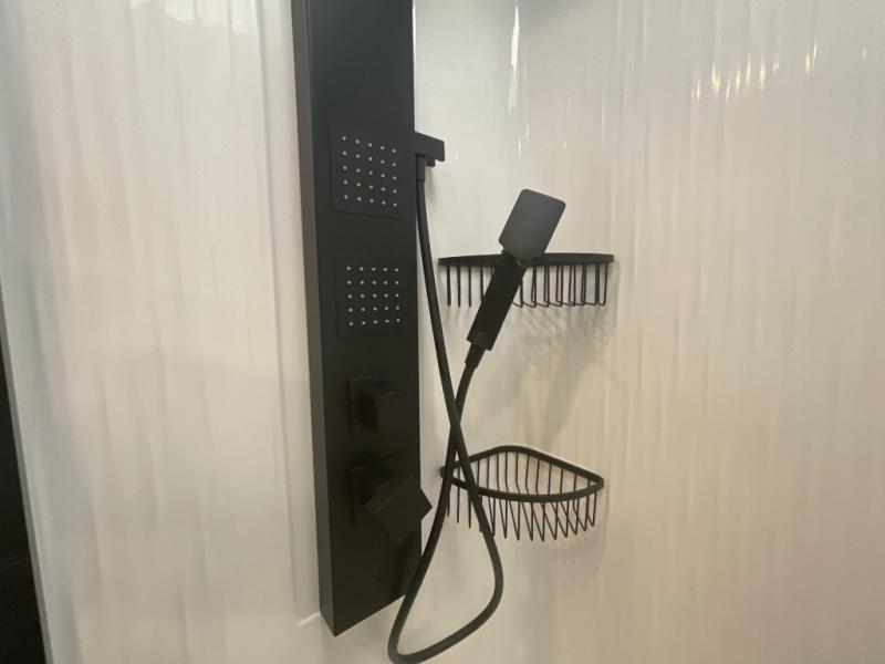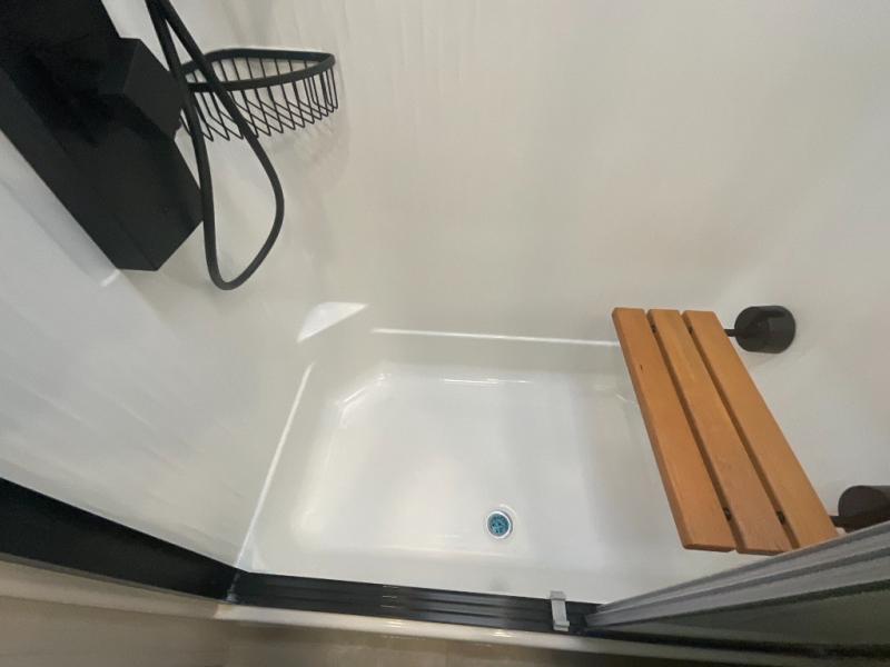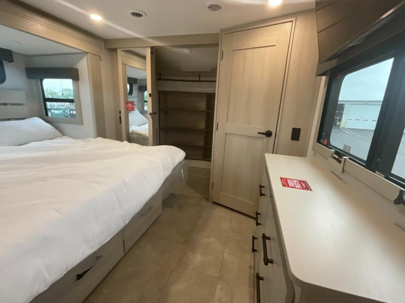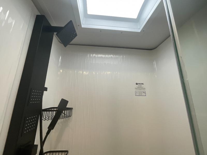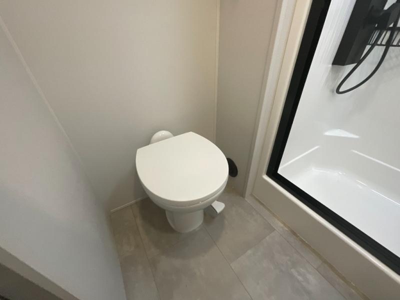 The private front master suite offers a restful retreat with a walk-around king or queen bed, generous wardrobe space, and washer/dryer prep for extended trips. The full bathroom includes a large shower with skylight, modern fixtures, and smart storage solutions. High ceilings, panoramic windows, and thoughtful design touches throughout create a bright and inviting living space that feels like home.