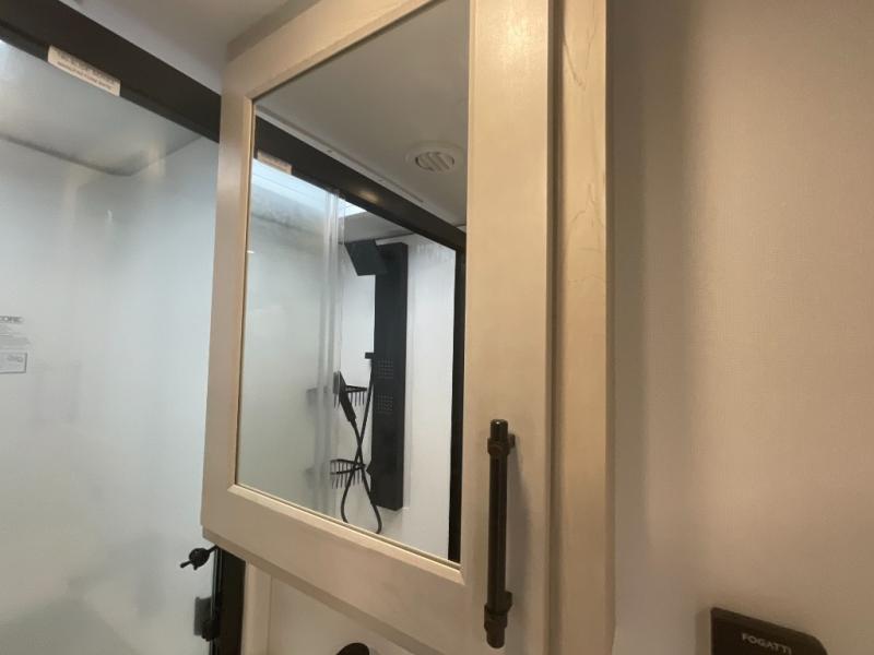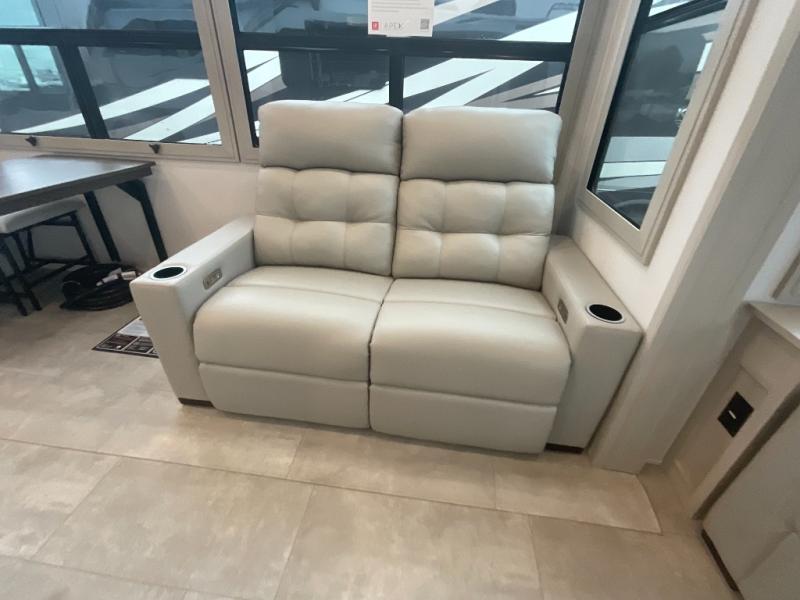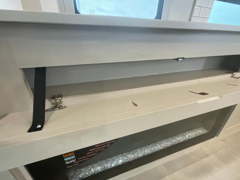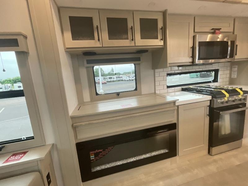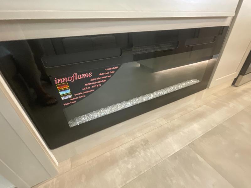 Luxury Living on the Road: Spacious rear living, fireplace, and entertainment center for comfort and relaxation.