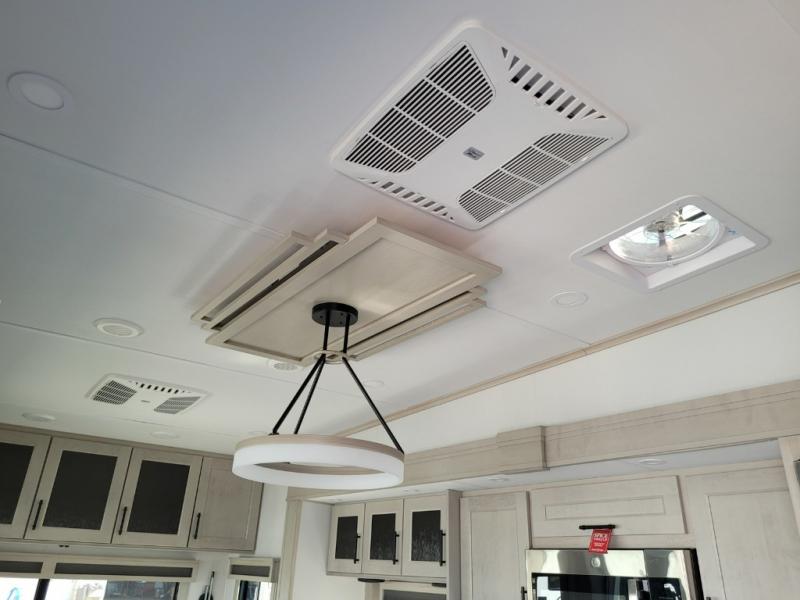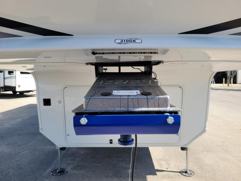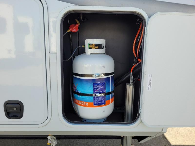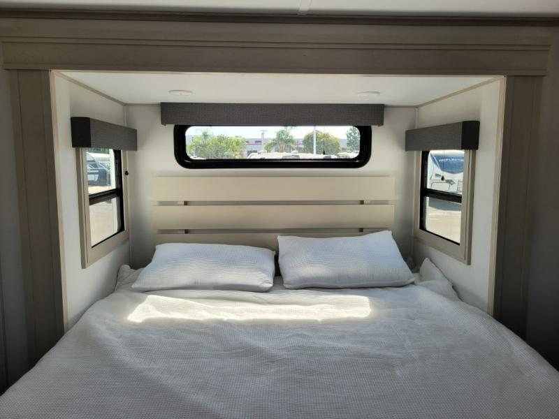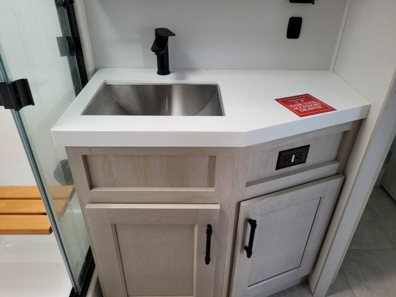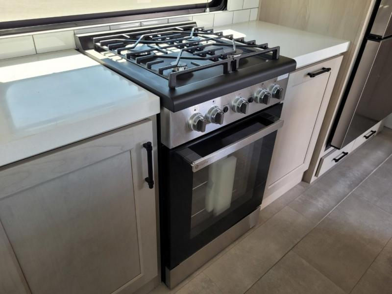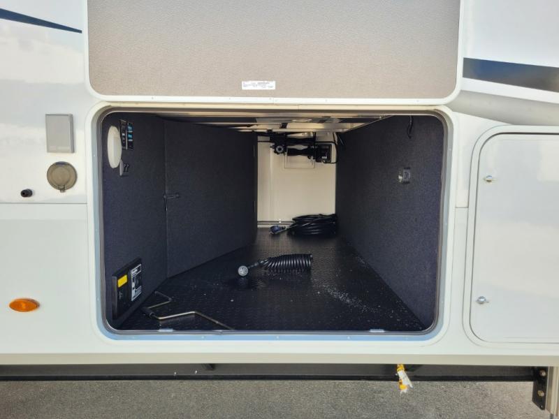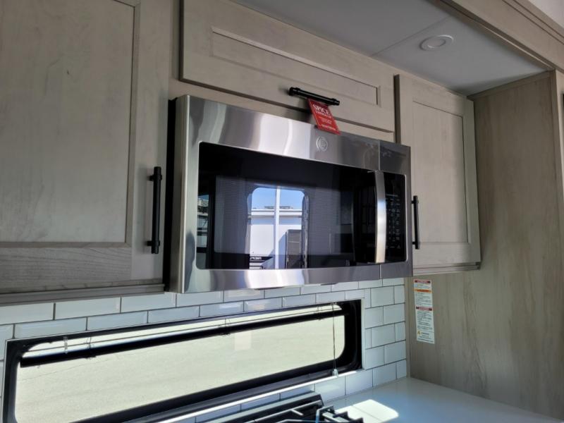 Traveling for long periods at a time is made easy with this gourmet kitchen that can feed your entire group a holiday meal! The professional-grade stainless steel cooktop with a built-in oven, microwave, 12V 20 cu. ft. refrigerator, and a kitchen island offers everything you will need to enjoy cooking for your family and guests. There is abundant storage throughout multiple overhead cabinets, a kitchen pantry and hutch, a bath linen cabinet for your towels, and in the front master bedroom which features a large closet. In the bedroom there is also a queen bed slide for added space to sleep comfortable at night, or you may choose an optional king bed if you enjoy more space. You will also find a closet with washer/dryer prep, large wardrobe, a clothes hamper plus a slide top dresser. Two nice awnings will provide outdoor living space keeping you protected from the sun and rain, and you can add an optional pull-out kitchen to enjoy convenient cooking outdoors as well.