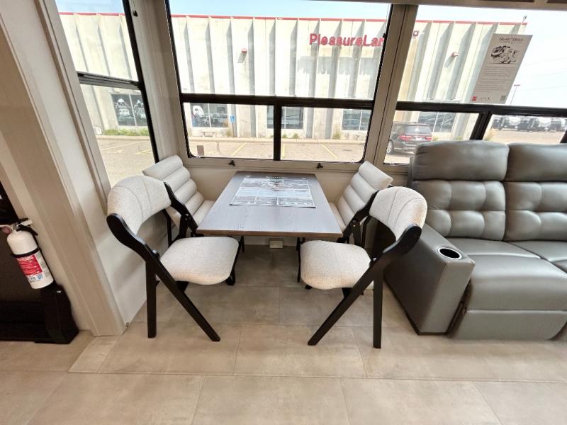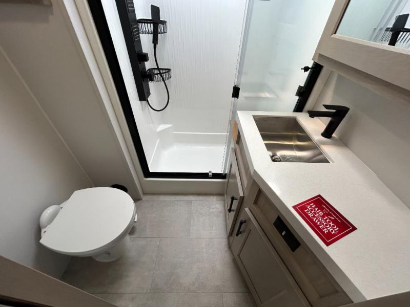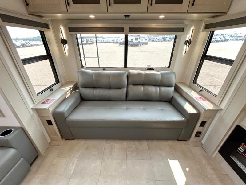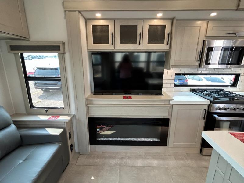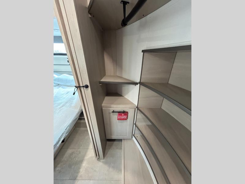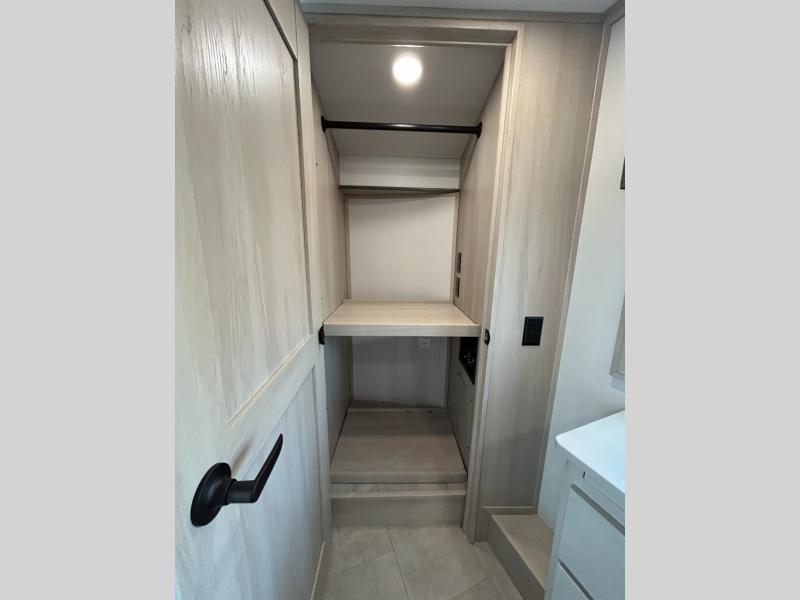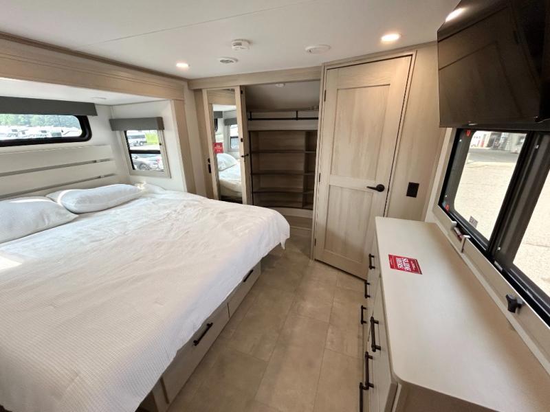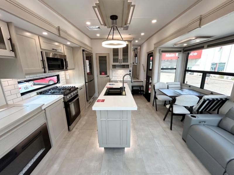 Traveling for long periods at a time is made easy with this gourmet kitchen that can feed your entire group a holiday meal! The professional-grade stainless steel cooktop with a built-in oven, microwave, 12V 20 cu. ft. refrigerator, and a kitchen island offers everything you will need to enjoy cooking for your family and guests. There is abundant storage throughout multiple overhead cabinets, a kitchen pantry and hutch, a bath linen cabinet for your towels, and in the front master bedroom which features a large closet. In the bedroom there is also a queen bed slide for added space to sleep comfortable at night, or you may choose an optional king bed if you enjoy more space. You will also find a closet with washer/dryer prep, large wardrobe, a clothes hamper plus a slide top dresser. Two nice awnings will provide outdoor living space keeping you protected from the sun and rain, and you can add an optional pull-out kitchen to enjoy convenient cooking outdoors as well.