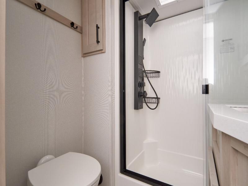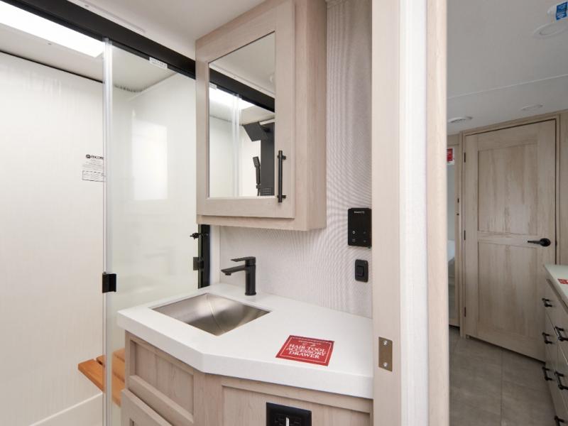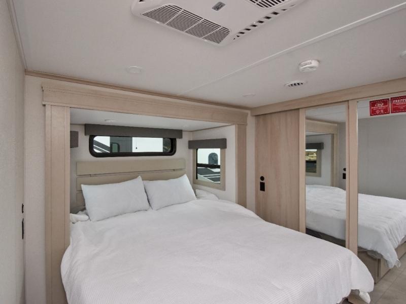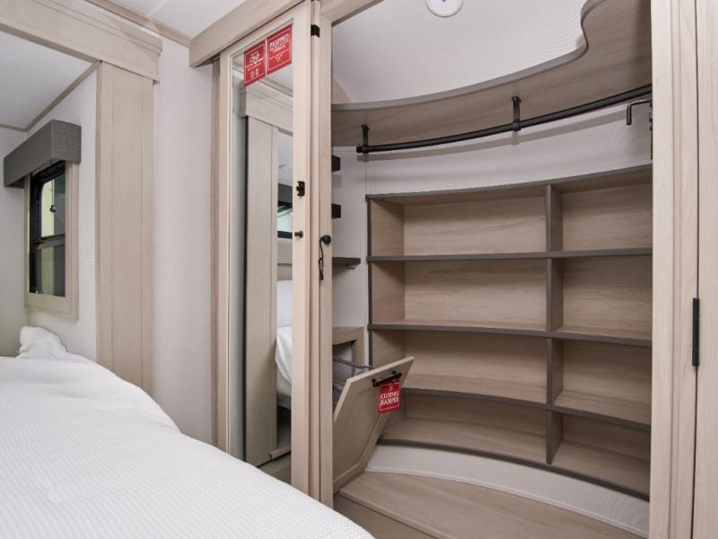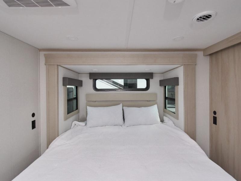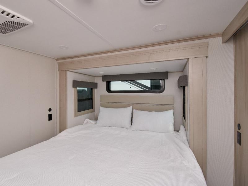 In the master suite, enjoy a queen bed slide (or optional king), a large front closet with washer/dryer prep, a wardrobe, clothes hamper, and a slide-top dresser for added convenience. Dual awnings extend your living space outdoors, and the optional pull-out kitchen makes alfresco cooking a breeze.