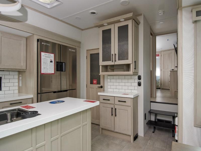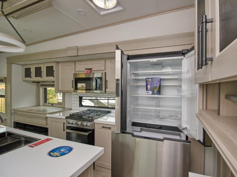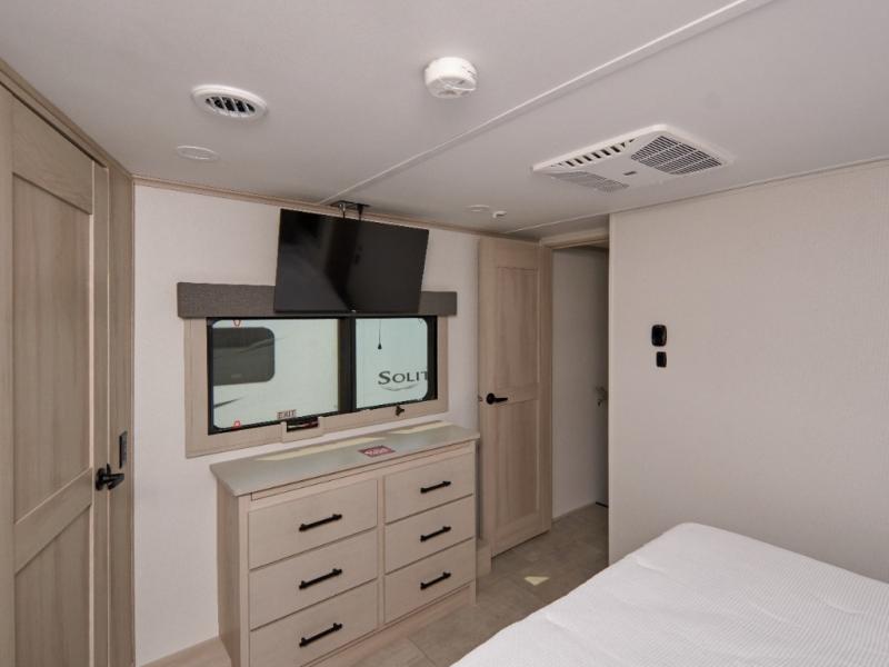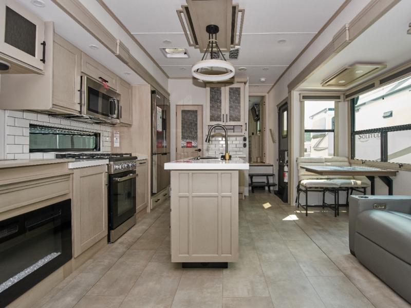 Experience residential luxury on the road with the Solitude 310GK, featuring a gourmet kitchen with oversized pantry and a spacious master suite complete with slide-top dresser and washer/dryer prep.