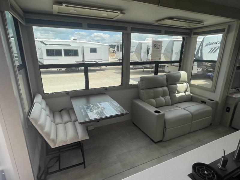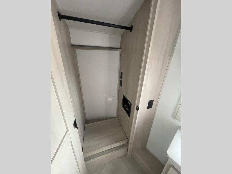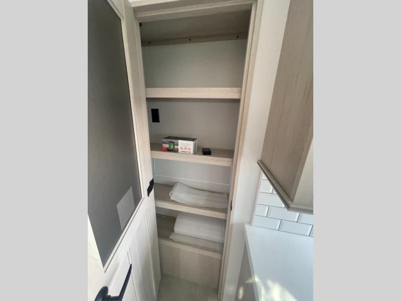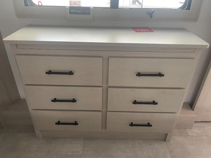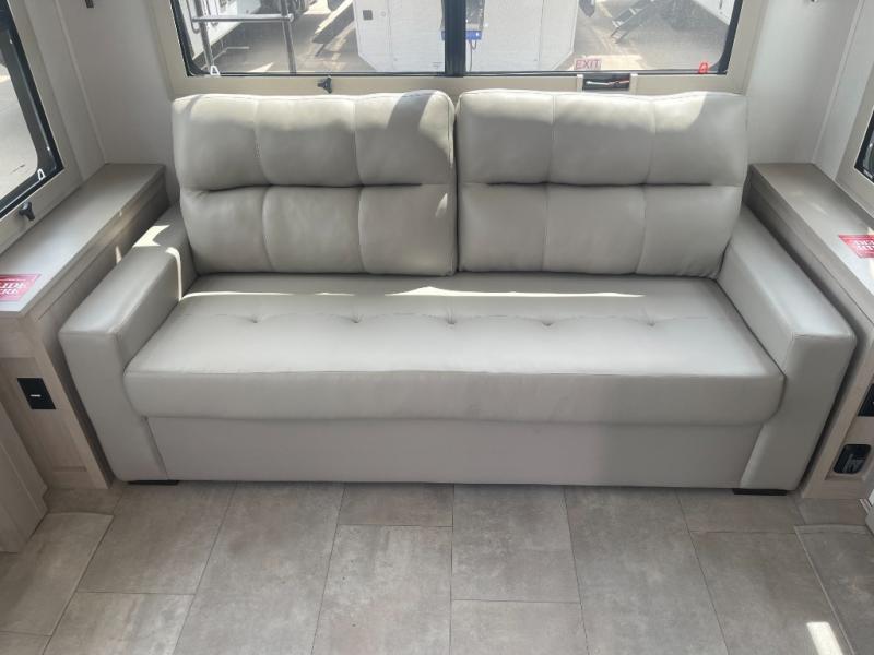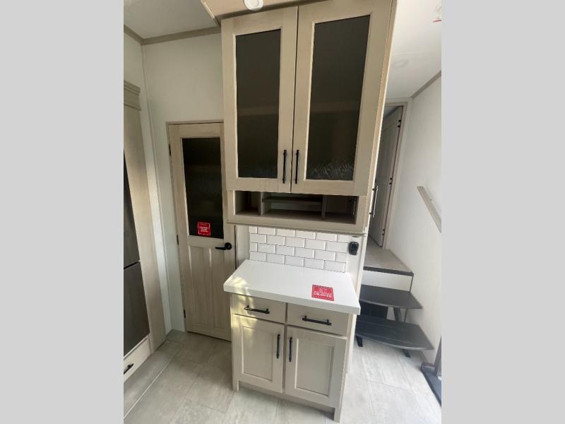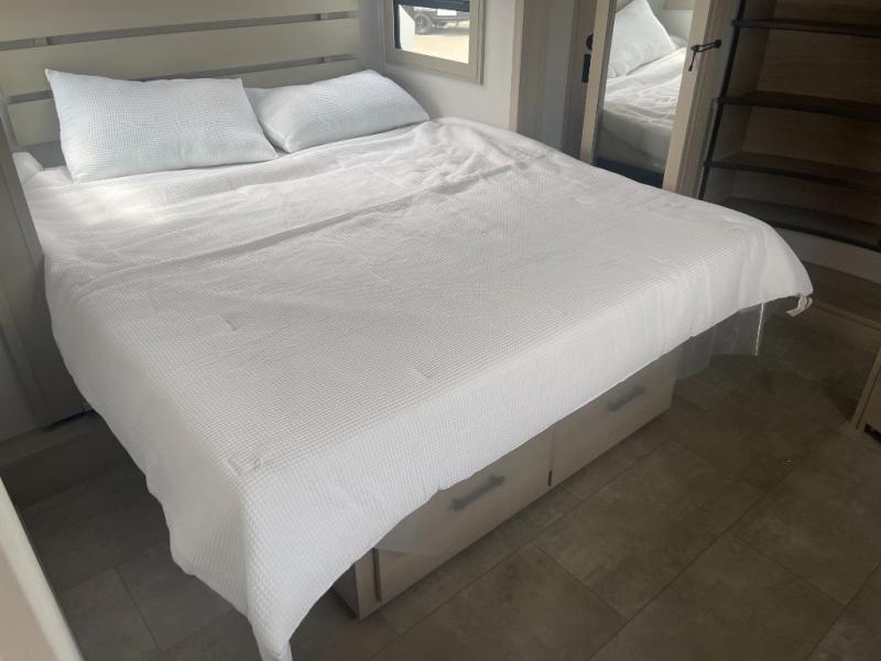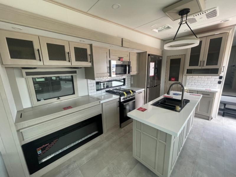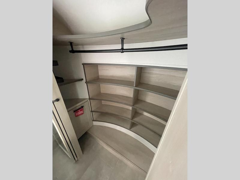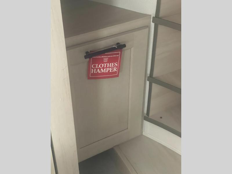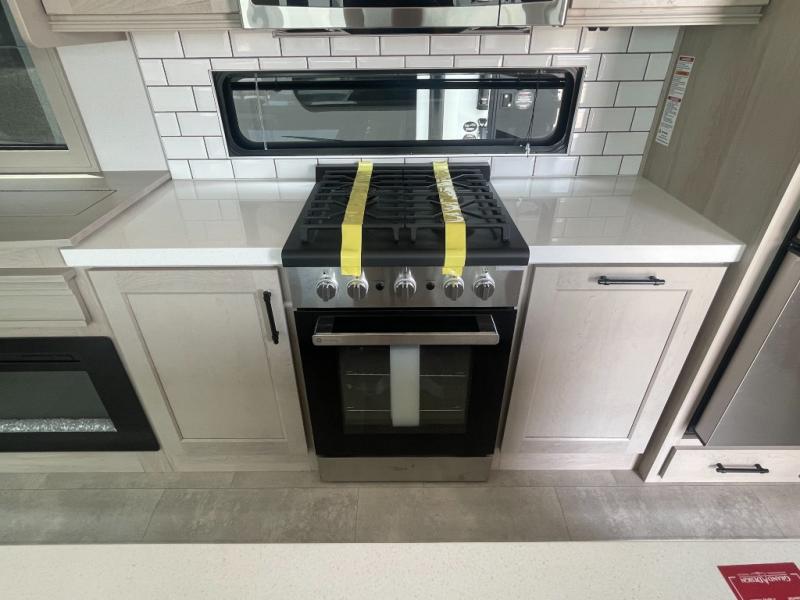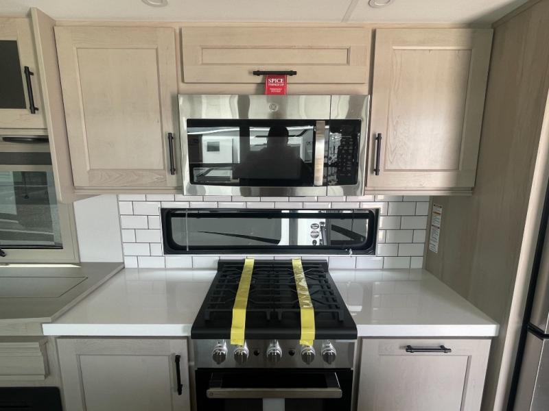 Traveling for long periods at a time is made easy with this gourmet kitchen that can feed your entire group a holiday meal! The professional-grade stainless steel cooktop with a built-in oven, microwave, 12V 20 cu. ft. refrigerator, and a kitchen island offers everything you will need to enjoy cooking for your family and guests. There is abundant storage throughout multiple overhead cabinets, a kitchen pantry and hutch, a bath linen cabinet for your towels, and in the front master bedroom which features a large closet. In the bedroom there is also a queen bed slide for added space to sleep comfortable at night, or you may choose an optional king bed if you enjoy more space. You will also find a closet with washer/dryer prep, large wardrobe, a clothes hamper plus a slide top dresser. Two nice awnings will provide outdoor living space keeping you protected from the sun and rain, and you can add an optional pull-out kitchen to enjoy convenient cooking outdoors as well.