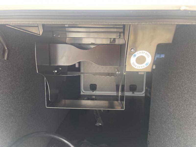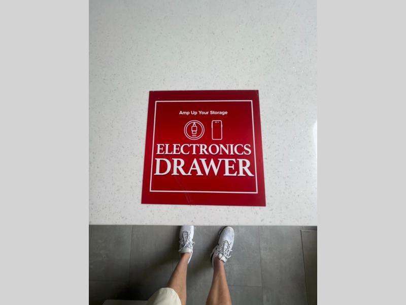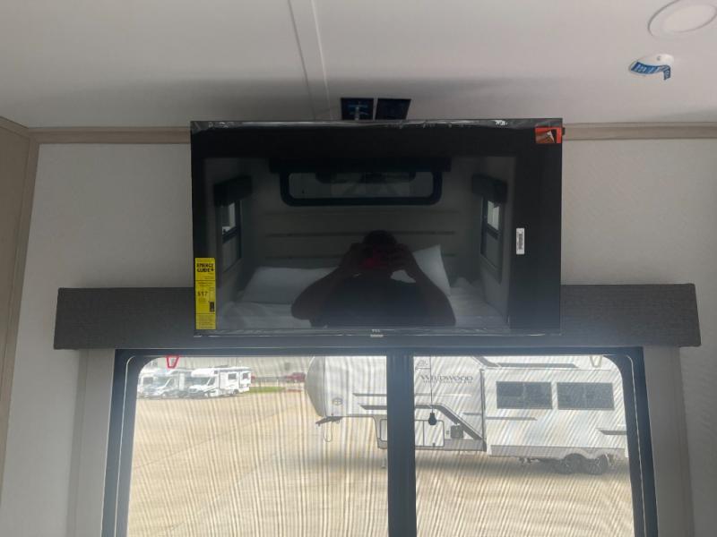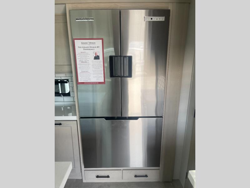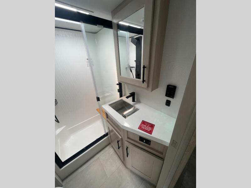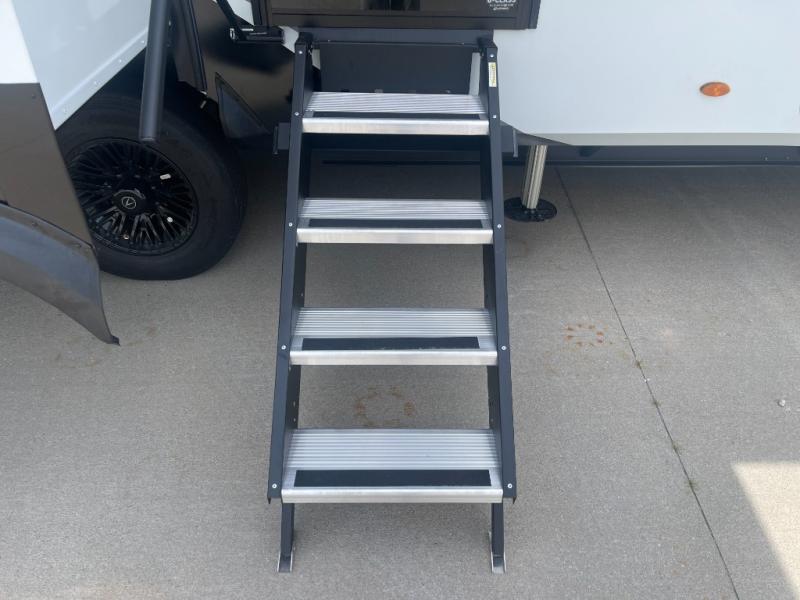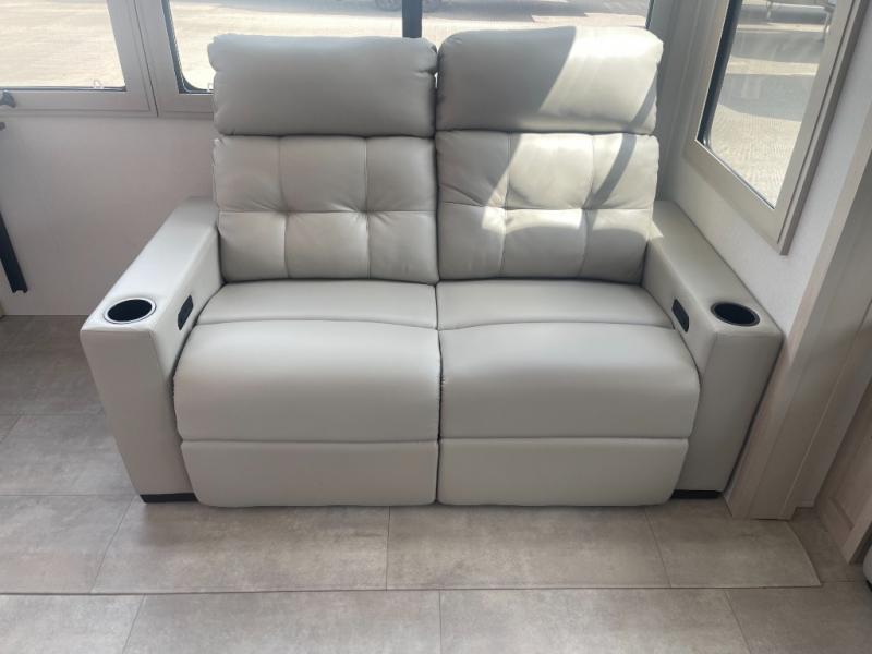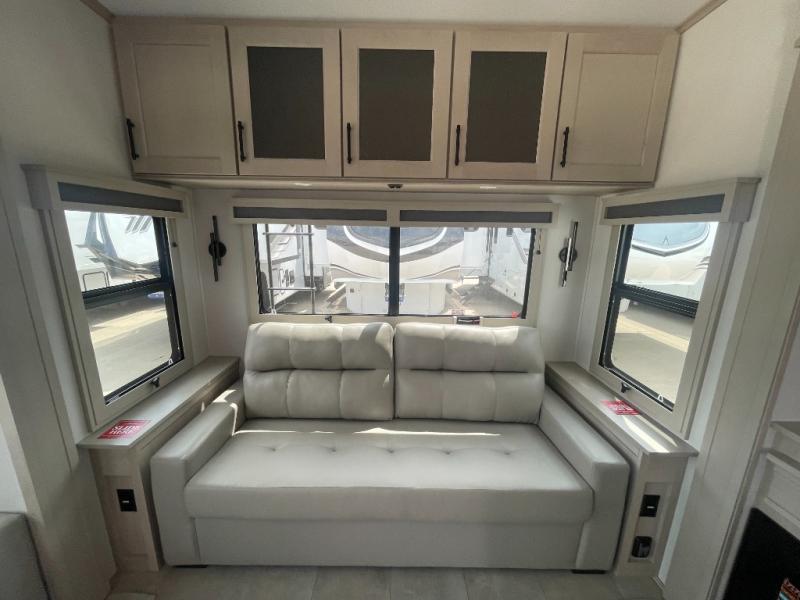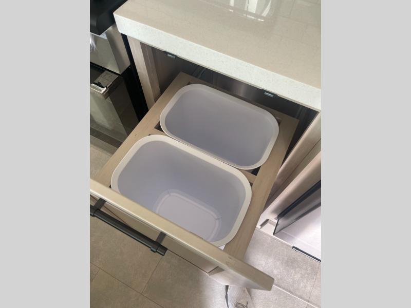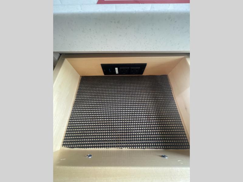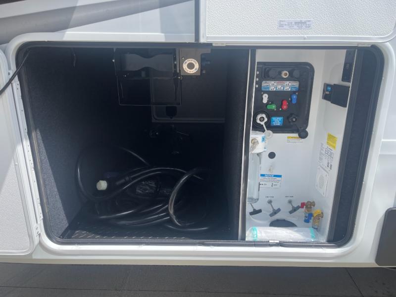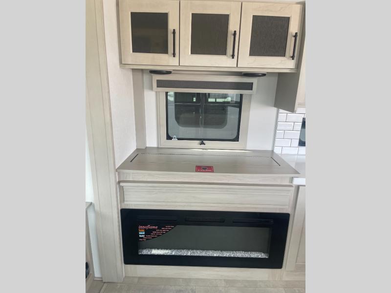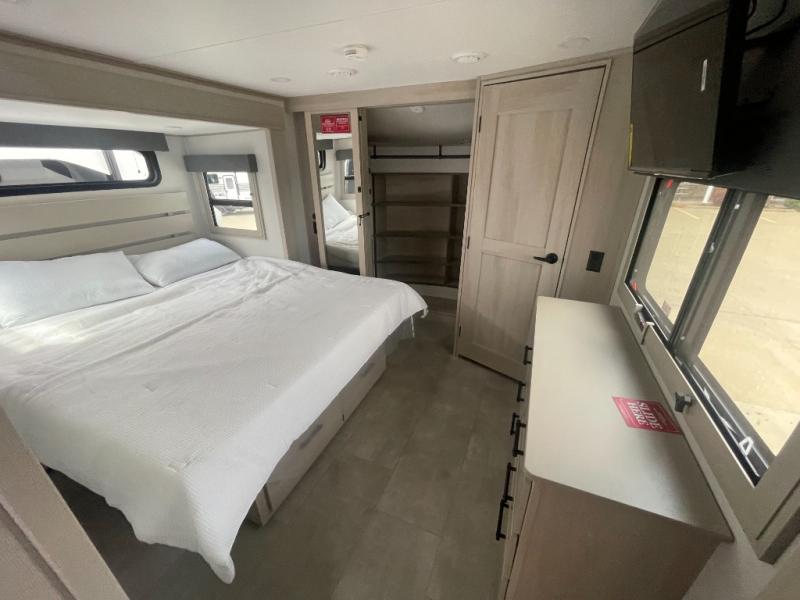 Traveling for long periods at a time is made easy with this gourmet kitchen that can feed your entire group a holiday meal! The professional-grade stainless steel cooktop with a built-in oven, microwave, 12V 20 cu. ft. refrigerator, and a kitchen island offers everything you will need to enjoy cooking for your family and guests. There is abundant storage throughout multiple overhead cabinets, a kitchen pantry and hutch, a bath linen cabinet for your towels, and in the front master bedroom which features a large closet. In the bedroom there is also a queen bed slide for added space to sleep comfortable at night, or you may choose an optional king bed if you enjoy more space. You will also find a closet with washer/dryer prep, large wardrobe, a clothes hamper plus a slide top dresser. Two nice awnings will provide outdoor living space keeping you protected from the sun and rain, and you can add an optional pull-out kitchen to enjoy convenient cooking outdoors as well.