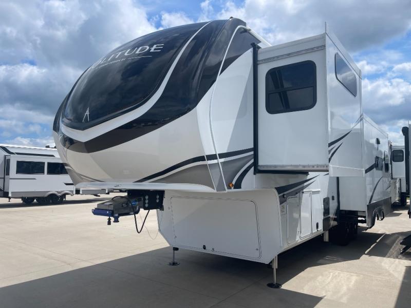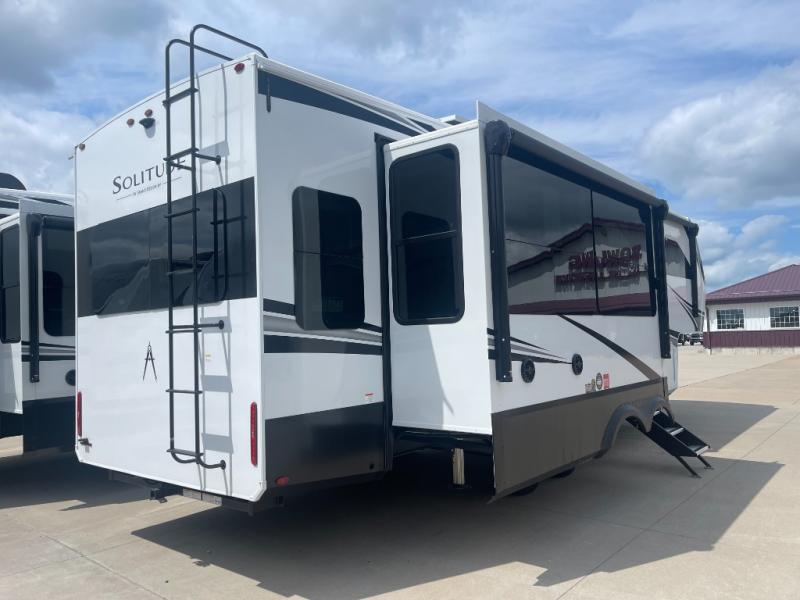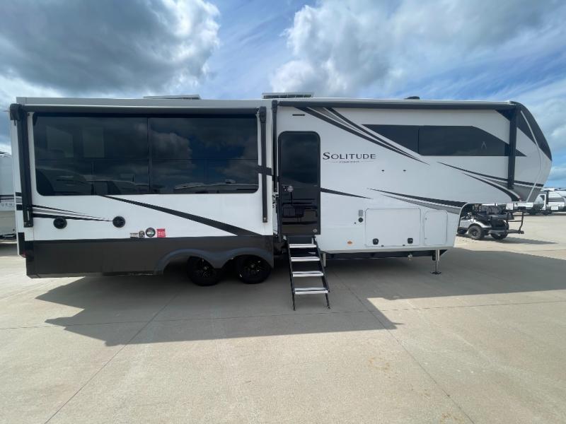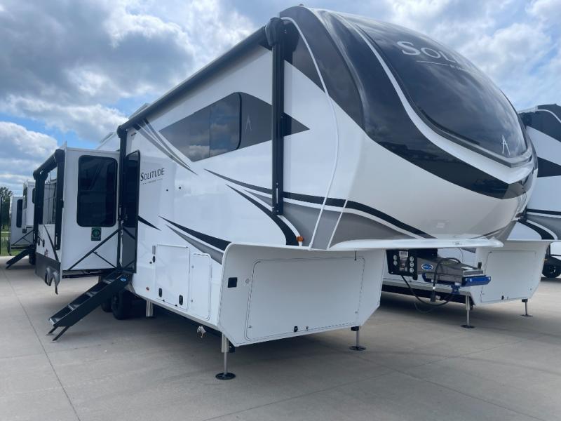 Each Solitude fifth wheel by Grand Design features a 101" wide-body construction, heavy duty 8,000 lb. axles, frameless tinted windows, and high-gloss gel coat sidewalls. You can camp year around thanks to the Weather-Tek Package that includes a 35K BTU high-capacity furnace, an all-in-one enclosed and heated utility center, and a fully enclosed underbelly with heated tanks and storage. Inside, you'll love the premium roller shades, hardwood cabinet doors, solid surface countertops, plus residential finishes throughout to make you truly feel at home. Each model also includes a MORryde CRE3000 suspension system, self adjusting brakes, and a MORryde pin box that will provide smooth towing from home to campground. Affordable luxury is possible with the Solitude fifth wheels; choose yours today!