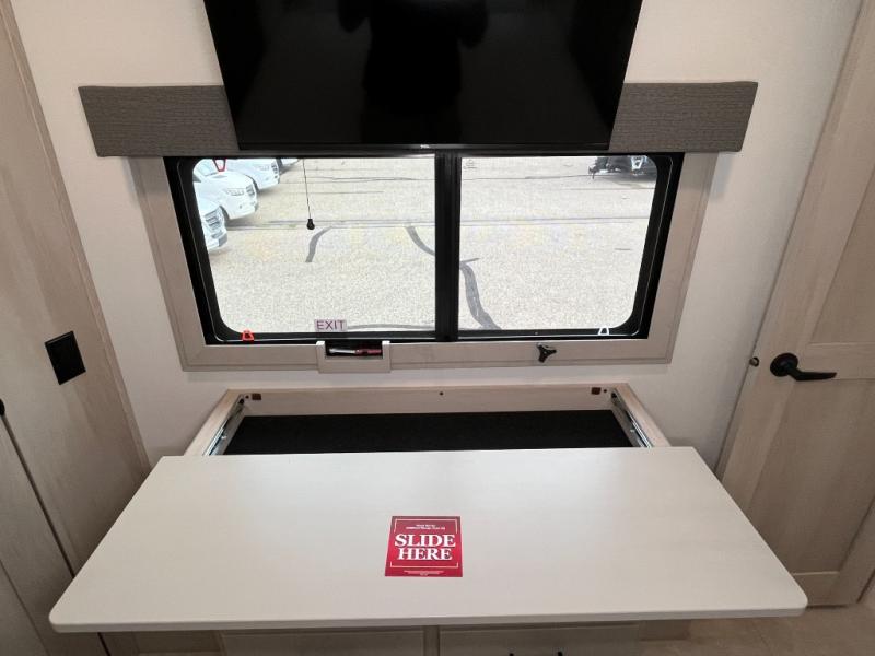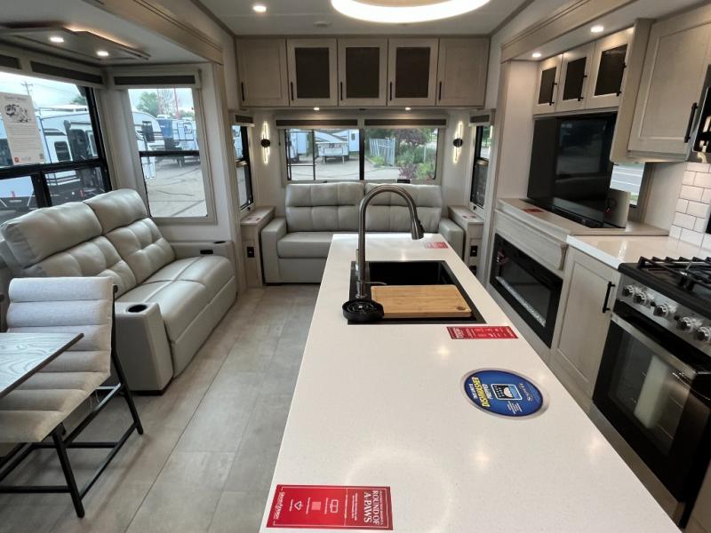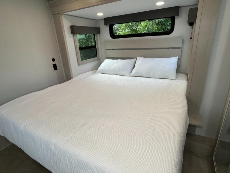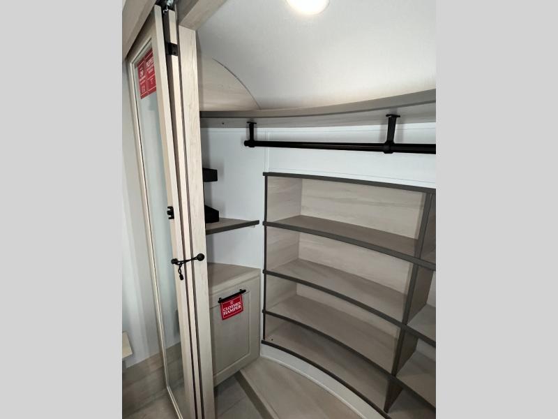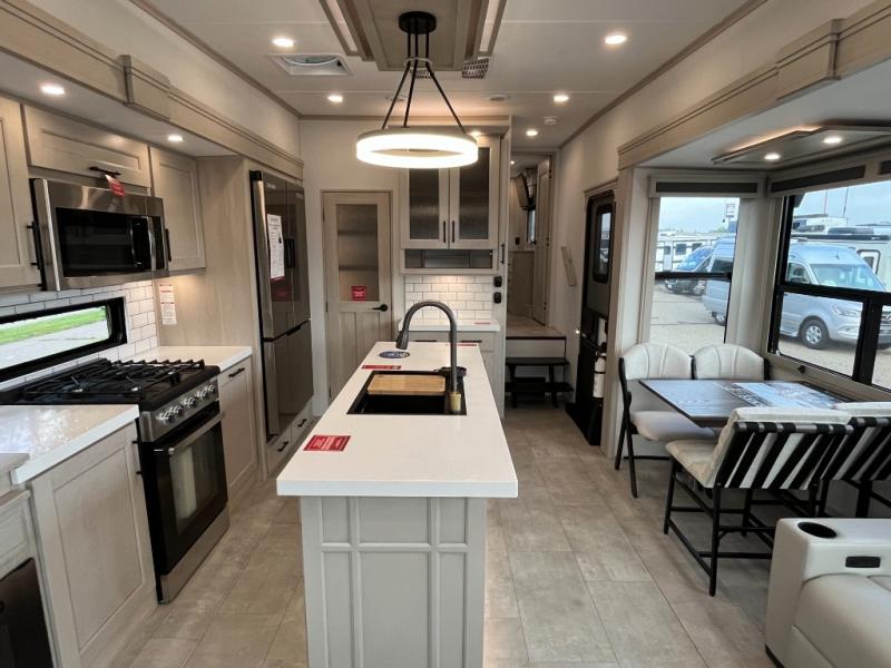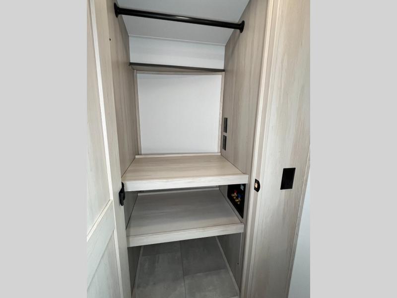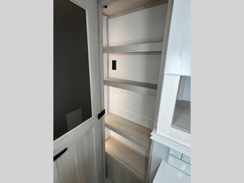 Traveling for long periods at a time is made easy with this gourmet kitchen that can feed your entire group a holiday meal! The professional-grade stainless steel cooktop with a built-in oven, microwave, 12V 20 cu. ft. refrigerator, and a kitchen island offers everything you will need to enjoy cooking for your family and guests. There is abundant storage throughout multiple overhead cabinets, a kitchen pantry and hutch, a bath linen cabinet for your towels, and in the front master bedroom which features a large closet. In the bedroom there is also a queen bed slide for added space to sleep comfortable at night, or you may choose an optional king bed if you enjoy more space. You will also find a closet with washer/dryer prep, large wardrobe, a clothes hamper plus a slide top dresser. Two nice awnings will provide outdoor living space keeping you protected from the sun and rain, and you can add an optional pull-out kitchen to enjoy convenient cooking outdoors as well.