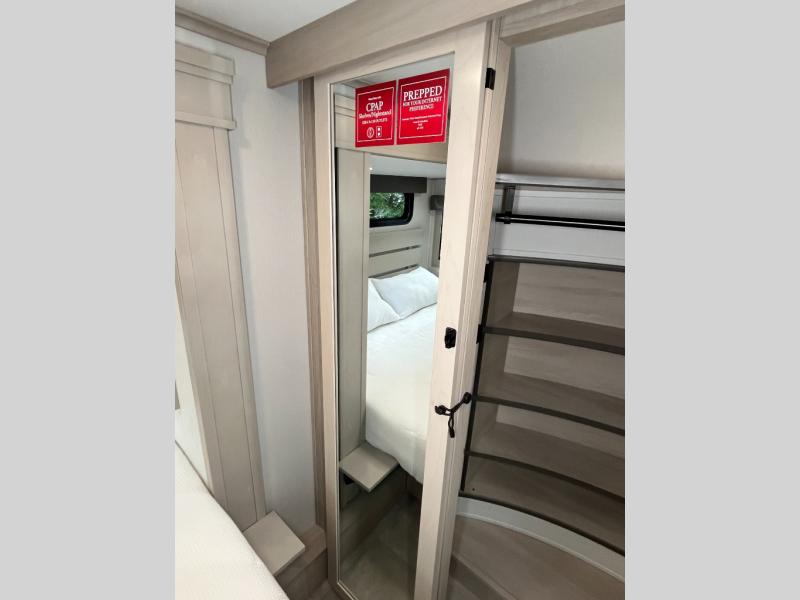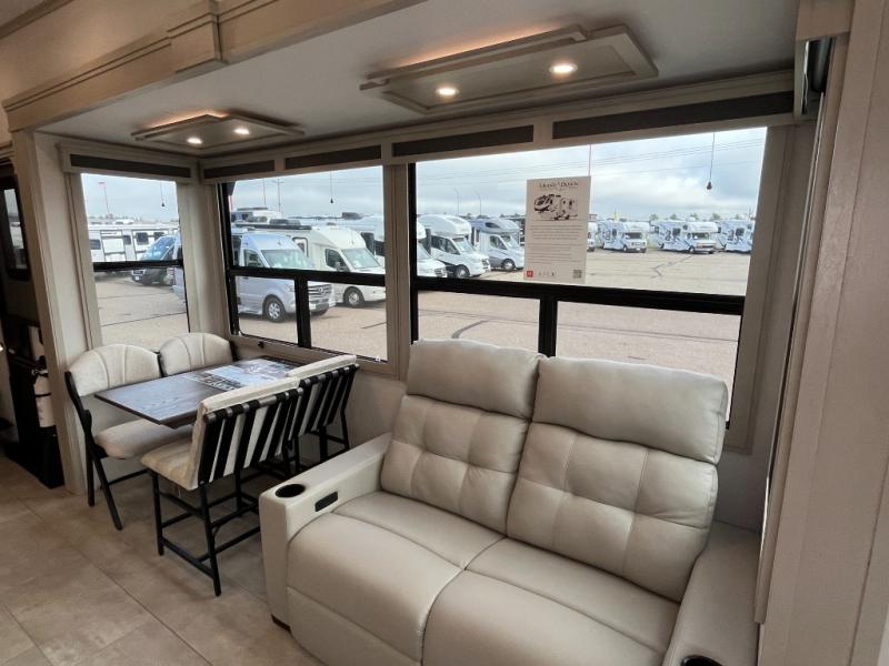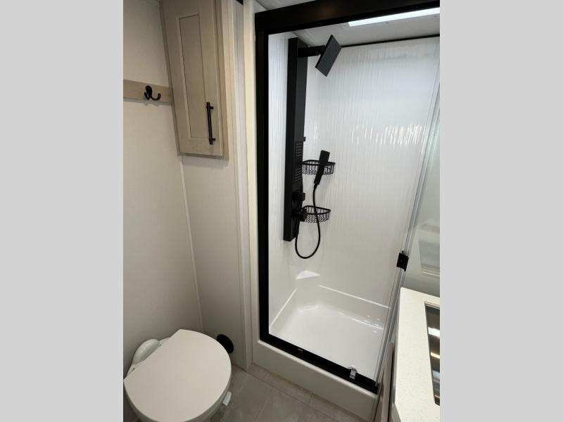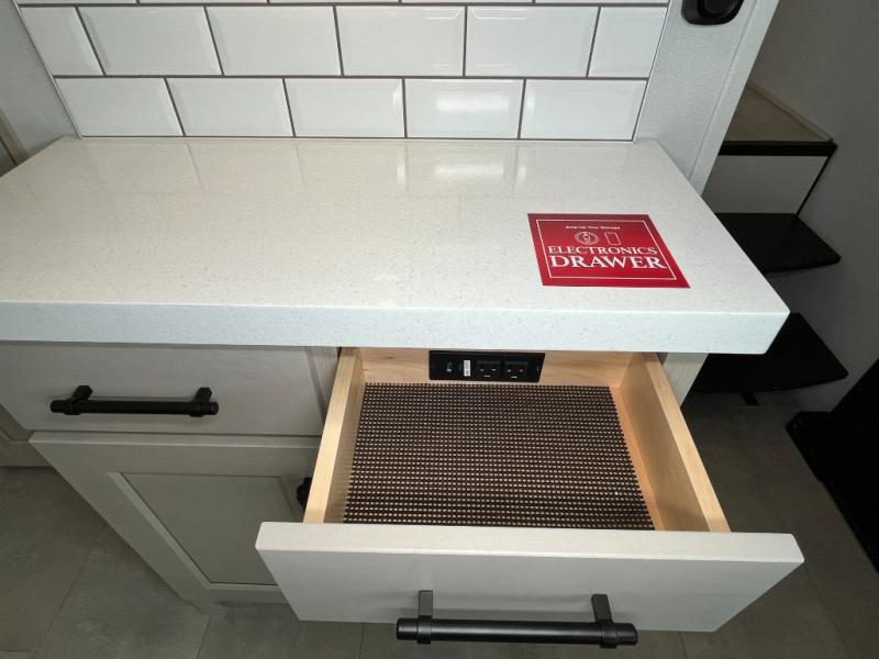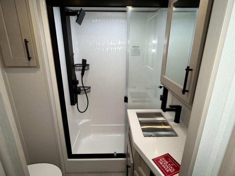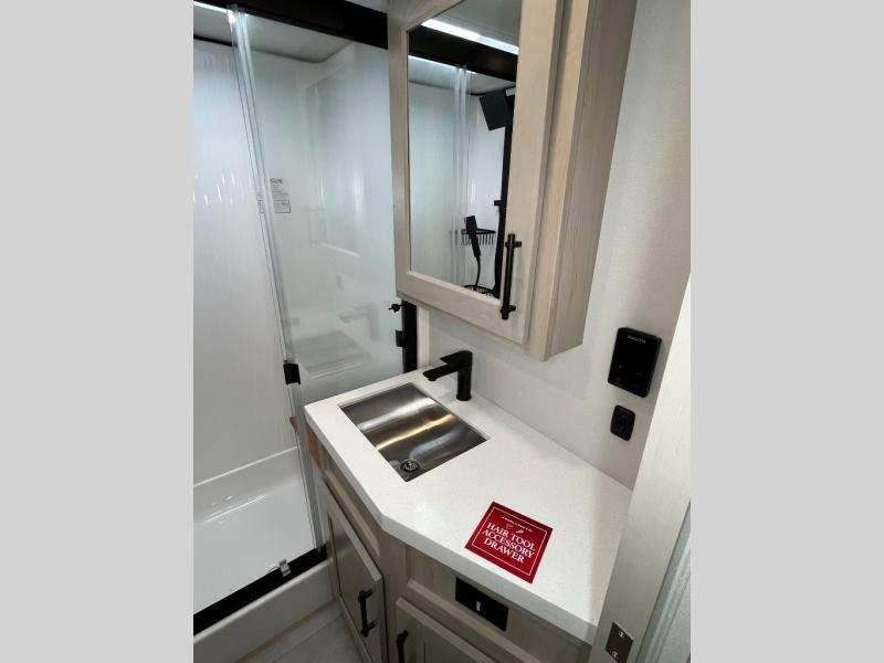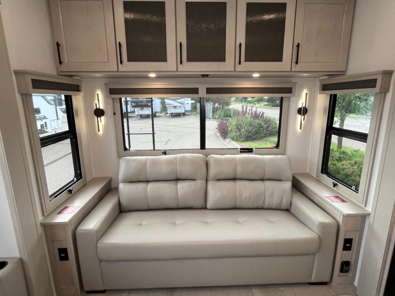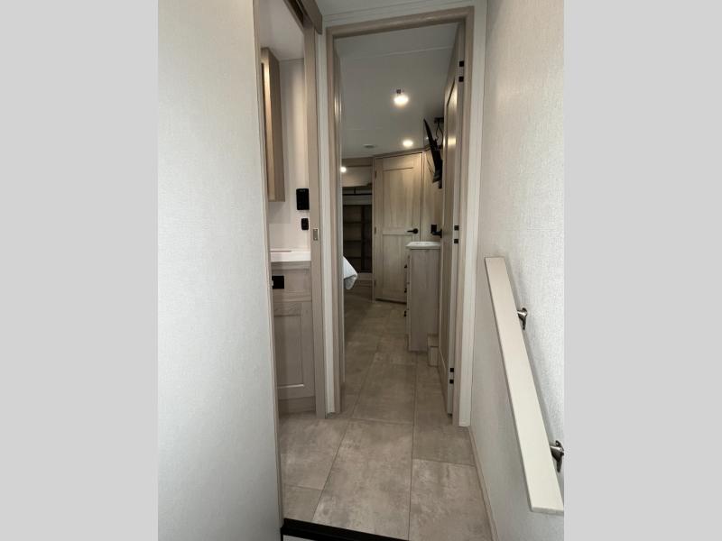 Traveling for long periods at a time is made easy with this gourmet kitchen that can feed your entire group a holiday meal! The professional-grade stainless steel cooktop with a built-in oven, microwave, 12V 20 cu. ft. refrigerator, and a kitchen island offers everything you will need to enjoy cooking for your family and guests. There is abundant storage throughout multiple overhead cabinets, a kitchen pantry and hutch, a bath linen cabinet for your towels, and in the front master bedroom which features a large closet. In the bedroom there is also a queen bed slide for added space to sleep comfortable at night, or you may choose an optional king bed if you enjoy more space. You will also find a closet with washer/dryer prep, large wardrobe, a clothes hamper plus a slide top dresser. Two nice awnings will provide outdoor living space keeping you protected from the sun and rain, and you can add an optional pull-out kitchen to enjoy convenient cooking outdoors as well.