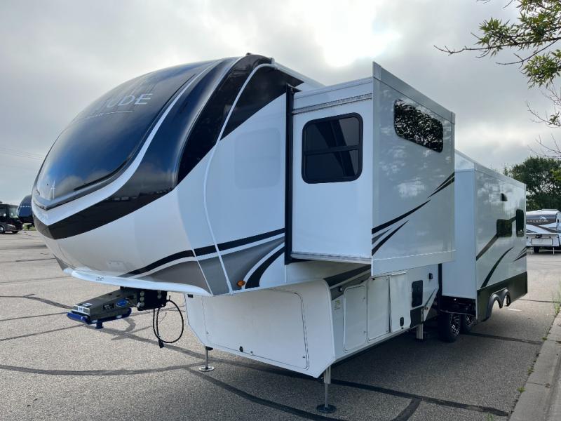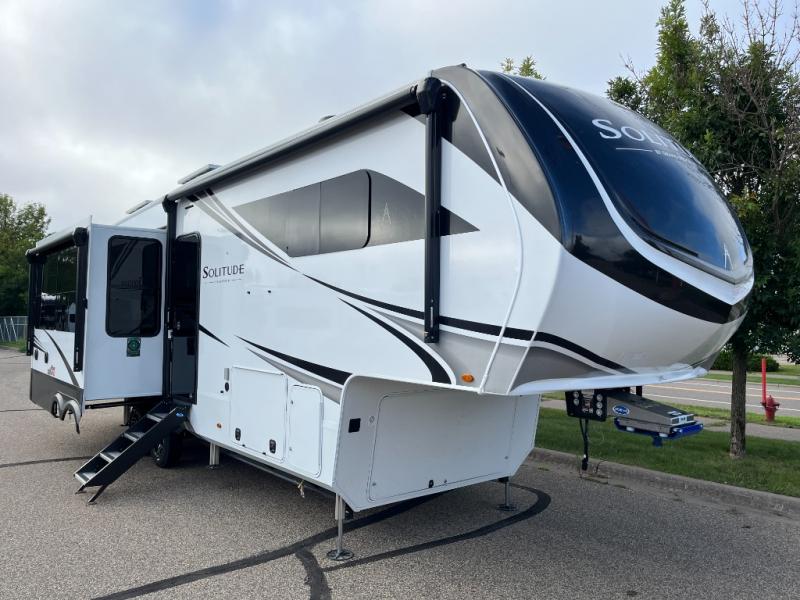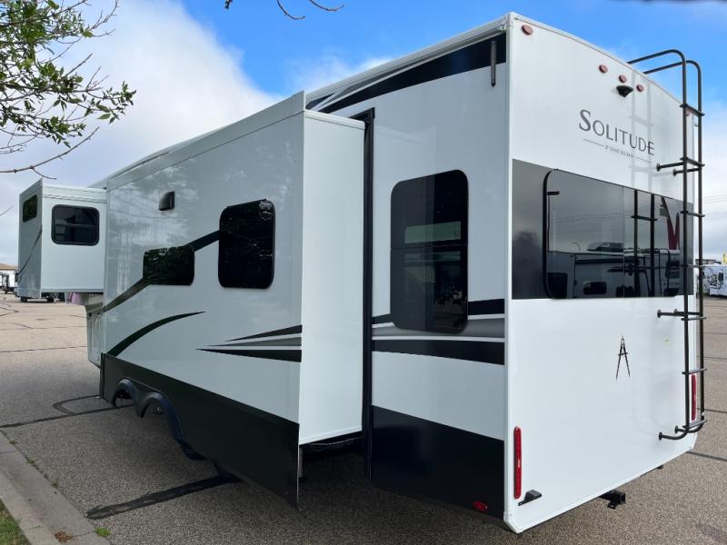 Each Solitude fifth wheel by Grand Design features a 101" wide-body construction, heavy duty 8,000 lb. axles, frameless tinted windows, and high-gloss gel coat sidewalls. You can camp year around thanks to the Weather-Tek Package that includes a 35K BTU high-capacity furnace, an all-in-one enclosed and heated utility center, and a fully enclosed underbelly with heated tanks and storage. Inside, you'll love the premium roller shades, hardwood cabinet doors, solid surface countertops, plus residential finishes throughout to make you truly feel at home. Each model also includes a MORryde CRE3000 suspension system, self adjusting brakes, and a MORryde pin box that will provide smooth towing from home to campground. Affordable luxury is possible with the Solitude fifth wheels; choose yours today!