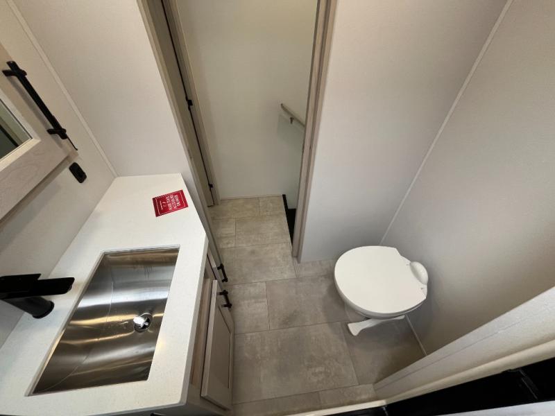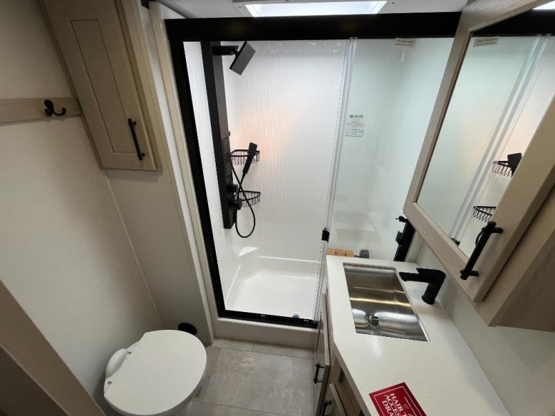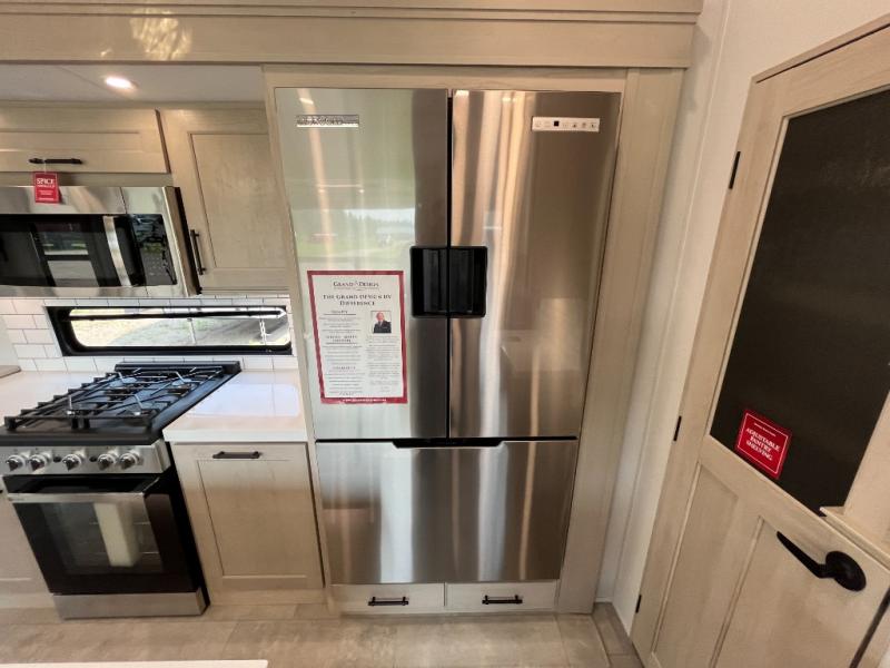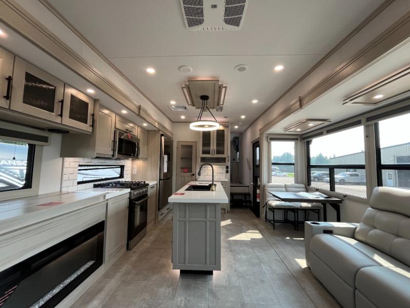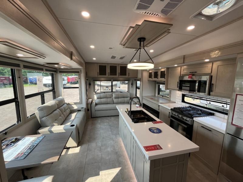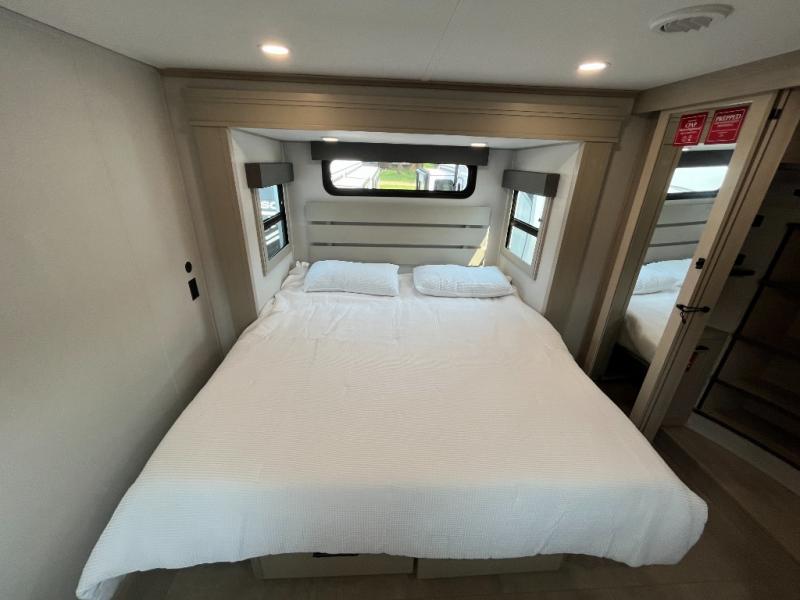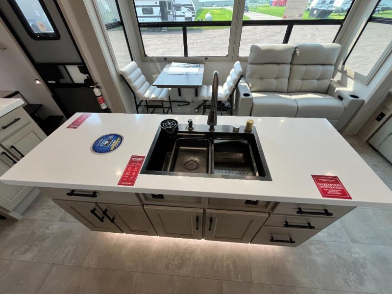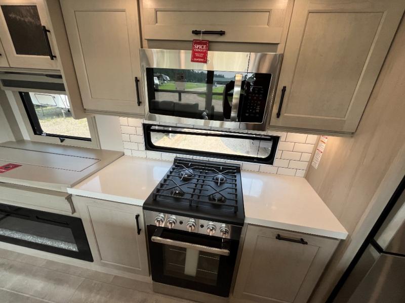 Traveling for long periods at a time is made easy with this gourmet kitchen that can feed your entire group a holiday meal! The professional-grade stainless steel cooktop with a built-in oven, microwave, 12V 20 cu. ft. refrigerator, and a kitchen island offers everything you will need to enjoy cooking for your family and guests. There is abundant storage throughout multiple overhead cabinets, a kitchen pantry and hutch, a bath linen cabinet for your towels, and in the front master bedroom which features a large closet. In the bedroom there is also a queen bed slide for added space to sleep comfortable at night, or you may choose an optional king bed if you enjoy more space. You will also find a closet with washer/dryer prep, large wardrobe, a clothes hamper plus a slide top dresser. Two nice awnings will provide outdoor living space keeping you protected from the sun and rain, and you can add an optional pull-out kitchen to enjoy convenient cooking outdoors as well.