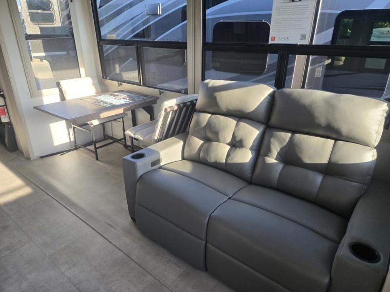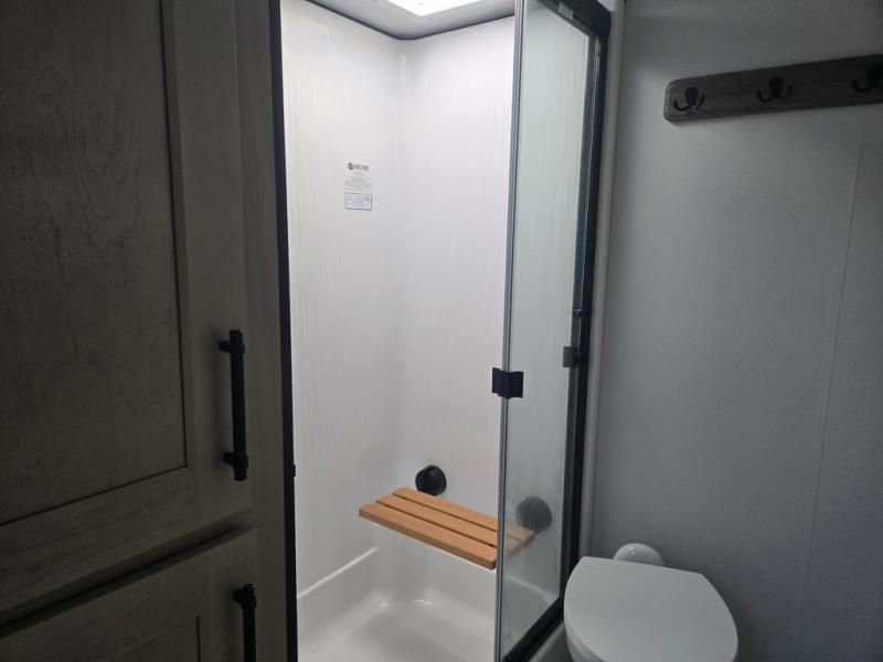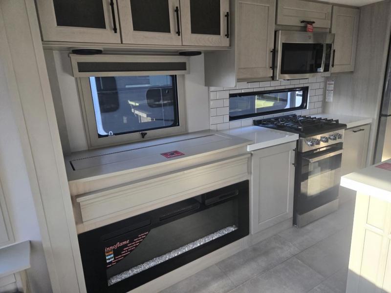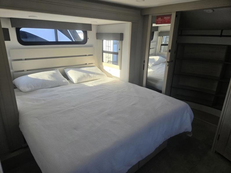 Traveling for long periods at a time is made easy with this gourmet kitchen that can feed your entire group a holiday meal! The professional-grade stainless steel cooktop with a built-in oven, microwave, 12V 20 cu. ft. refrigerator, and a kitchen island offers everything you will need to enjoy cooking for your family and guests. There is abundant storage throughout multiple overhead cabinets, a kitchen pantry and hutch, a bath linen cabinet for your towels, and in the front master bedroom which features a large closet. In the bedroom there is also a queen bed slide for added space to sleep comfortable at night, or you may choose an optional king bed if you enjoy more space. You will also find a closet with washer/dryer prep, large wardrobe, a clothes hamper plus a slide top dresser. Two nice awnings will provide outdoor living space keeping you protected from the sun and rain, and you can add an optional pull-out kitchen to enjoy convenient cooking outdoors as well.