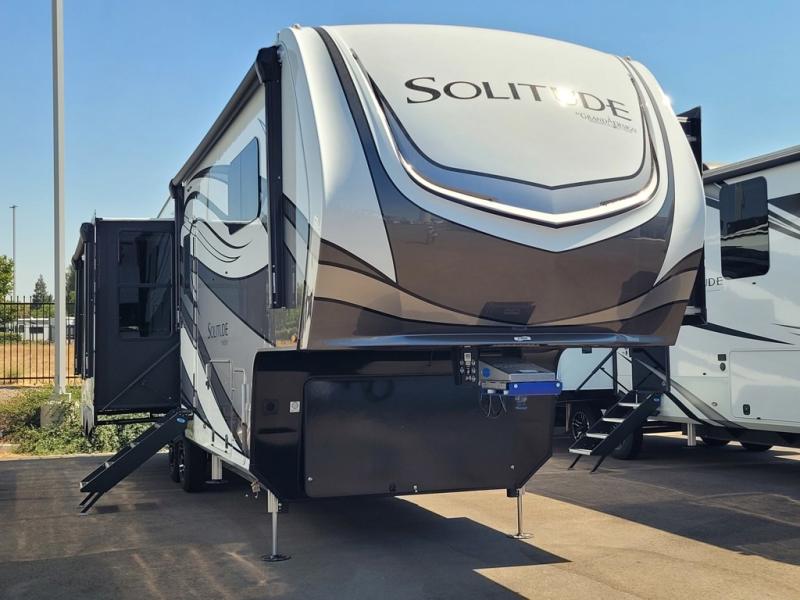 Each Solitude fifth wheel by Grand Design features a 101" wide-body construction, heavy duty 8,000 lb. axles, frameless tinted windows, and high-gloss gel coat sidewalls. You can camp year around thanks to the Weather-Tek Package that includes a 35K BTU high-capacity furnace, an all-in-one enclosed and heated utility center, and a fully enclosed underbelly with heated tanks and storage. Inside, you'll love the premium roller shades, hardwood cabinet doors, solid surface countertops, plus residential finishes throughout to make you truly feel at home. Each model also includes a MORryde CRE3000 suspension system, self adjusting brakes, and a MORryde pin box that will provide smooth towing from home to campground. Affordable luxury is possible with the Solitude fifth wheels; choose yours today!