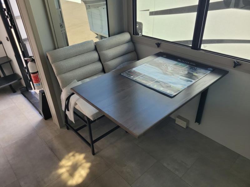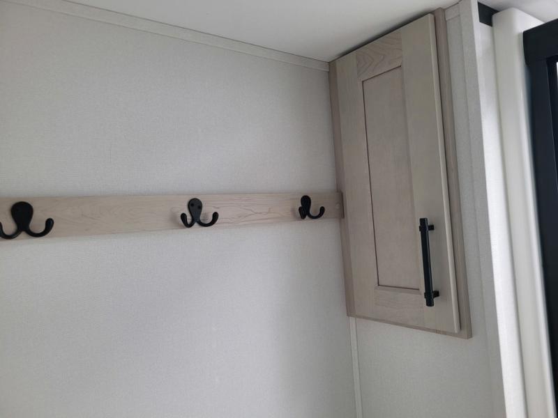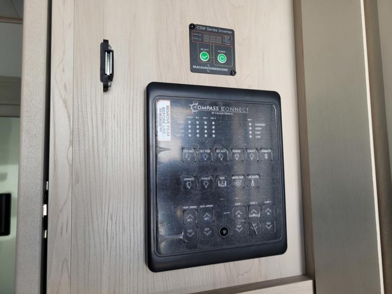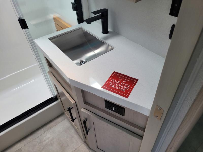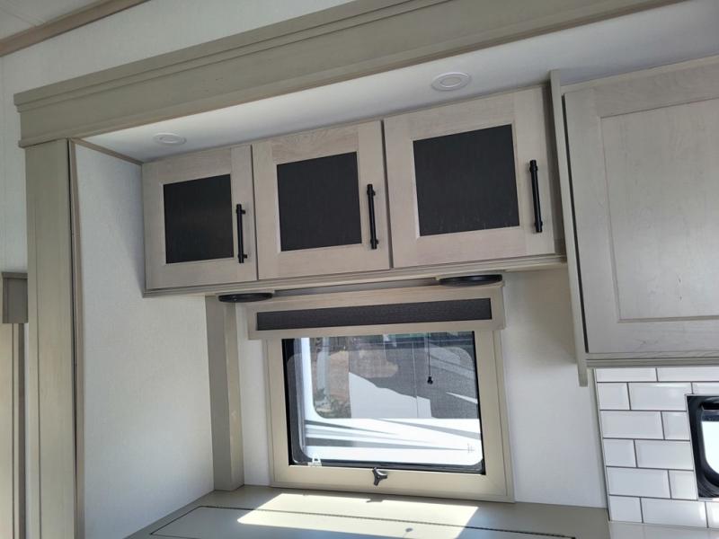 Traveling for long periods at a time is made easy with this gourmet kitchen that can feed your entire group a holiday meal! The professional-grade stainless steel cooktop with a built-in oven, microwave, 12V 20 cu. ft. refrigerator, and a kitchen island offers everything you will need to enjoy cooking for your family and guests. There is abundant storage throughout multiple overhead cabinets, a kitchen pantry and hutch, a bath linen cabinet for your towels, and in the front master bedroom which features a large closet. In the bedroom there is also a queen bed slide for added space to sleep comfortable at night, or you may choose an optional king bed if you enjoy more space. You will also find a closet with washer/dryer prep, large wardrobe, a clothes hamper plus a slide top dresser. Two nice awnings will provide outdoor living space keeping you protected from the sun and rain, and you can add an optional pull-out kitchen to enjoy convenient cooking outdoors as well.