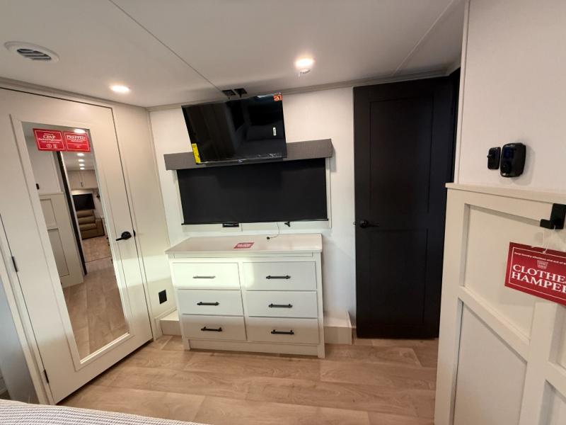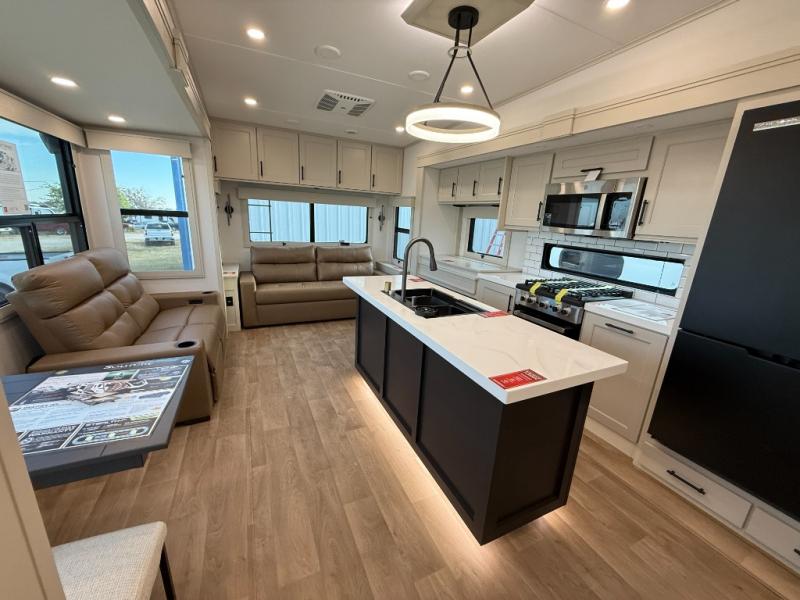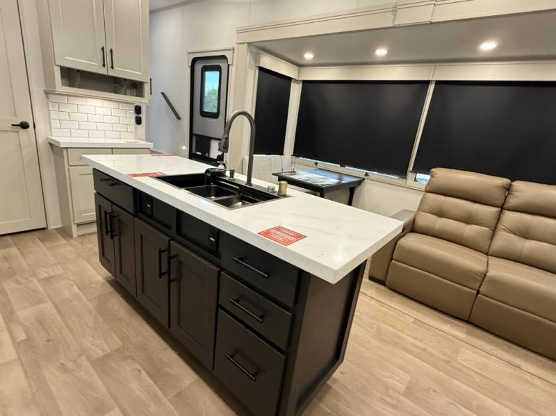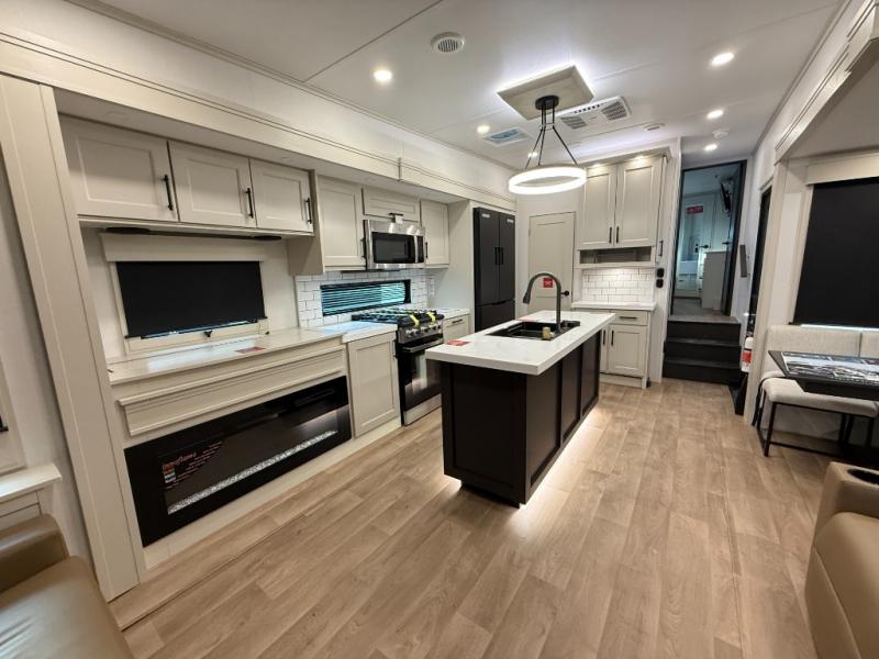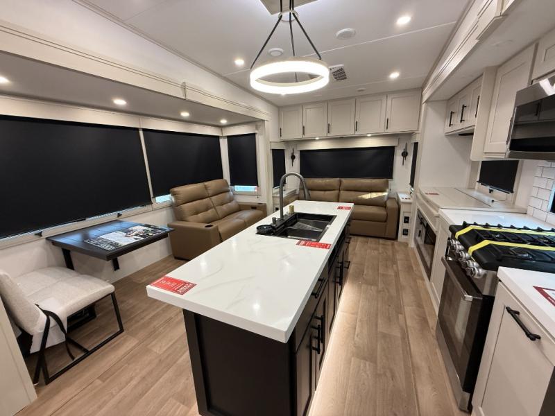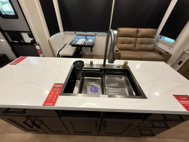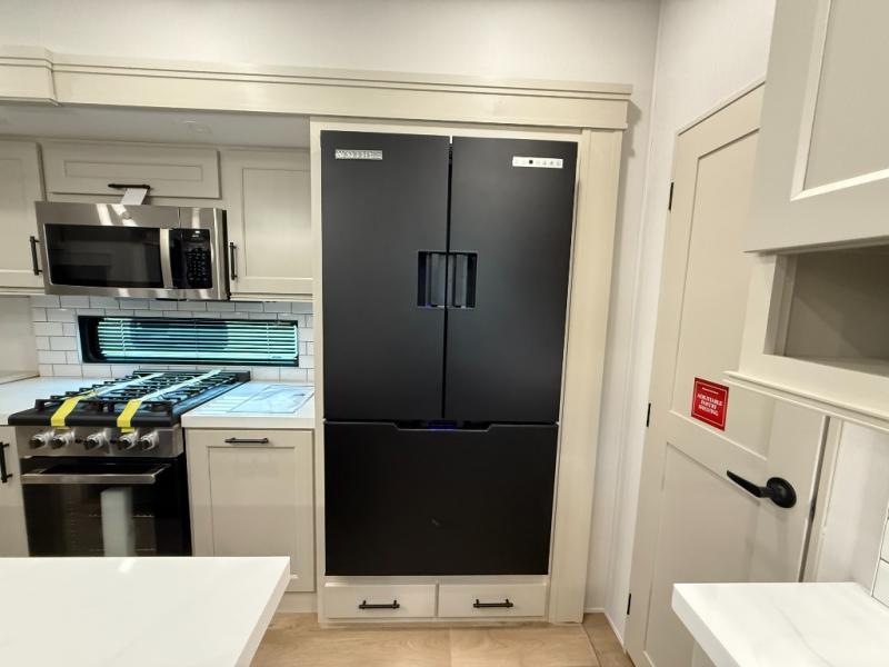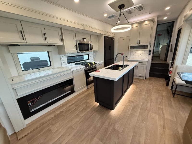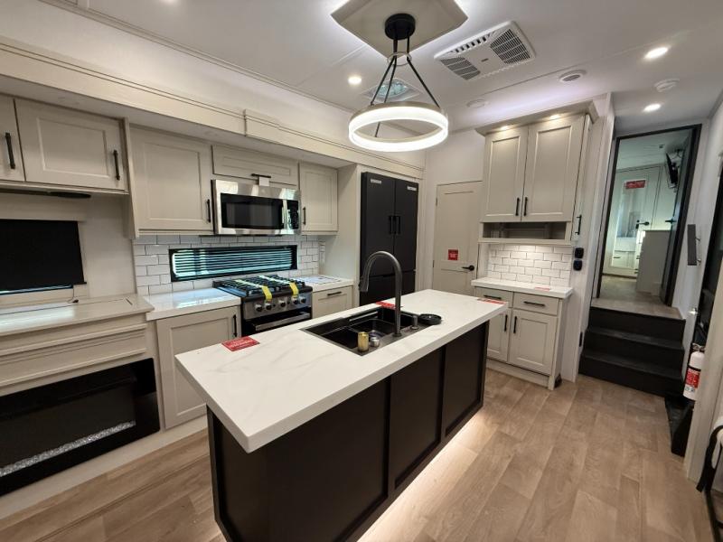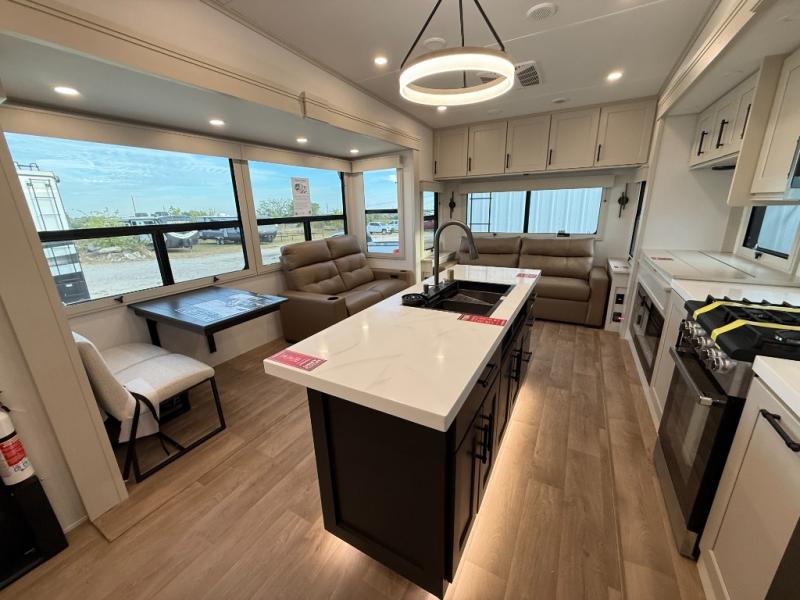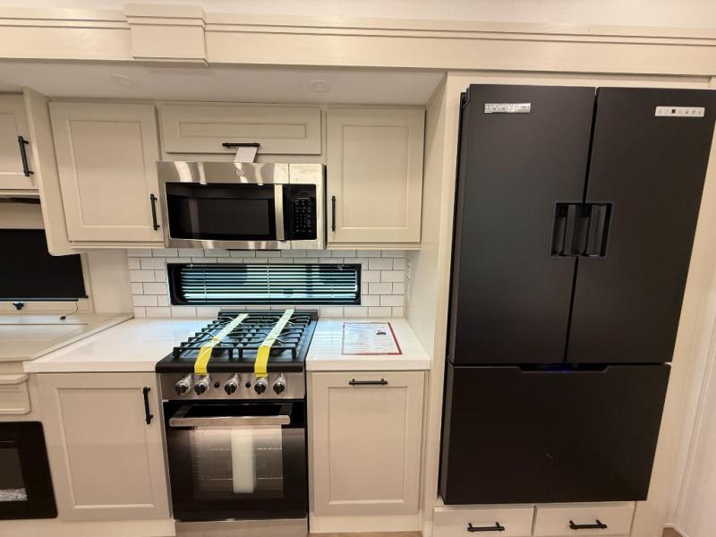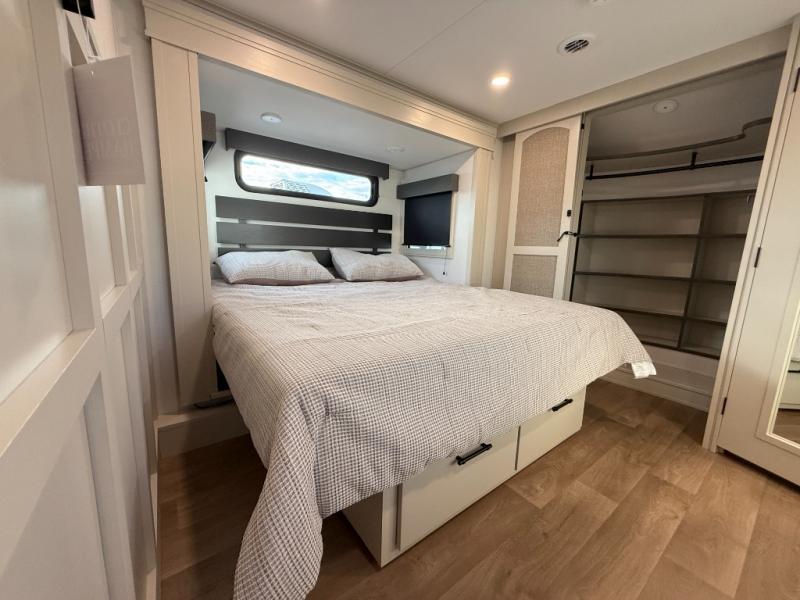 Traveling for long periods at a time is made easy with this gourmet kitchen that can feed your entire group a holiday meal! The professional-grade stainless steel cooktop with a built-in oven, microwave, 12V 20 cu. ft. refrigerator, and a kitchen island offers everything you will need to enjoy cooking for your family and guests. There is abundant storage throughout multiple overhead cabinets, a kitchen pantry and hutch, a bath linen cabinet for your towels, and in the front master bedroom which features a large closet. In the bedroom there is also a queen bed slide for added space to sleep comfortable at night, or you may choose an optional king bed if you enjoy more space. You will also find a closet with washer/dryer prep, large wardrobe, a clothes hamper plus a slide top dresser. Two nice awnings will provide outdoor living space keeping you protected from the sun and rain, and you can add an optional pull-out kitchen to enjoy convenient cooking outdoors as well.