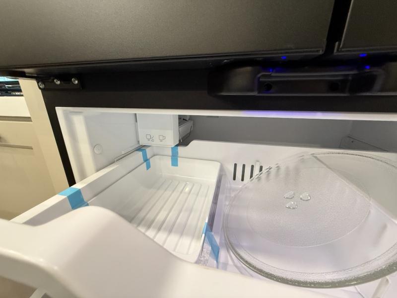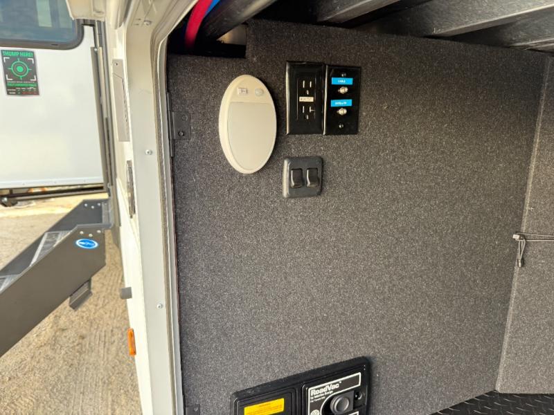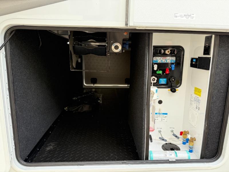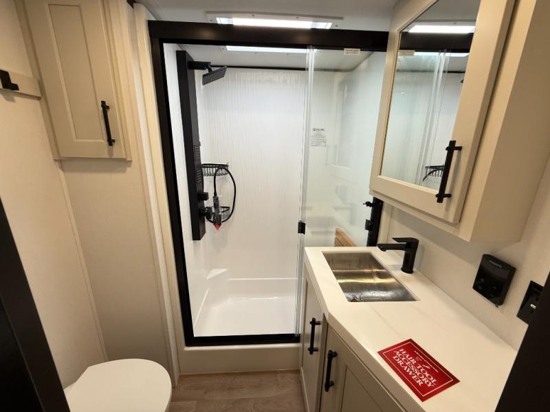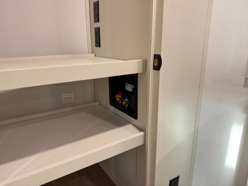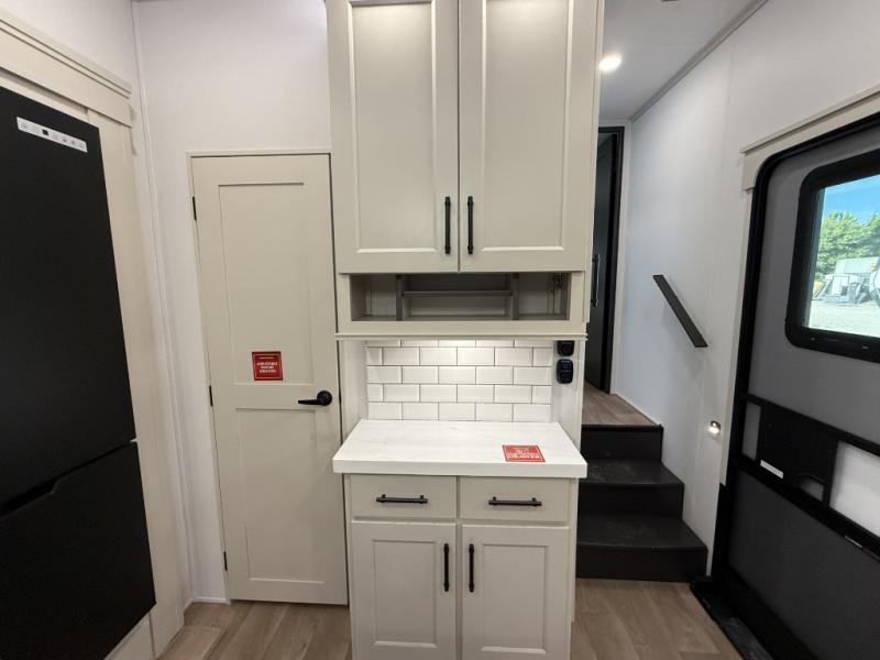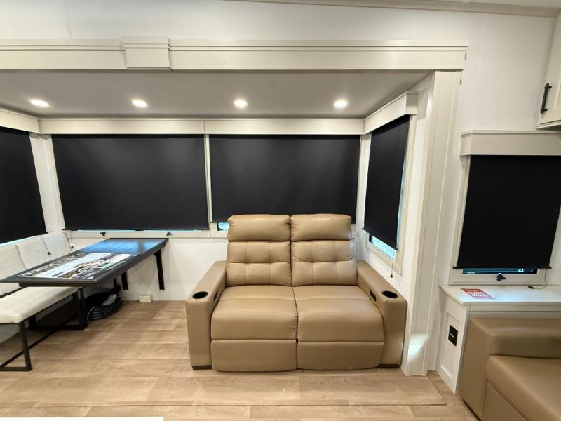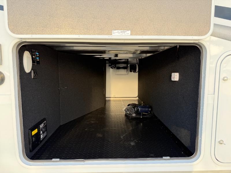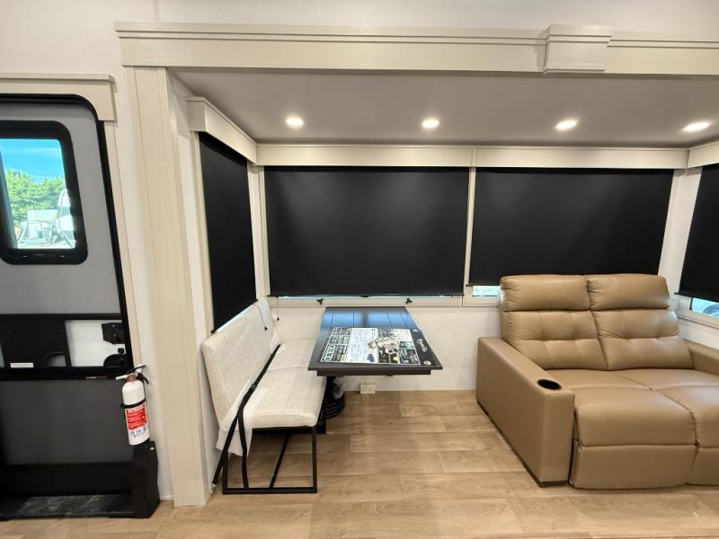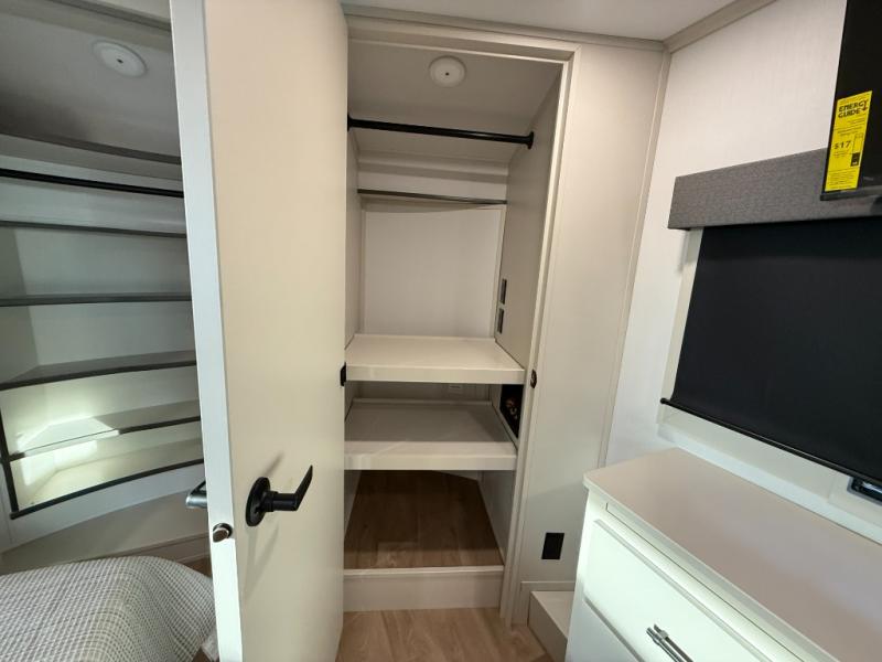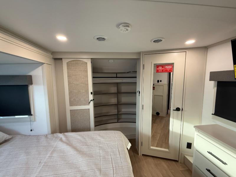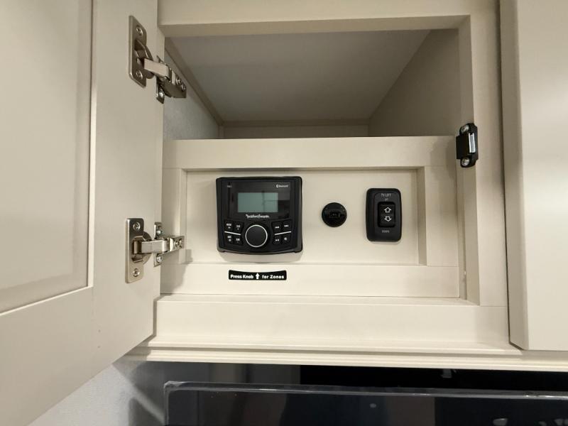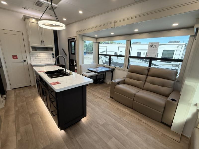 Traveling for long periods at a time is made easy with this gourmet kitchen that can feed your entire group a holiday meal! The professional-grade stainless steel cooktop with a built-in oven, microwave, 12V 20 cu. ft. refrigerator, and a kitchen island offers everything you will need to enjoy cooking for your family and guests. There is abundant storage throughout multiple overhead cabinets, a kitchen pantry and hutch, a bath linen cabinet for your towels, and in the front master bedroom which features a large closet. In the bedroom there is also a queen bed slide for added space to sleep comfortable at night, or you may choose an optional king bed if you enjoy more space. You will also find a closet with washer/dryer prep, large wardrobe, a clothes hamper plus a slide top dresser. Two nice awnings will provide outdoor living space keeping you protected from the sun and rain, and you can add an optional pull-out kitchen to enjoy convenient cooking outdoors as well.