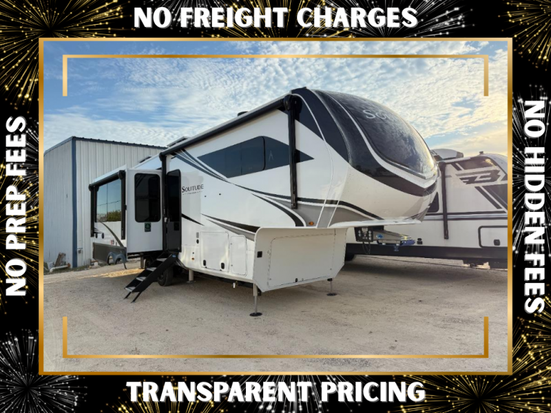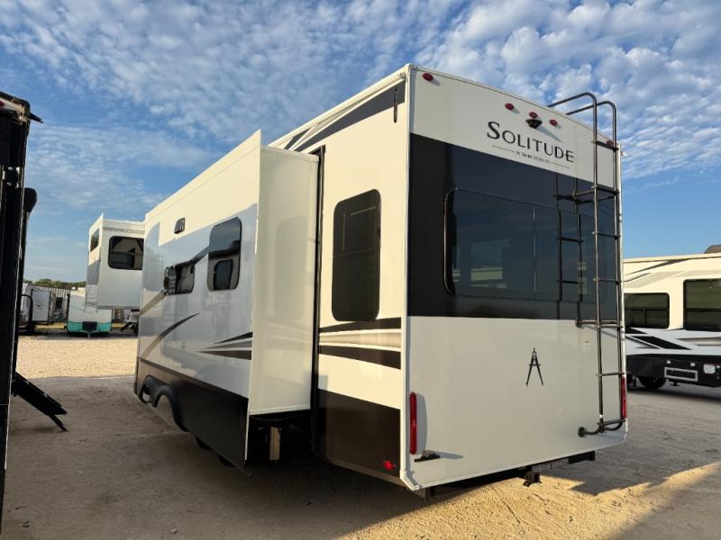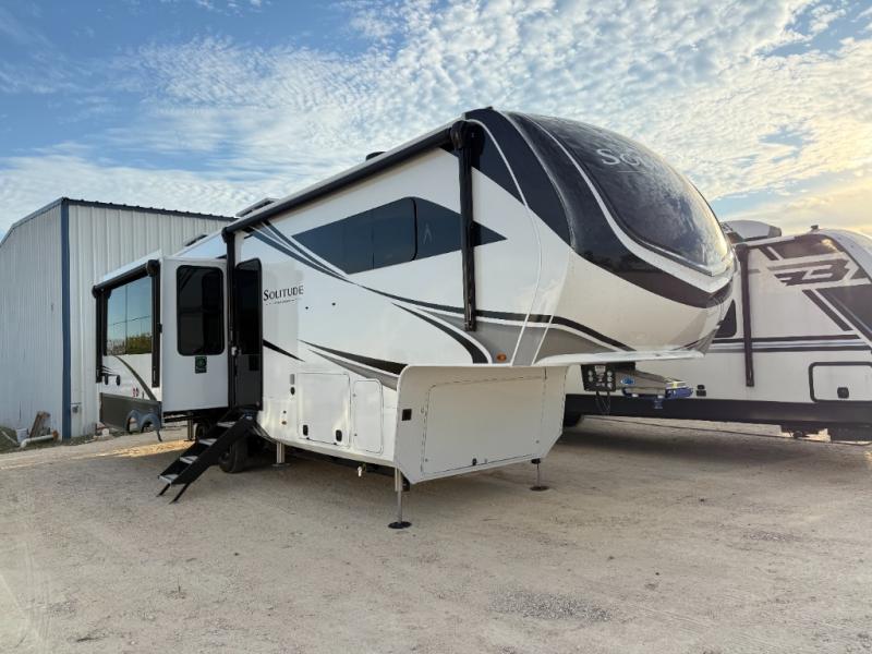 Each Solitude fifth wheel by Grand Design features a 101" wide-body construction, heavy duty 8,000 lb. axles, frameless tinted windows, and high-gloss gel coat sidewalls. You can camp year around thanks to the Weather-Tek Package that includes a 35K BTU high-capacity furnace, an all-in-one enclosed and heated utility center, and a fully enclosed underbelly with heated tanks and storage. Inside, you'll love the premium roller shades, hardwood cabinet doors, solid surface countertops, plus residential finishes throughout to make you truly feel at home. Each model also includes a MORryde CRE3000 suspension system, self adjusting brakes, and a MORryde pin box that will provide smooth towing from home to campground. Affordable luxury is possible with the Solitude fifth wheels; choose yours today!