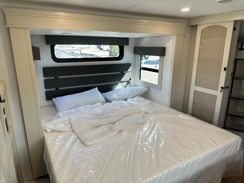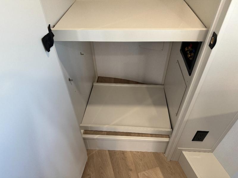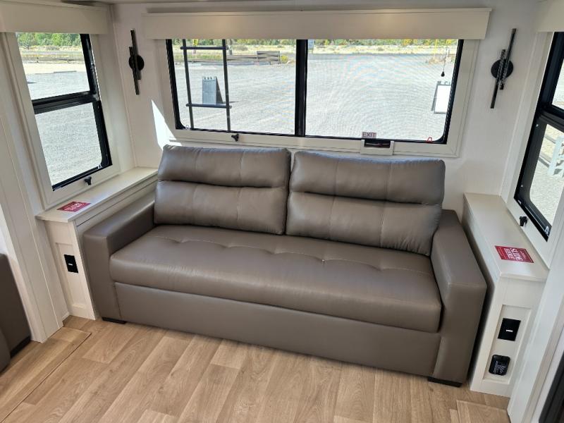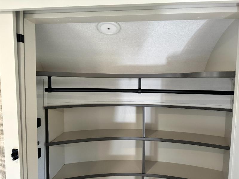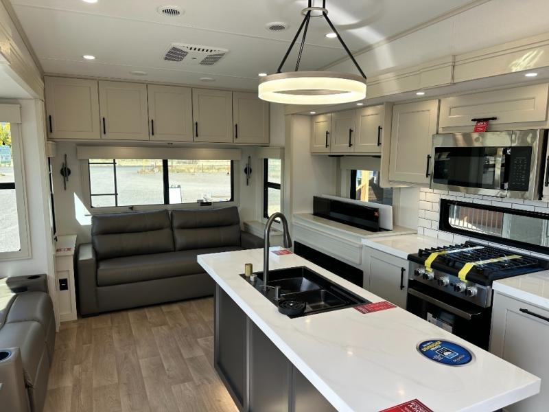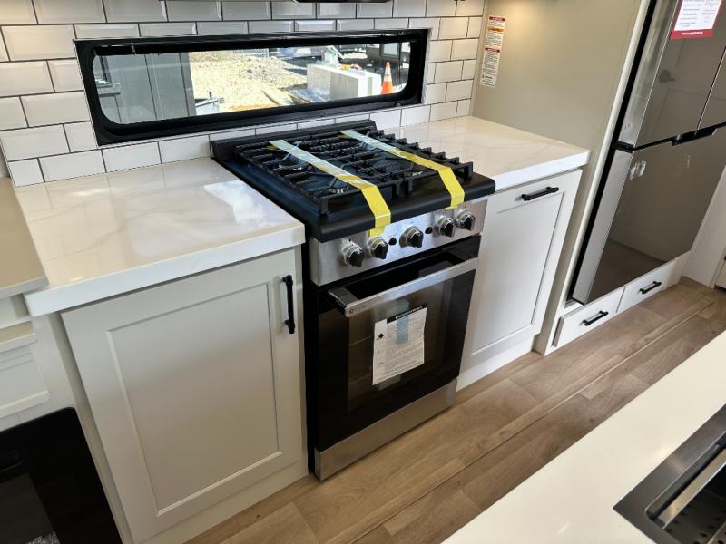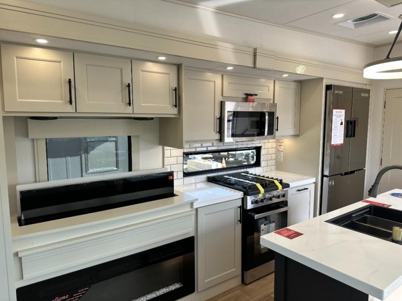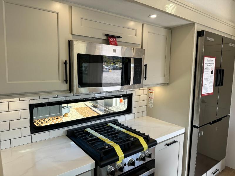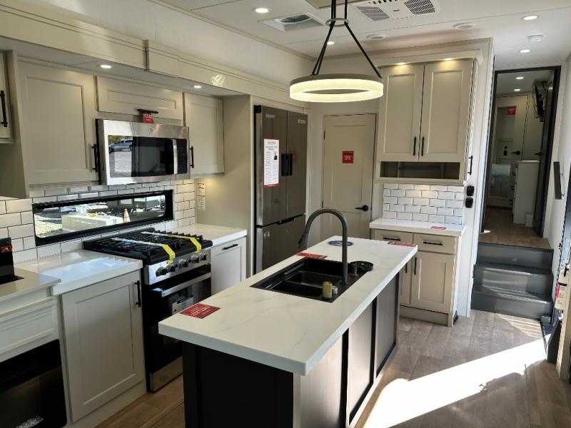 Traveling for long periods at a time is made easy with this gourmet kitchen that can feed your entire group a holiday meal! The professional-grade stainless steel cooktop with a built-in oven, microwave, 12V 20 cu. ft. refrigerator, and a kitchen island offers everything you will need to enjoy cooking for your family and guests. There is abundant storage throughout multiple overhead cabinets, a kitchen pantry and hutch, a bath linen cabinet for your towels, and in the front master bedroom which features a large closet. In the bedroom there is also a queen bed slide for added space to sleep comfortable at night, or you may choose an optional king bed if you enjoy more space. You will also find a closet with washer/dryer prep, large wardrobe, a clothes hamper plus a slide top dresser. Two nice awnings will provide outdoor living space keeping you protected from the sun and rain, and you can add an optional pull-out kitchen to enjoy convenient cooking outdoors as well.