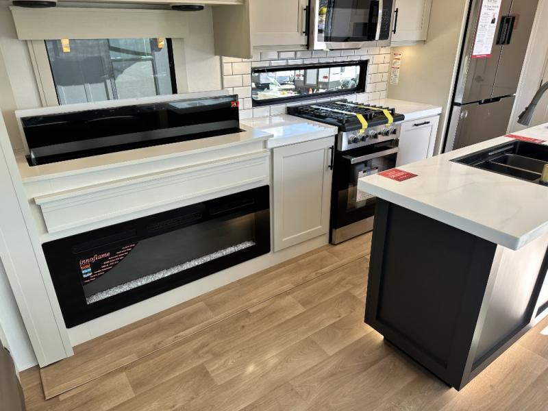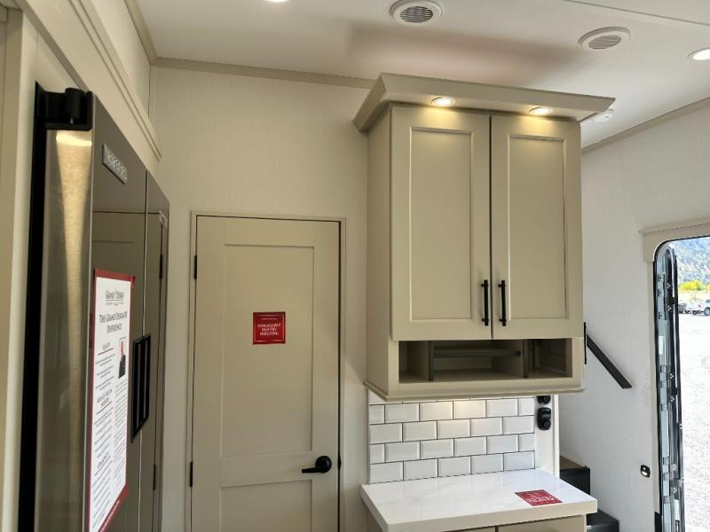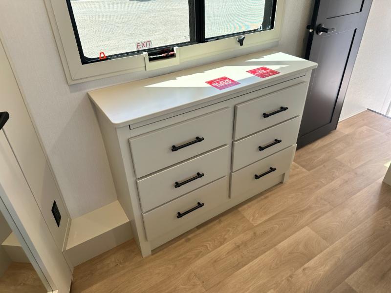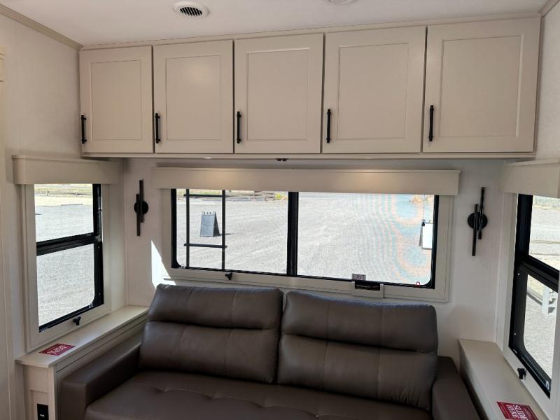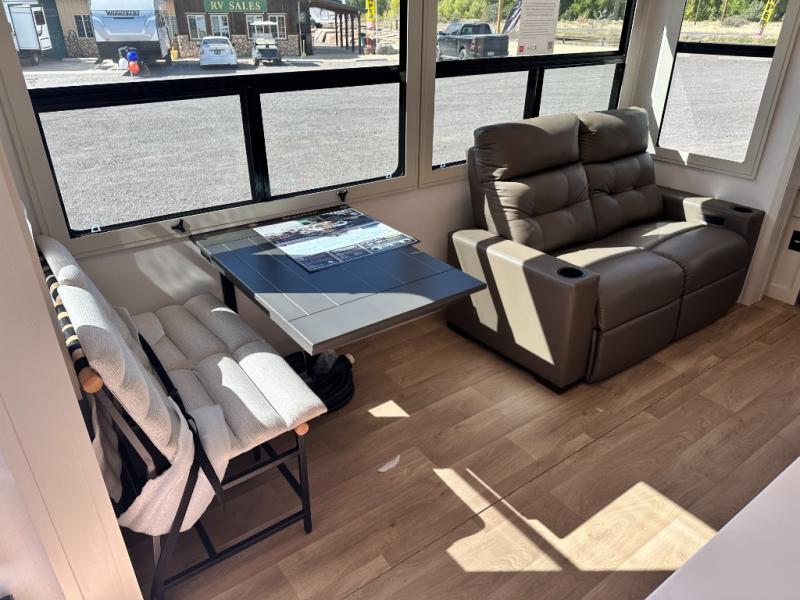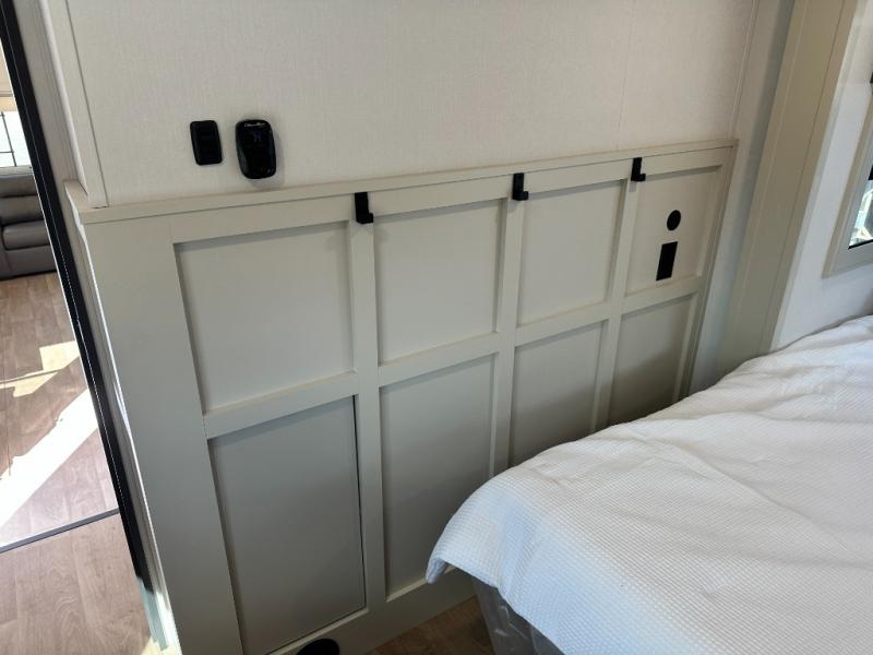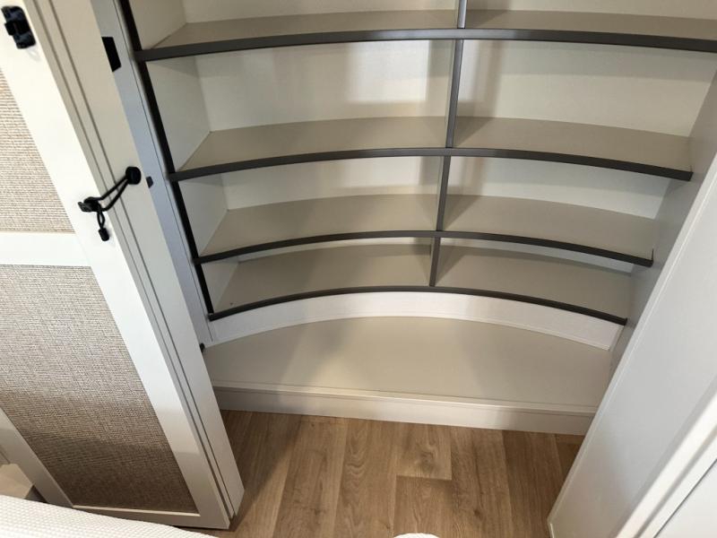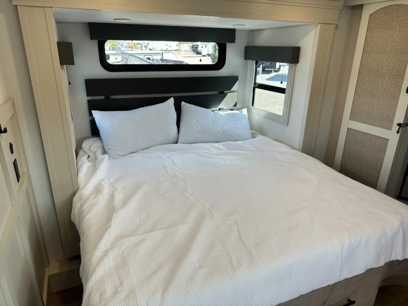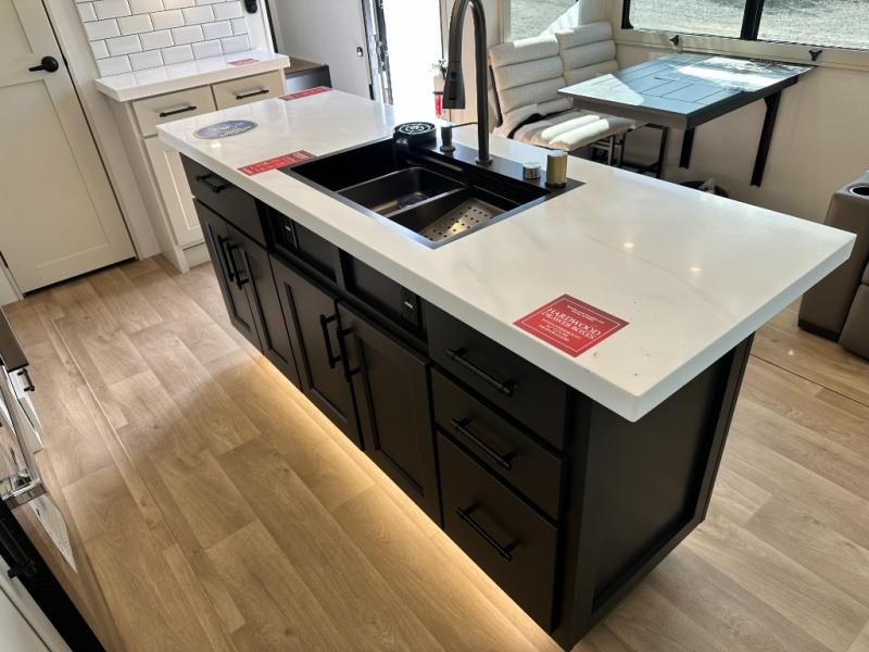Traveling for long periods at a time is made easy with this gourmet kitchen that can feed your entire group a holiday meal! The professional-grade stainless steel cooktop with a built-in oven, microwave, 12V 20 cu. ft. refrigerator, and a kitchen island offers everything you will need to enjoy cooking for your family and guests. There is abundant storage throughout multiple overhead cabinets, a kitchen pantry and hutch, a bath linen cabinet for your towels, and in the front master bedroom which features a large closet. In the bedroom there is also a queen bed slide for added space to sleep comfortable at night, or you may choose an optional king bed if you enjoy more space. You will also find a closet with washer/dryer prep, large wardrobe, a clothes hamper plus a slide top dresser. Two nice awnings will provide outdoor living space keeping you protected from the sun and rain, and you can add an optional pull-out kitchen to enjoy convenient cooking outdoors as well.