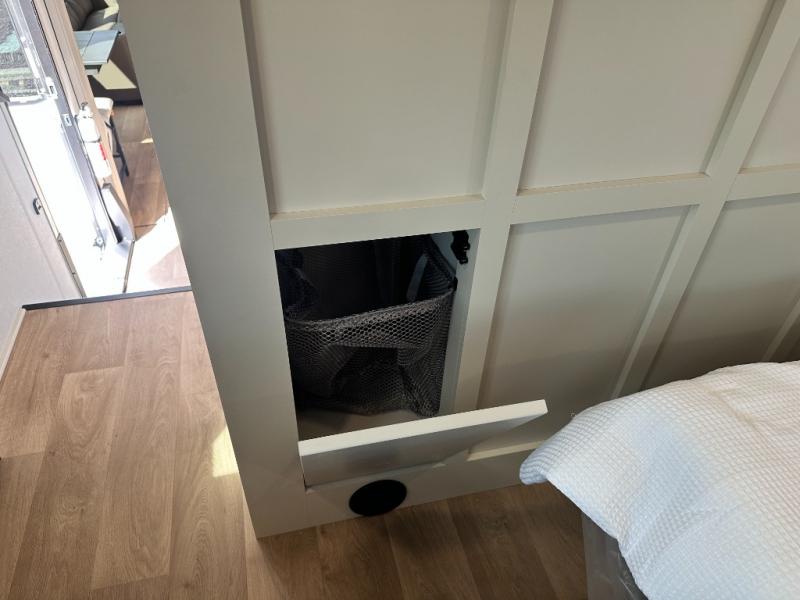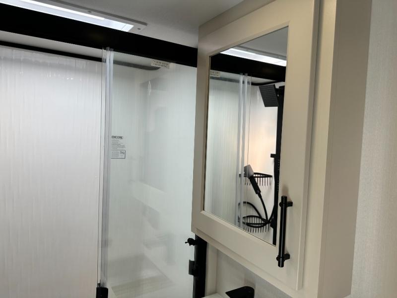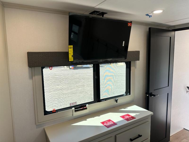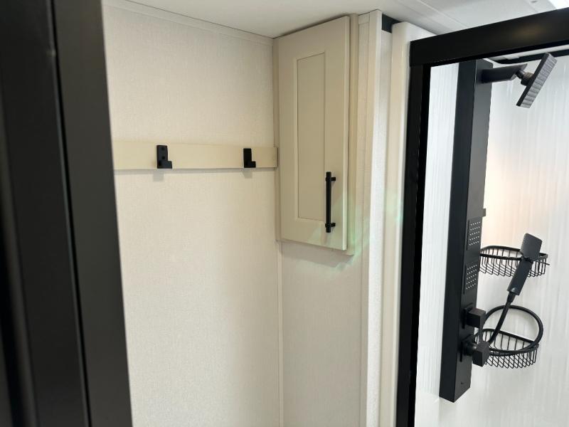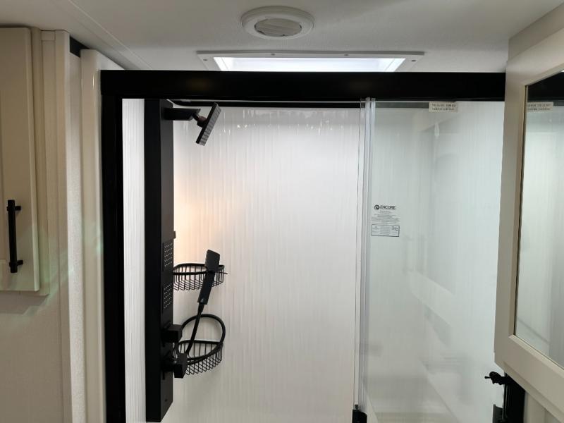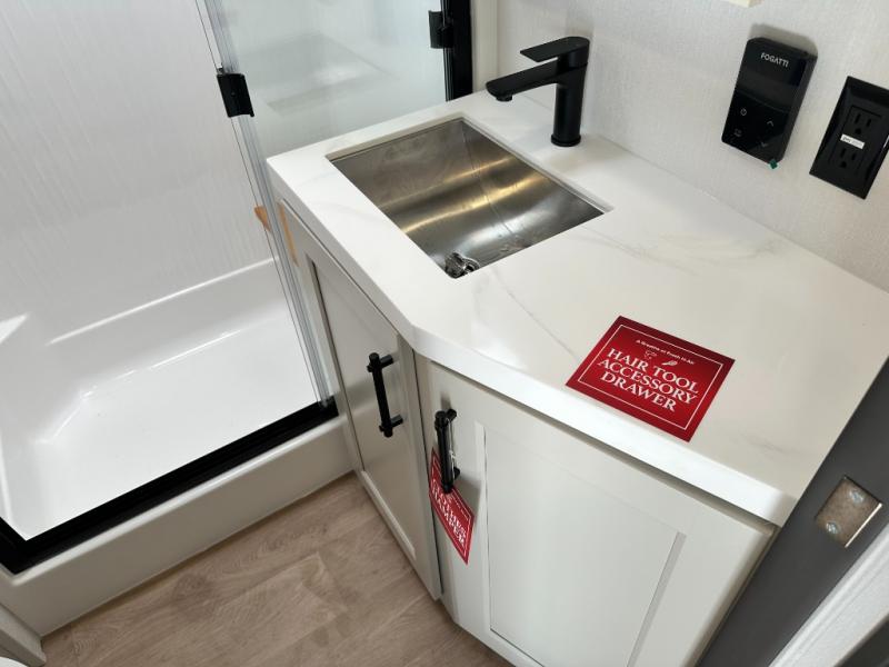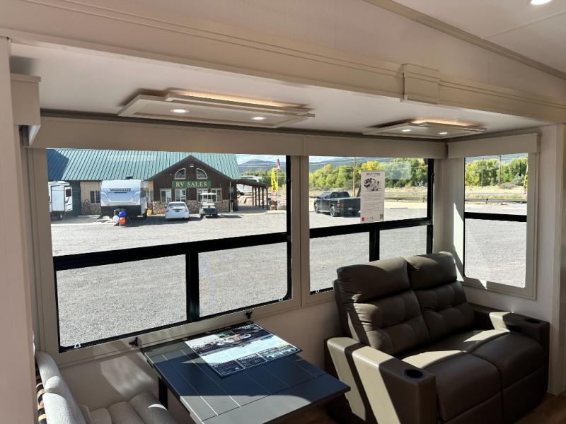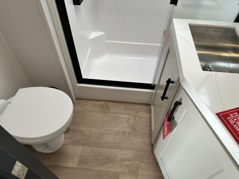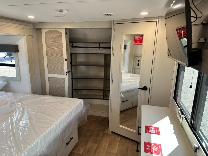 Traveling for long periods at a time is made easy with this gourmet kitchen that can feed your entire group a holiday meal! The professional-grade stainless steel cooktop with a built-in oven, microwave, 12V 20 cu. ft. refrigerator, and a kitchen island offers everything you will need to enjoy cooking for your family and guests. There is abundant storage throughout multiple overhead cabinets, a kitchen pantry and hutch, a bath linen cabinet for your towels, and in the front master bedroom which features a large closet. In the bedroom there is also a queen bed slide for added space to sleep comfortable at night, or you may choose an optional king bed if you enjoy more space. You will also find a closet with washer/dryer prep, large wardrobe, a clothes hamper plus a slide top dresser. Two nice awnings will provide outdoor living space keeping you protected from the sun and rain, and you can add an optional pull-out kitchen to enjoy convenient cooking outdoors as well.