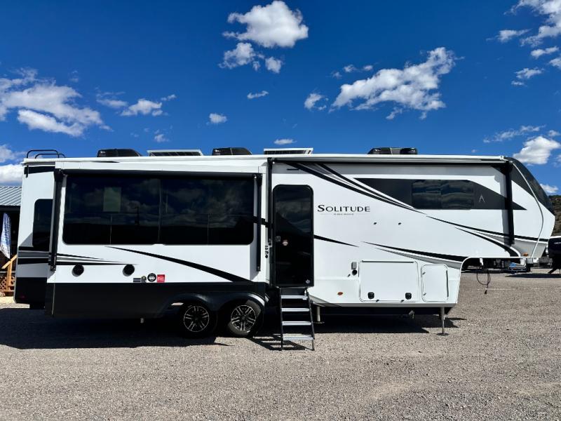 Each Solitude fifth wheel by Grand Design features a 101" wide-body construction, heavy duty 8,000 lb. axles, frameless tinted windows, and high-gloss gel coat sidewalls. You can camp year around thanks to the Weather-Tek Package that includes a 35K BTU high-capacity furnace, an all-in-one enclosed and heated utility center, and a fully enclosed underbelly with heated tanks and storage. Inside, you'll love the premium roller shades, hardwood cabinet doors, solid surface countertops, plus residential finishes throughout to make you truly feel at home. Each model also includes a MORryde CRE3000 suspension system, self adjusting brakes, and a MORryde pin box that will provide smooth towing from home to campground. Affordable luxury is possible with the Solitude fifth wheels; choose yours today!